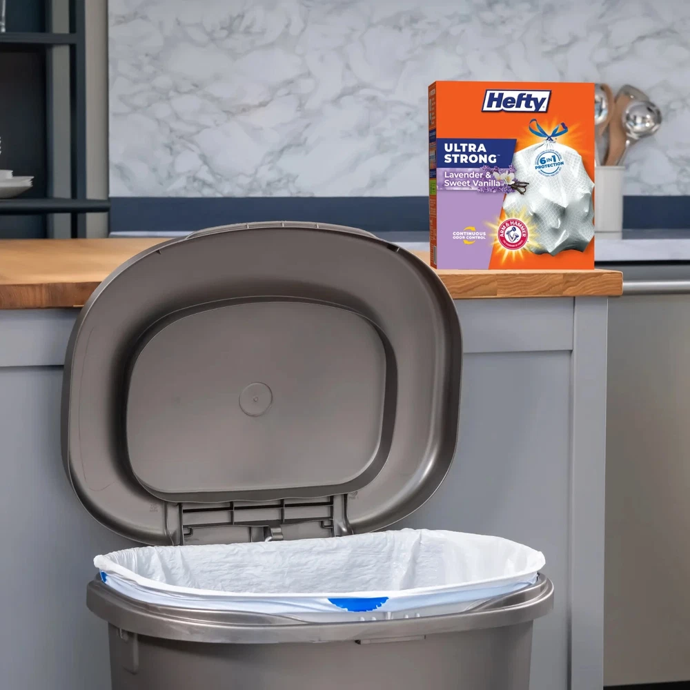Ultra Strong Kitchen Trash Bags,13 Gallon with Lavender&Vanilla Scent,80 Count Description Trust Hefty Ultra Strong Tall Kitchen Trash Bags to keep your kitchen waste contained—all the way from can to curb. Thanks to Triple-Action Technology, these tough Hefty kitchen trash bags resist punctures, leaks, and tears, providing the highest protection available in flexible garbage bags. That stretchy strength means you don't have to worry about unexpected bag breakage and inconvenient messes. Don’t be afraid to use these kitchen trash bags for tougher jobs, such as garage, basement and construction cleanup. A break-resistant grip drawstring makes it easy to close the bag and cart it away without incident. As a bonus, these scented trash bags include a patented Arm & Hammer odor neutralizer and Lavender & Sweet Vanilla scent to keep unpleasant smells at bay. All Hefty trash bags are backed by a 100% satisfaction guarantee. Item Specification 13 GALLON GARBAGE BAGS—This package contains 80 Hefty Ultra Strong black, Lavender & Sweet Vanilla scented, 13 gallon kitchen trash bags TOUGHNESS YOU CAN TRUST—Hefty’s strongest tall kitchen trash bags deliver toughness you can trust with a secure, break-resistant drawstring & superior durability ARM & HAMMER ODOR NEUTRALIZER—Lavender & Sweet Vanilla scented patented odor neutralizer harnesses the power of Arm & Hammer to fight nasty odors to keep your kitchen smelling fresh TRIPLE-ACTION TECHNOLOGY—These kitchen garbage bags stretch & expand to accommodate oversized loads without punctures, leaks or tears 100% SATISFACTION GUARANTEE—We want you to be happy with your purchase! If you have any issues with