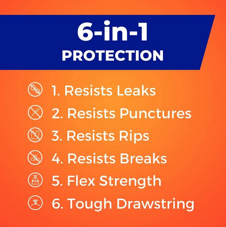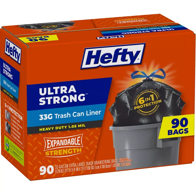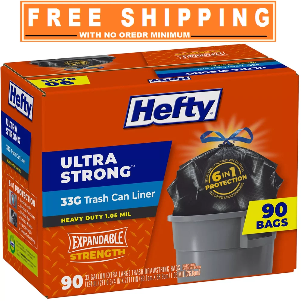 Hefty Ultra Strong Drawstring Trash Bags, Unscented 33 gal., 90 ct. Description : Trust Hefty Ultra Strong 33-Gallon Drawstring Trash Bags to keep your waste contained—all the way from can to curb. 6-in-1 protection provides flex strength, secure-fit closure, odor control, and resists leaks, punctures and rips. That stretchy strength means you don't have to worry about unexpected bag breakage and inconvenient messes. Don’t be afraid to use these large black trash bags for tougher jobs, such as lining your trash can or collecting trash from throughout the house. They’re made with heavy duty 1.05 mil thickness and expandable strength, so they can handle your heavier and messier cleanup projects. A break-resistant grip drawstring makes it easy to close the bag and cart it away without incident. Features : Contains 90 ultra-strong 33-gallon trash can liners Heavy-duty trash bag for big cleanup jobs 1.05 mil construction ideal for even heavy garbage loads Triple Action Technology allows the bag to stretch to prevent leaks and tears 6-in-1 protection provides flex strength, secure-fit closure, odor control, and resists leaks, punctures and rips We try our very best to make sure every customer is completely satisfied. If there's a problem, message us! We're happy to help Visit Our store to get great Discounts ,looking forward for your positive response !