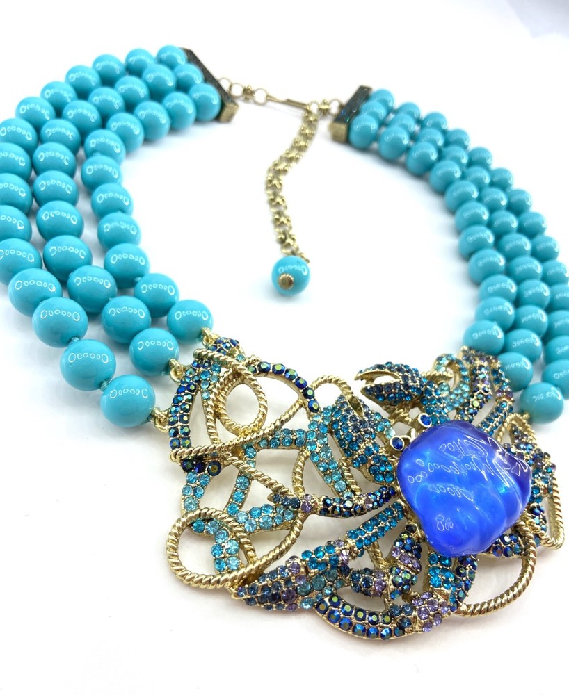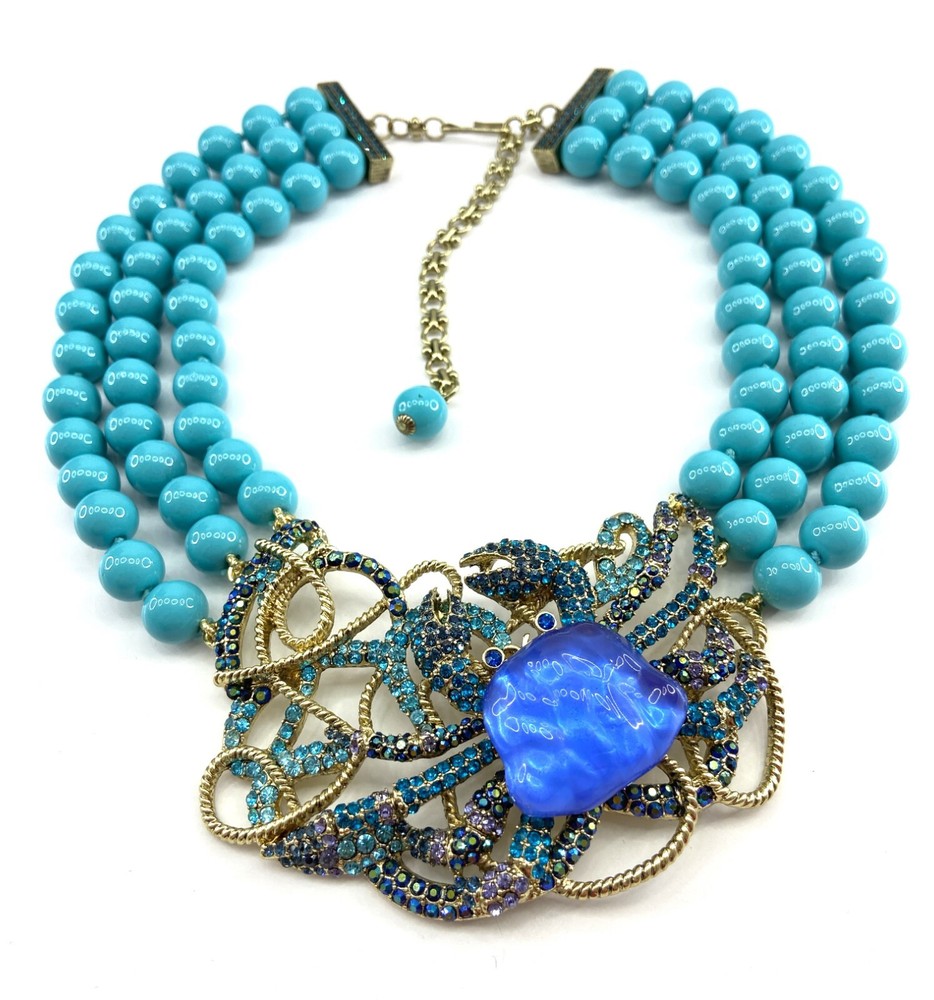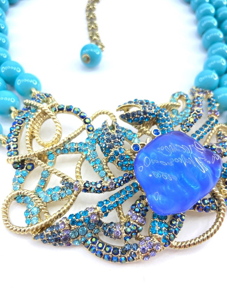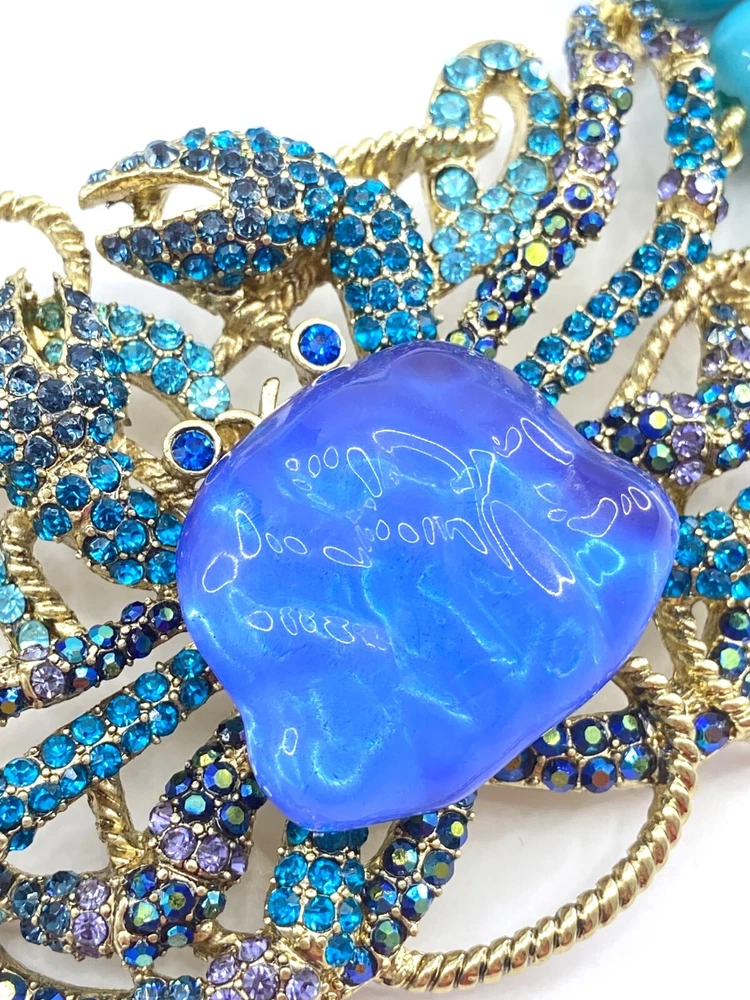 BRAND - HEIDI DAUS * LET'S HEIDI'S CRYSTAL-ENCRUSTED CRUSTACEAN GIVE YOUR EVERYDAY ENSEBBLES A SPARKLING LIFT * NECKLACE MEASUREMENTS - APPROX - 16-3/4"L x 1-1/4"W WITH 3-3/4" EXTENDER * DROP APPROX - 4-1/8"L x 3-1/4"W * CRYSTAL INFO - AQUAMARINE-COLOR, INDICOLITE-COLOR, CAPRI BLUE, TANZANITE-COLOR, JET-COLOR AB, MONTANA BLUE CRYSTALS, BLUE RESIN, TURQUOISE-COLOR GLASS BEADS * FINDINGS - NECKLACE - HOOK CLOSURE * OXIDIZED, TEXTURED FINISH The beads may have small scratches Condition: Brand New without tag. Sample or display use. There might be very tiny misplacement of the tiny crystals, if there is. There also might be tiny faint markings or slight scratches throughout metal. There might be a little difference of the colors due to the camera or light.