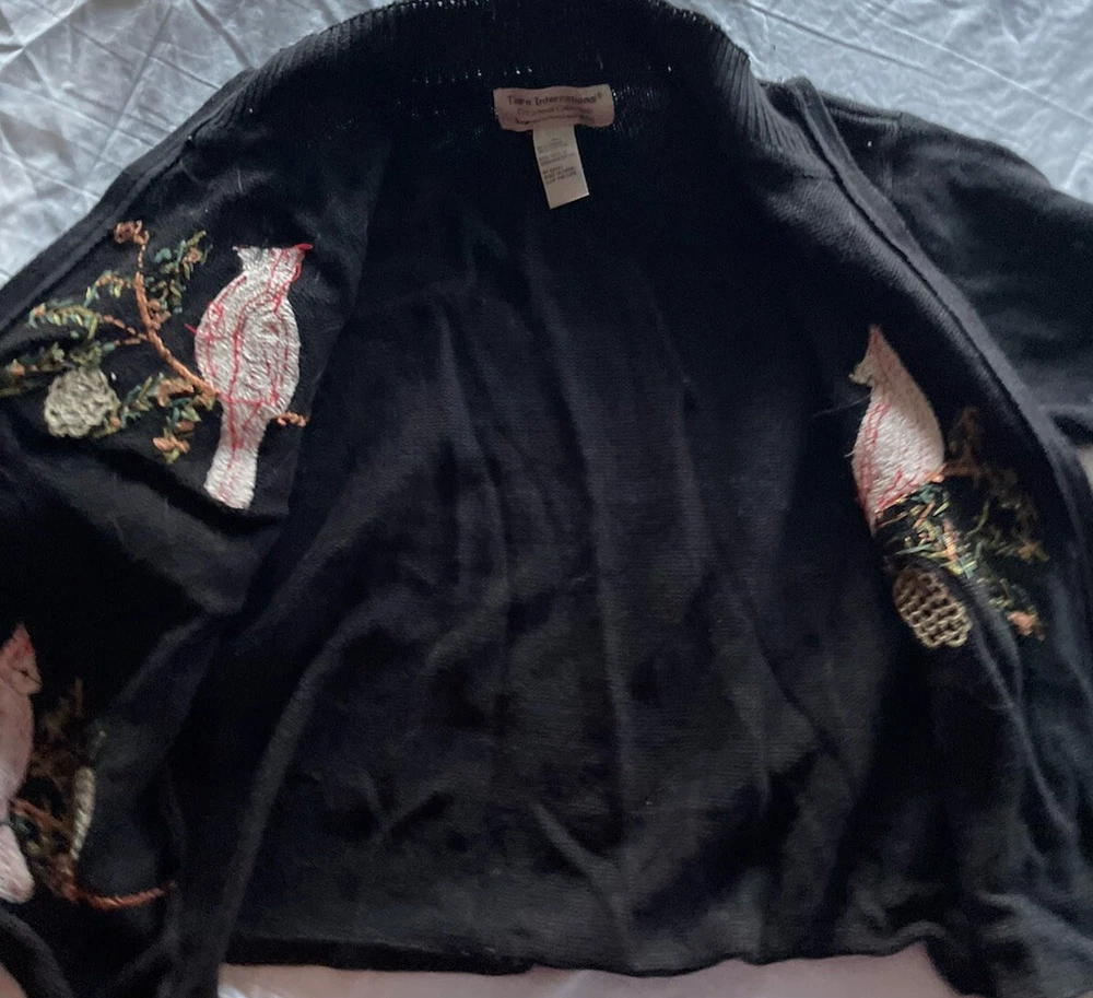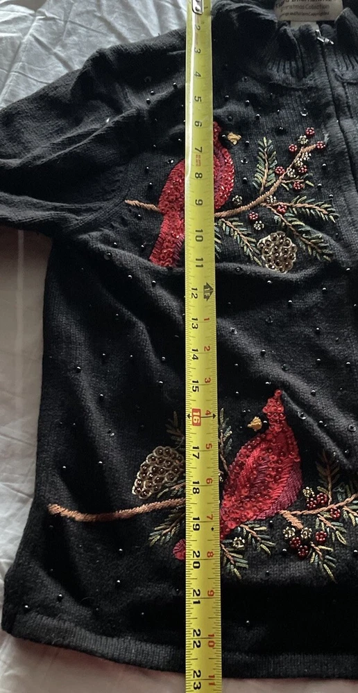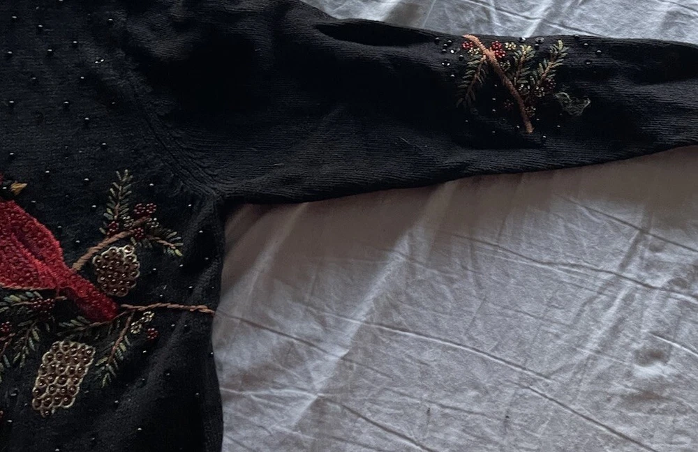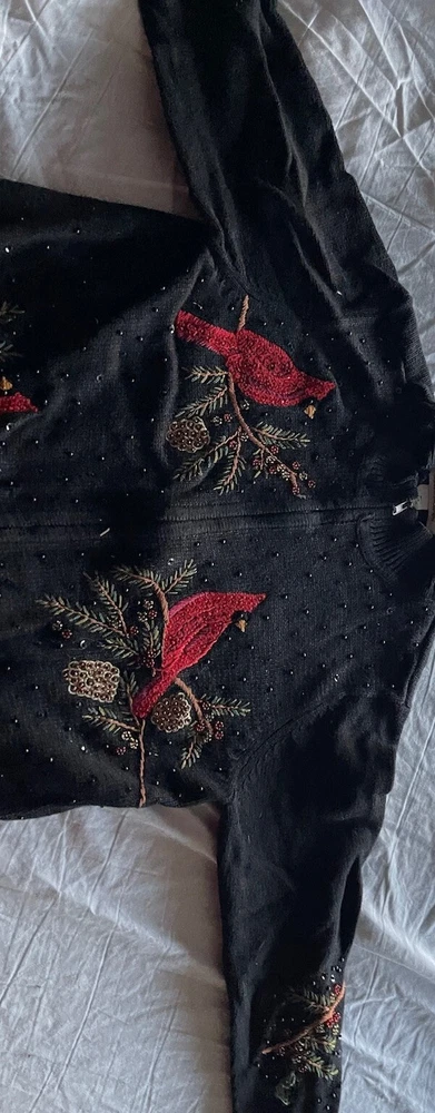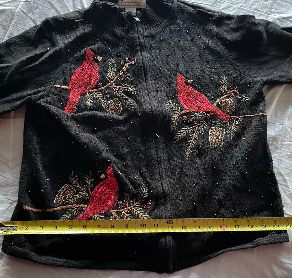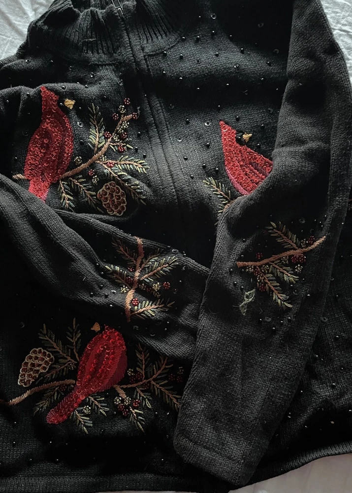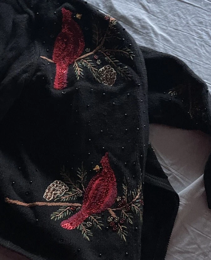 Get into the holiday spirit with this stunning Heirloom Collectibles Christmas cardigan sweater! Featuring a beautiful pattern of birds in black, red, green, yellow, and multicolor, this sweater is perfect for any Christmas occasion. The long sleeves and round neckline provide warmth and comfort during the chilly winter season, while the cotton blend material ensures a soft and cozy feel. This sweater is a size L and is designed for regular size women. It features a full zip and is accented with sequins for a touch of sparkle. The vintage and classic style makes it a perfect addition to any wardrobe, while the graphic print adds a fun and playful touch. Ideal for Western, Christmas, animals, winter, holiday, colorful, classic, ugly sweater, and 90s themes, this sweater is sure to make a statement. Hand-wash only for optimal care and maintenance.