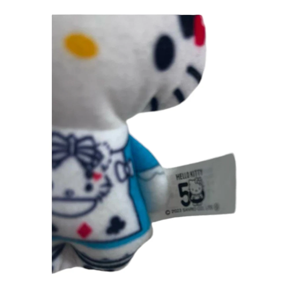 Celebrate the 50th anniversary of Hello Kitty with this adorable McDonald's happy set plush toy. The light blue dress and white fur accents make this Hello Kitty doll a perfect addition to any collection. Made in Japan, this plush toy features the iconic character from the popular TV show and is a must-have for any Hello Kitty fan. The year of manufacture is 2023, making this collectible a rare find. Add this Hello Kitty plush toy to your collection today!