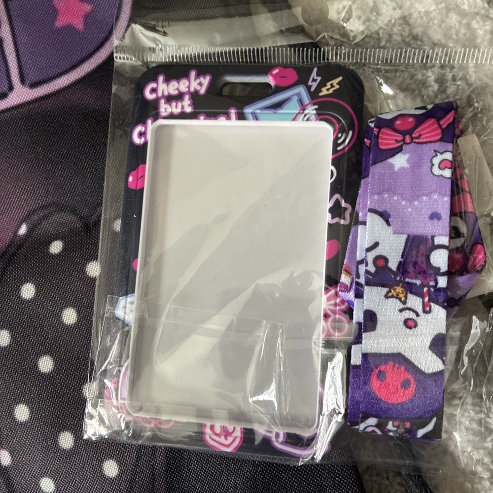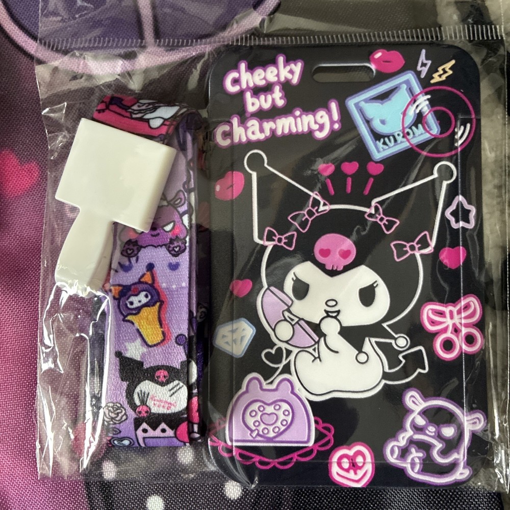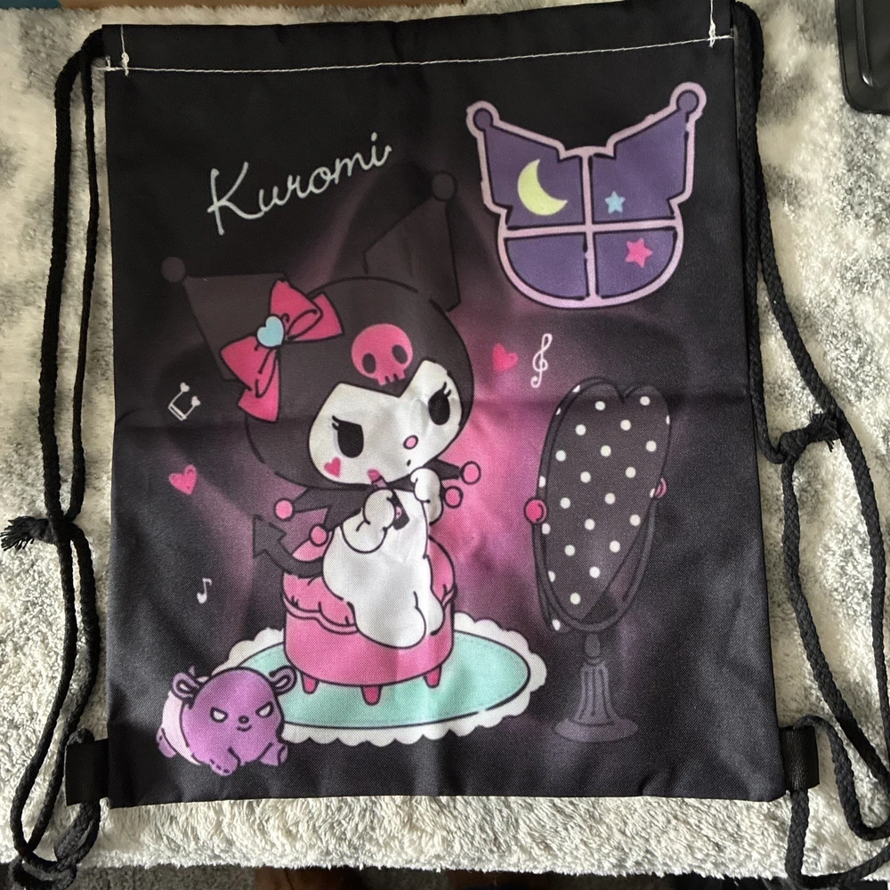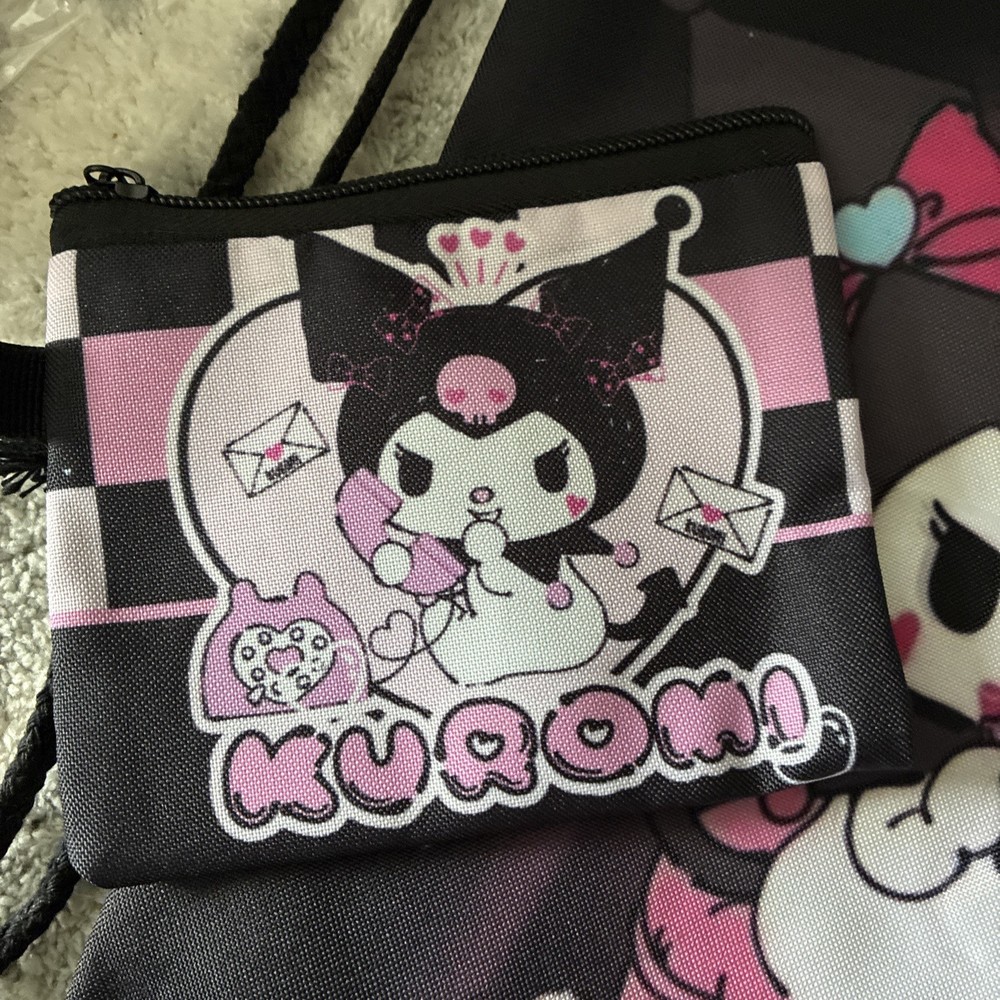 The Hello Kitty Backpack KUROMI in black is a medium-sized backpack made from 100% polyester, suitable for both boys and girls. It features a stylish design with a black string and includes a purse, card holder, and lanyard, making it a practical and versatile accessory for young children. The backpack has a width of 12 inches and a height of 15 inches, providing ample space for storing essentials while on the go. Perfect for school, outings, or everyday use, this backpack combines functionality with a fun and cute Hello Kitty design.