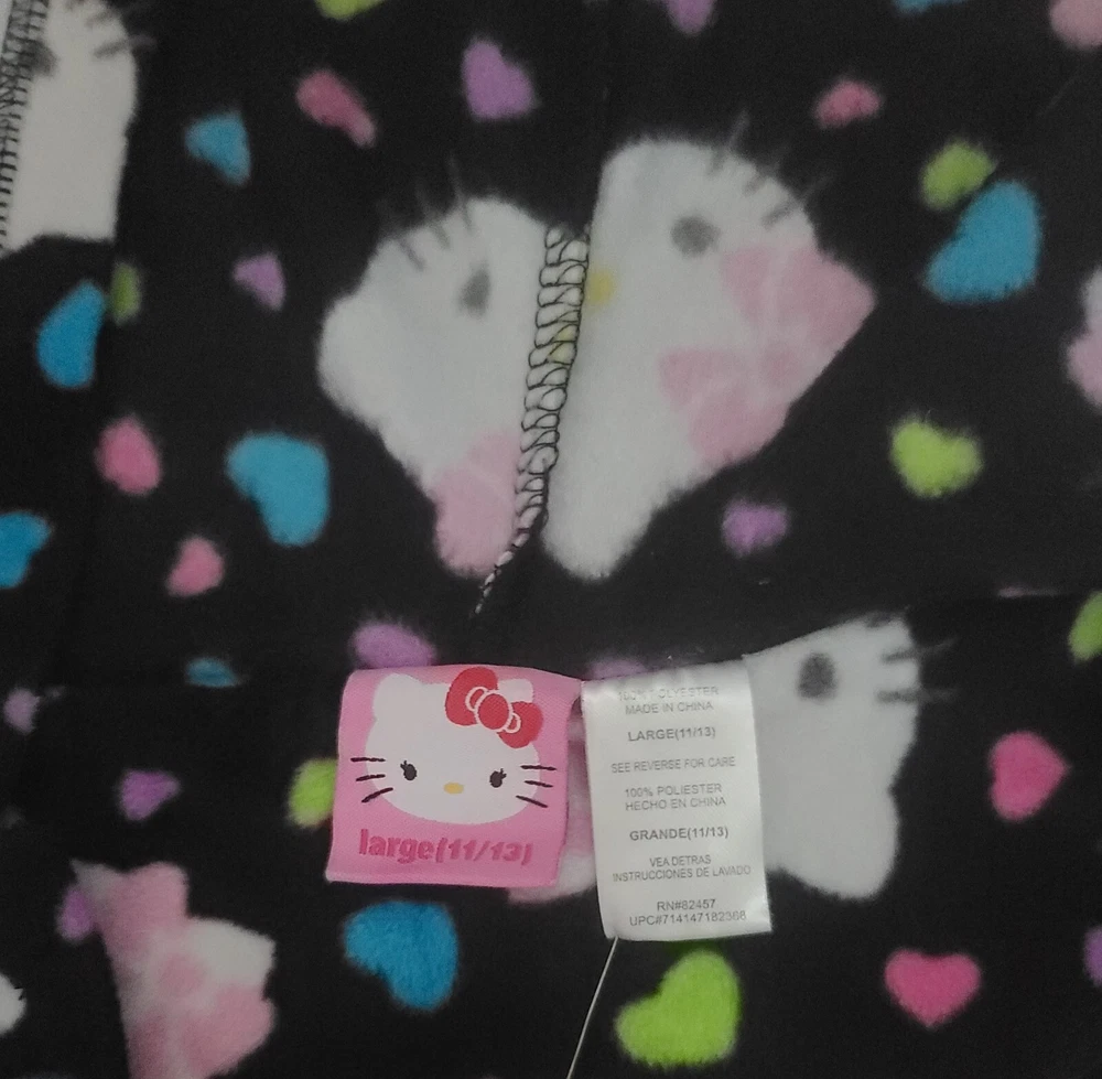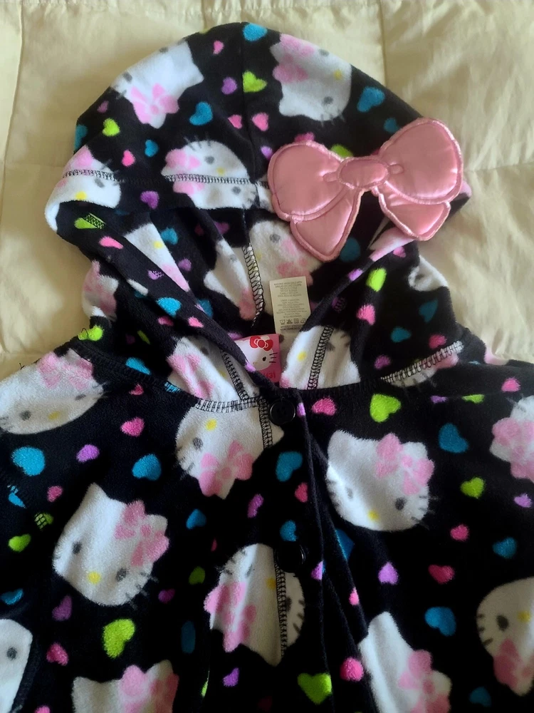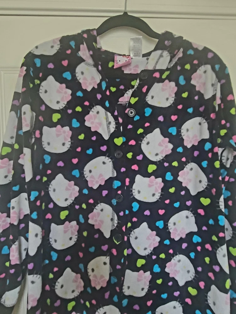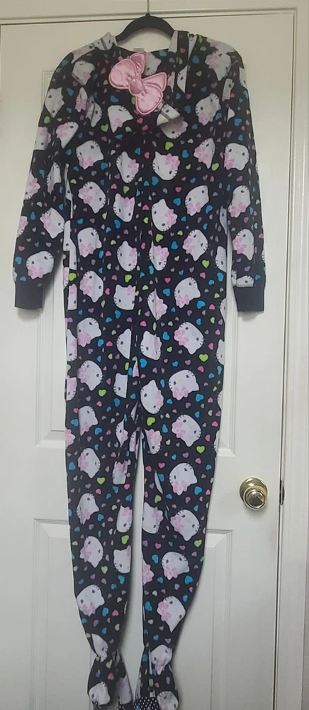 Step into cozy comfort with these Hello Kitty size large (11-13) footed pajamas, perfect for those chilly fall and winter nights. Featuring a playful Hello Kitty pattern in classic black, these pajamas are designed with a hood for extra warmth and a button-front closure for easy wear. The long sleeves and polyester material ensure both comfort and durability, while the cute bow accents add a touch of whimsy. Ideal for any Hello Kitty fan, these pajamas are machine washable for hassle-free care. They're a fun addition to any sleepwear collection, combining both style and functionality. Whether you're lounging at home or settling in for a cozy night's sleep, these footed pajamas are sure to become your new go-to for relaxed evenings.