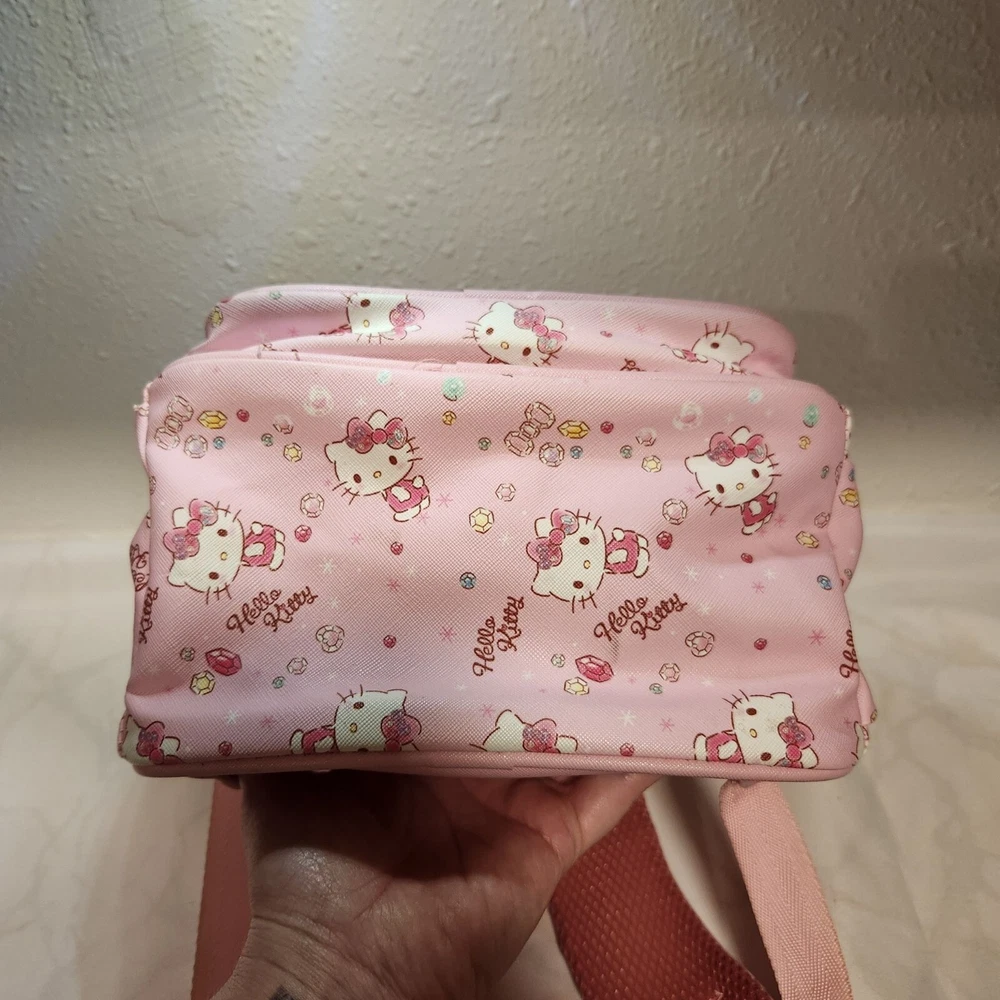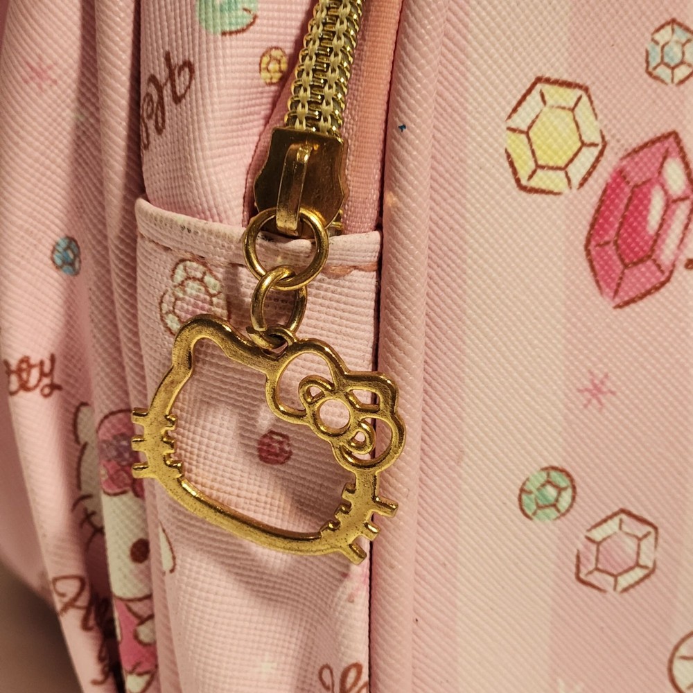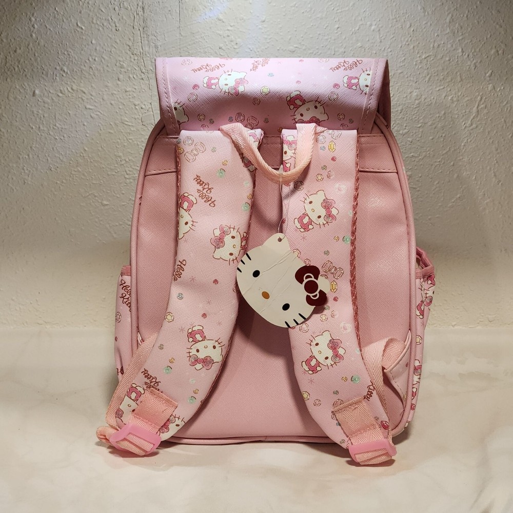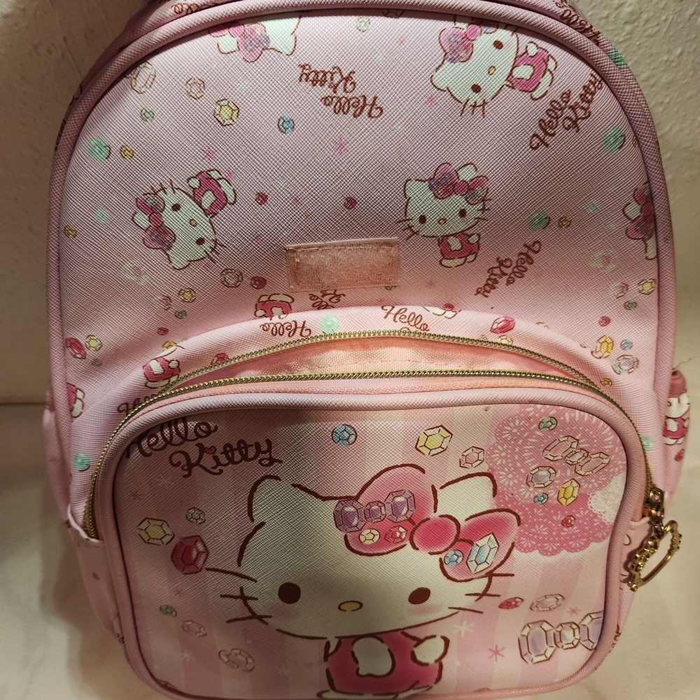 Pre-Owned, in good condition, see photos. Girls Hello Kitty mini back pack. Two tone pink striped with images of Hello Kitty and gems all over. Two zipper pockets and a fold over flap on the top. Adjustable shoulder straps and two side pockets. The zippers are Hello Kitty cutouts. Still has one of the tags on it, barely used. Hard to find image pattern, from 2017. Measurements are approximate: Height - 13" Width - 11" Depth - 6" Stored in a smoke-free and pet friendly environment. Thanks for looking! All orders ship within two business days, reasonable offers accepted.