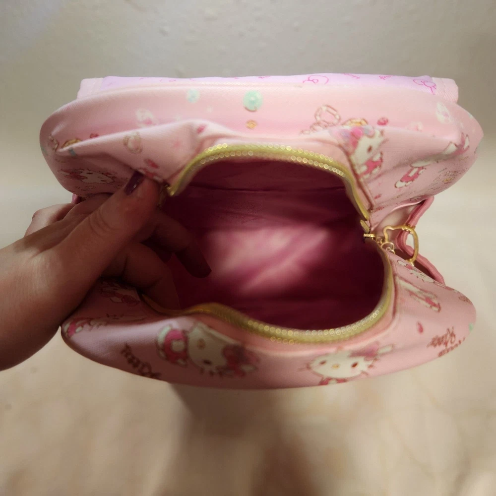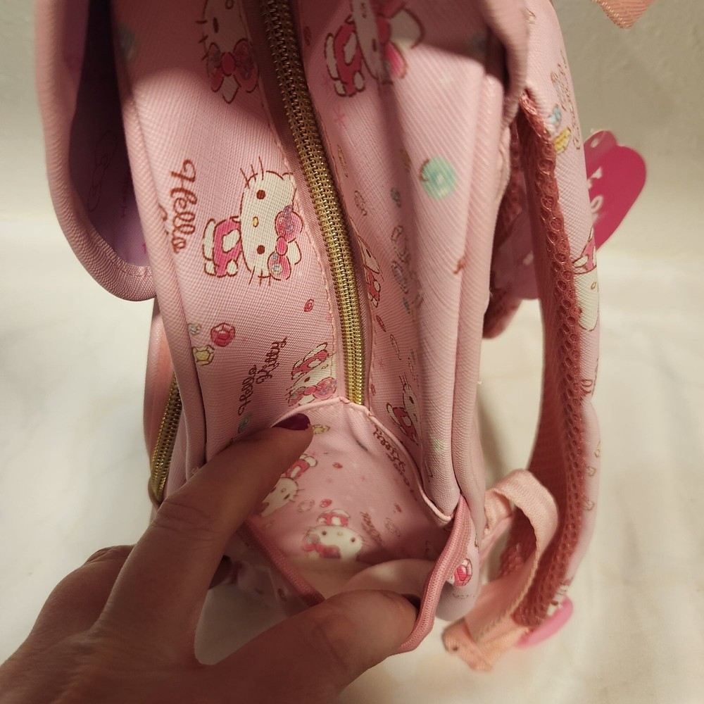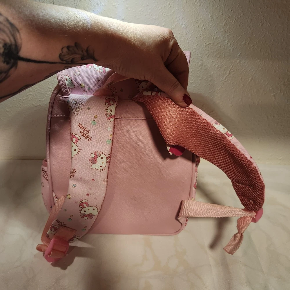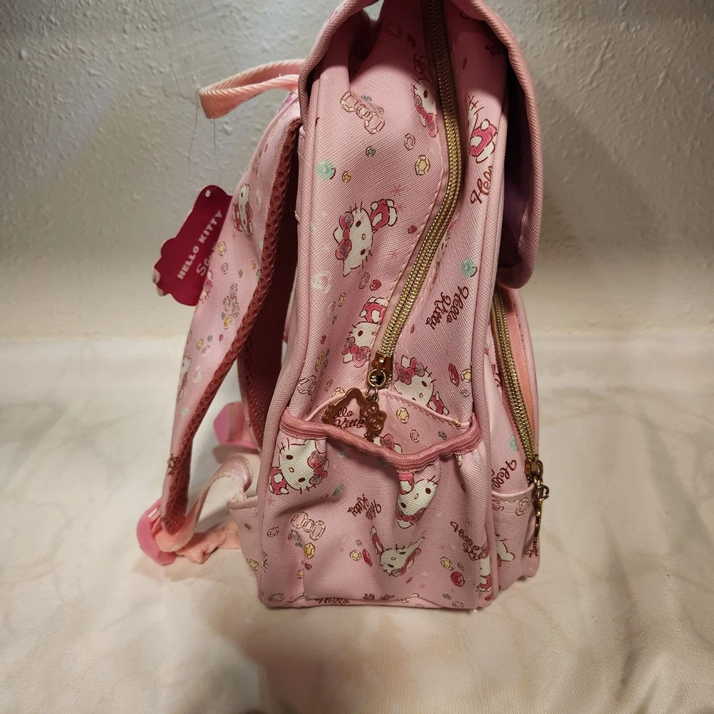Pre-Owned, in good condition, see photos. Girls Hello Kitty mini back pack. Two tone pink striped with images of Hello Kitty and gems all over. Two zipper pockets and a fold over flap on the top. Adjustable shoulder straps and two side pockets. The zippers are Hello Kitty cutouts. Still has one of the tags on it, barely used. Hard to find image pattern, from 2017. Measurements are approximate: Height - 13" Width - 11" Depth - 6" Stored in a smoke-free and pet friendly environment. Thanks for looking! All orders ship within two business days, reasonable offers accepted.
