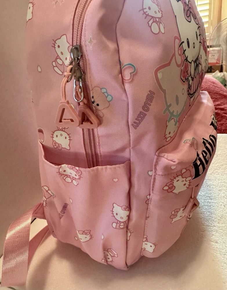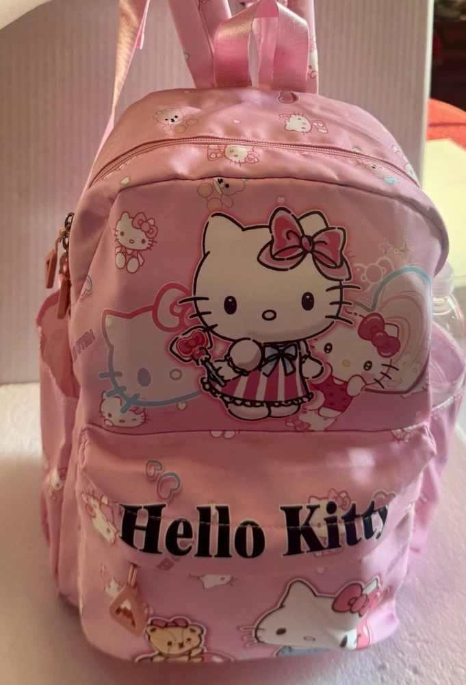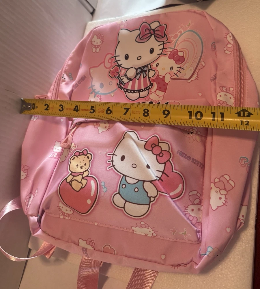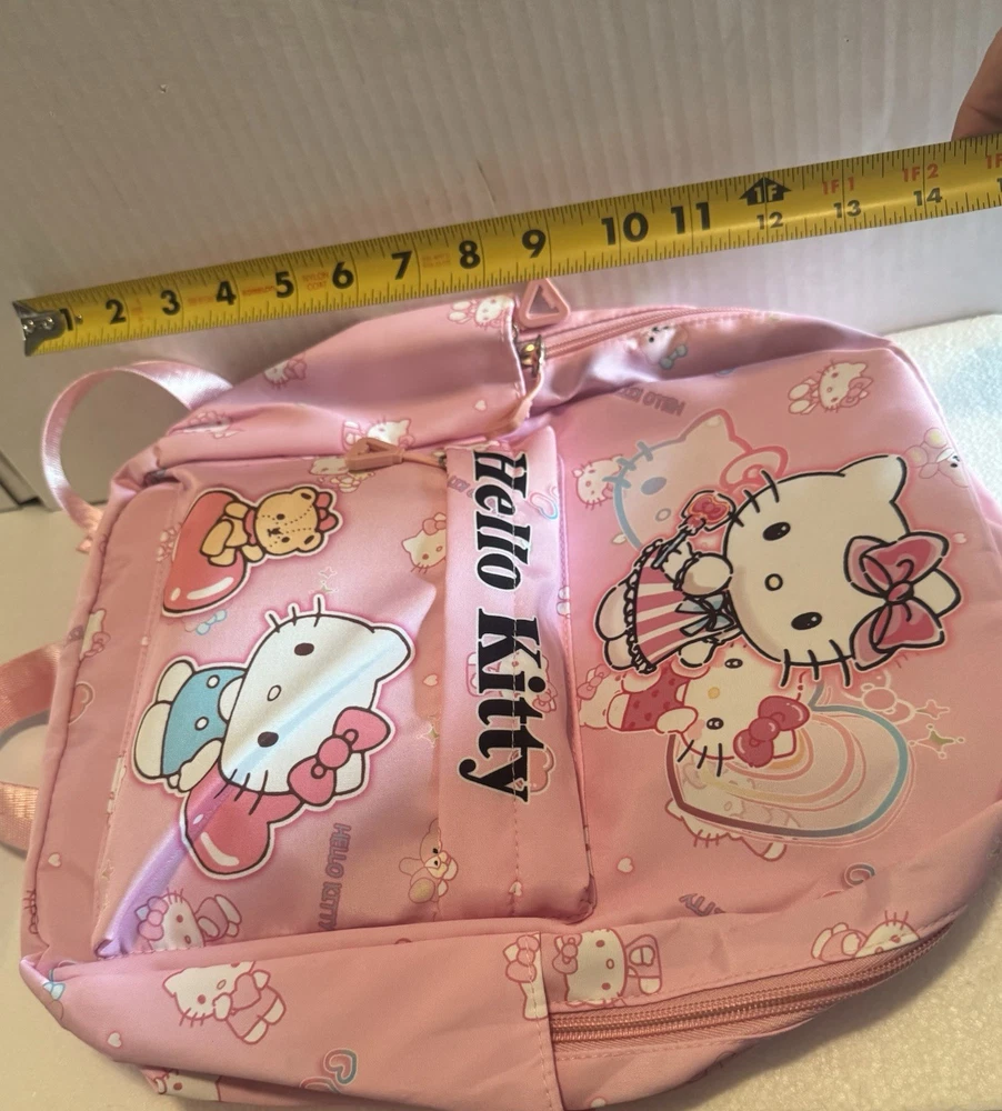 The Hello Kitty Sanrio kids backpack is a medium-sized bag with a zip closure and adjustable straps, perfect for casual occasions. Made of polyester the backpack features the popular Hello Kitty character in pink color. This backpack is designed for school-themed unisex kids. With a width of 12 inches and height of 14 inches, this stylish backpack is a must-have for young fans of Hello Kitty. Pendant not included.
