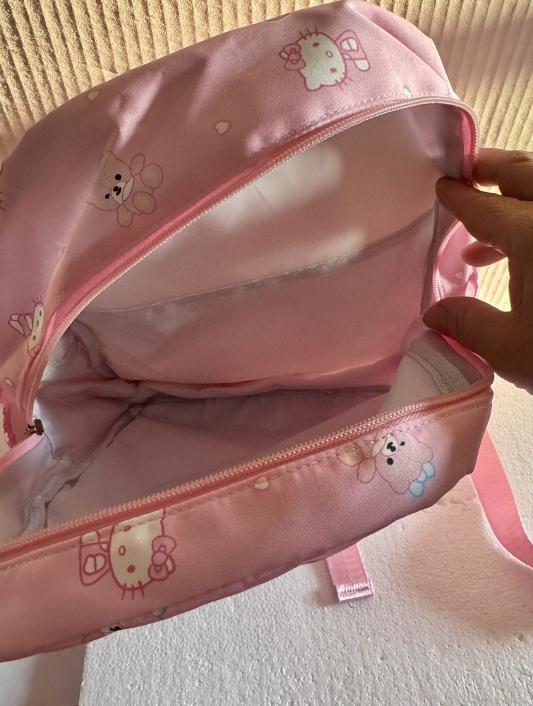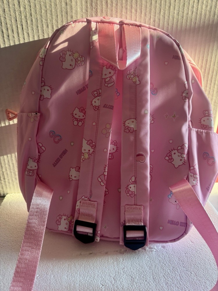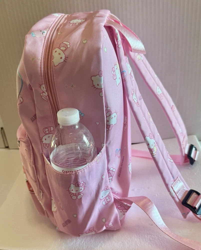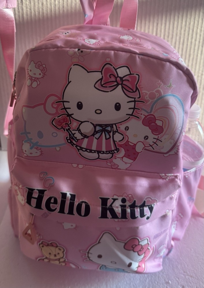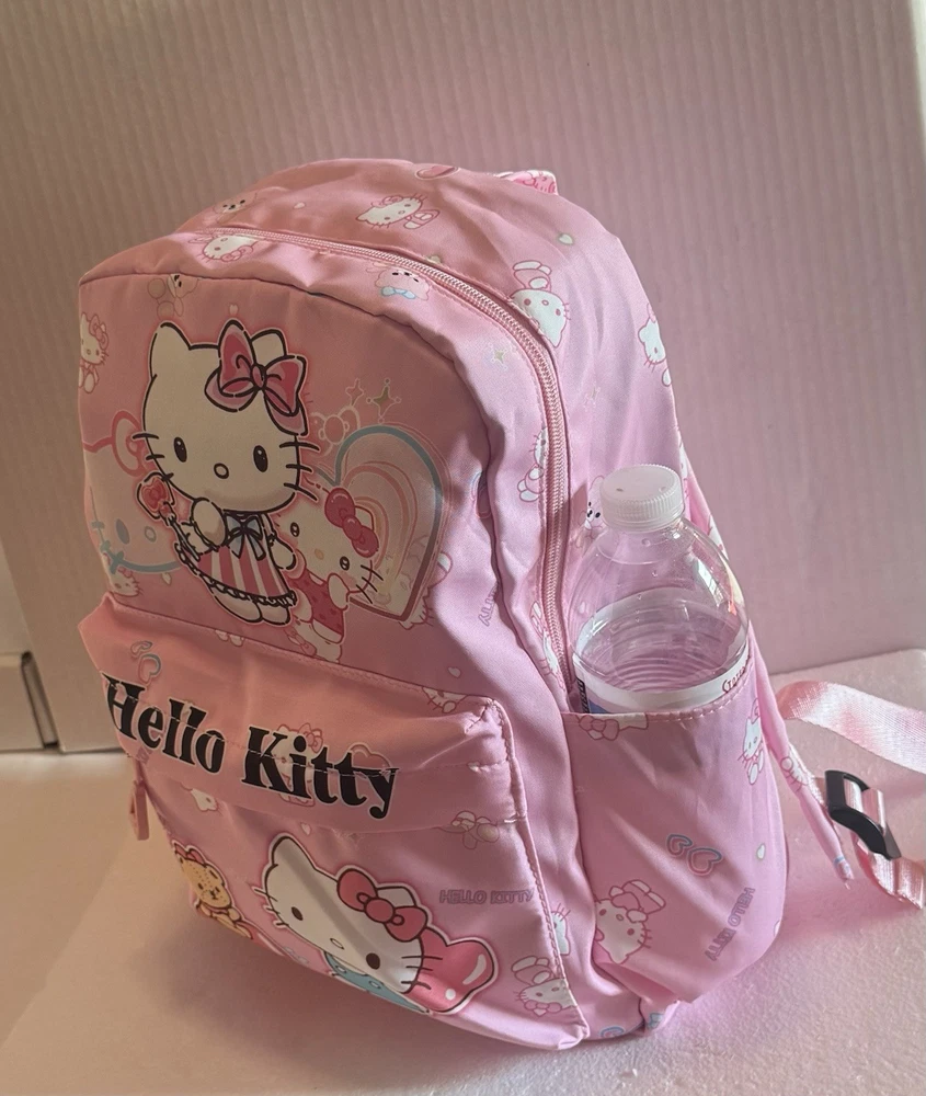 The Hello Kitty Sanrio kids backpack is a medium-sized bag with a zip closure and adjustable straps, perfect for casual occasions. Made of polyester the backpack features the popular Hello Kitty character in pink color. This backpack is designed for school-themed unisex kids. With a width of 12 inches and height of 14 inches, this stylish backpack is a must-have for young fans of Hello Kitty. Pendant not included.