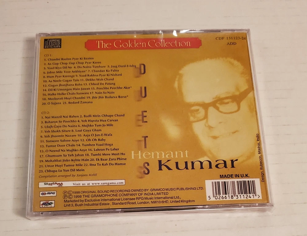 This 2 CD set features Hemant Kumar's Duets from The Golden Collection. The music is in English language and of Hindu and International style. The CDs are in mint condition, and the case type is a standard jewel case. The inlay condition and case condition are also in mint condition. The release year of the CDs is 1998, and they were made in the United Kingdom. The CDs come in a brown color and are brand new and sealed. The CDs are produced by RPG Music International and include the artist Hemant Kumar. This CD set is perfect for lovers of Hindu music and collectors of international music. The jewel case shows a couple of cracks on the front . Please see pictures.