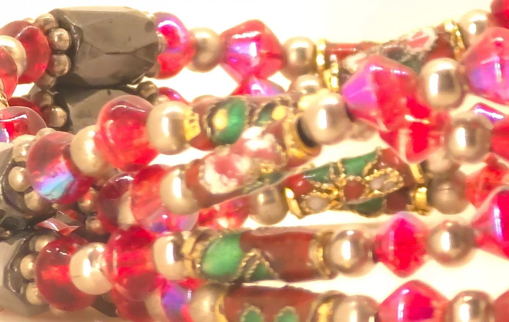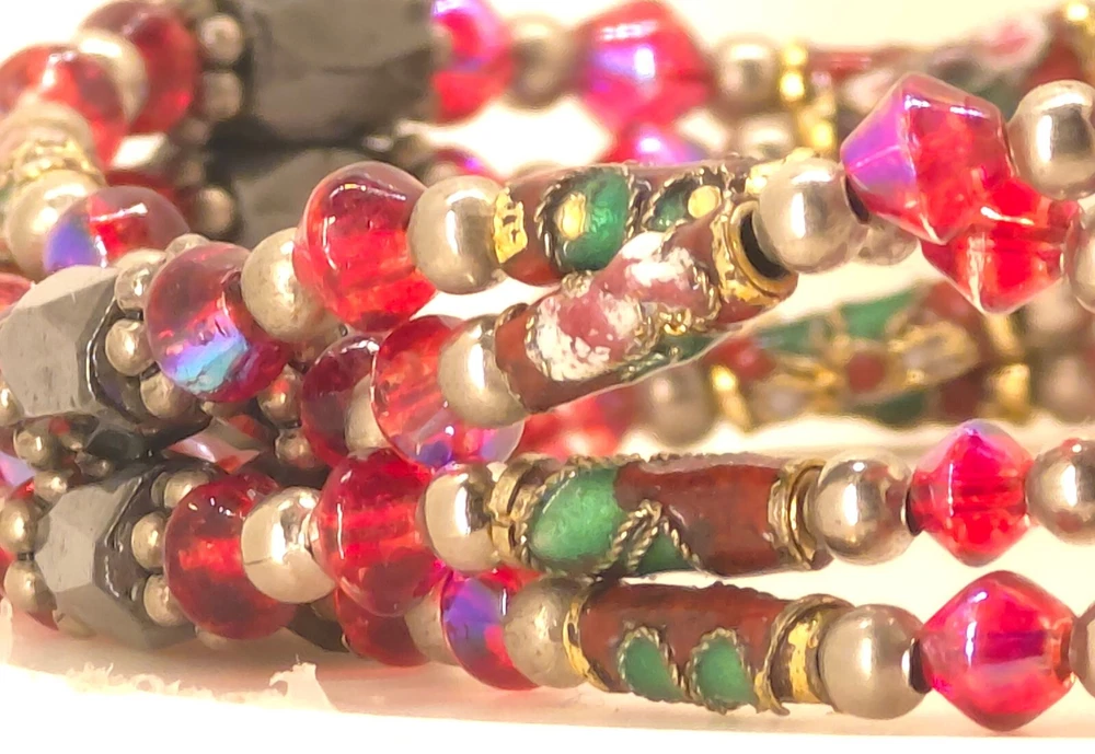 This handmade bracelet features natural hematite stones in a round shape, embellished with red enamel and crystal details in a multicolor design. The adjustable wrap-around style is secured with a magnetic closure, making it easy to wear. Ideal for occasions like Mother's Day, anniversary, birthday, or Valentine's Day, this bracelet is a unique piece with a beauty and art theme, perfect for adding a touch of fashion and style to any outfit.