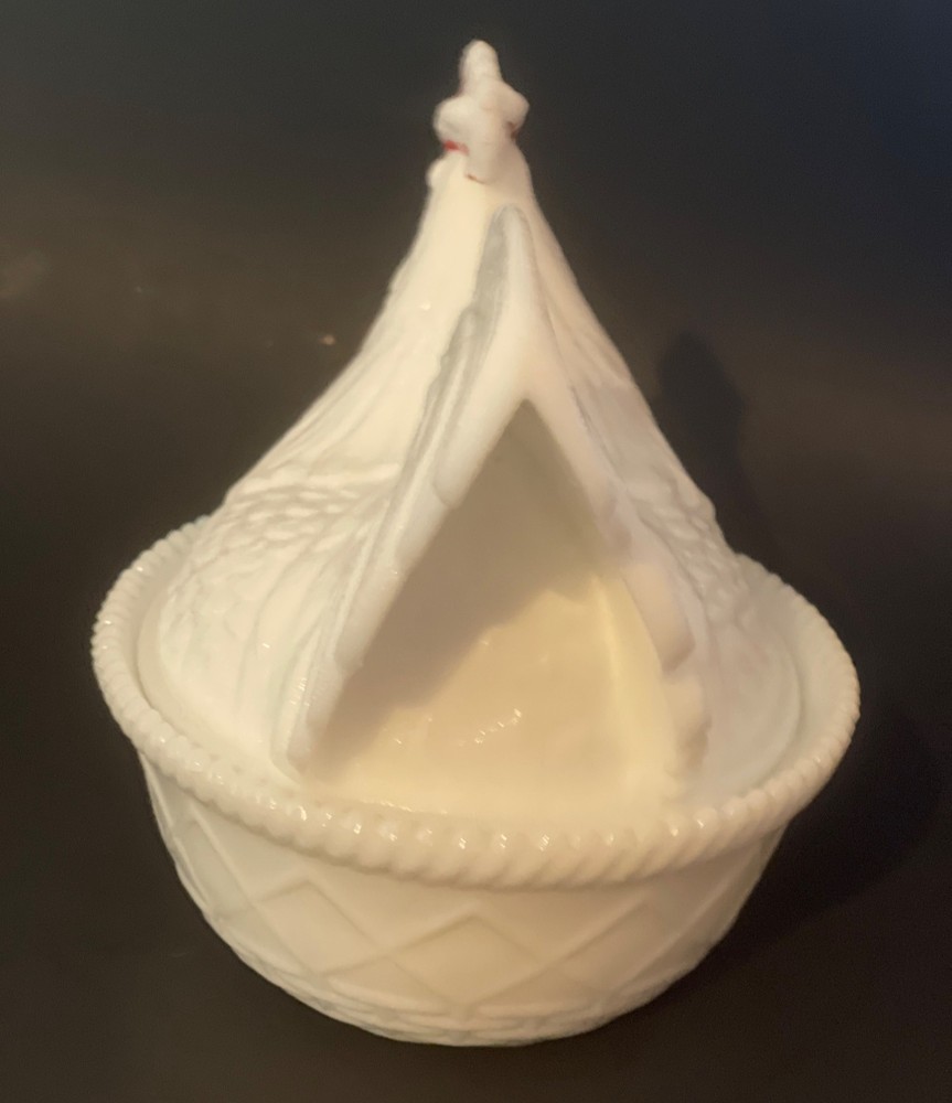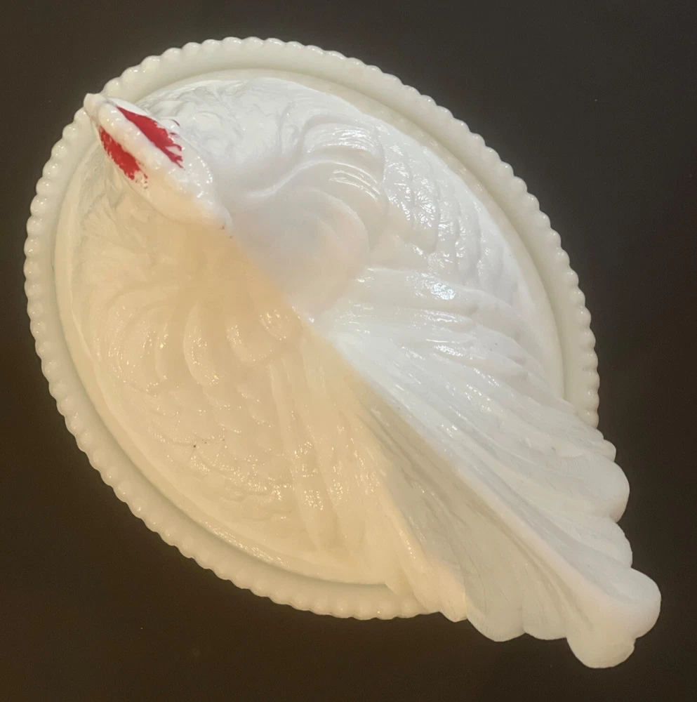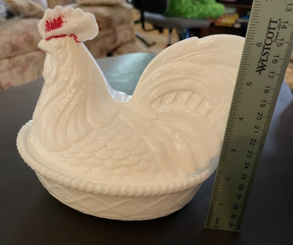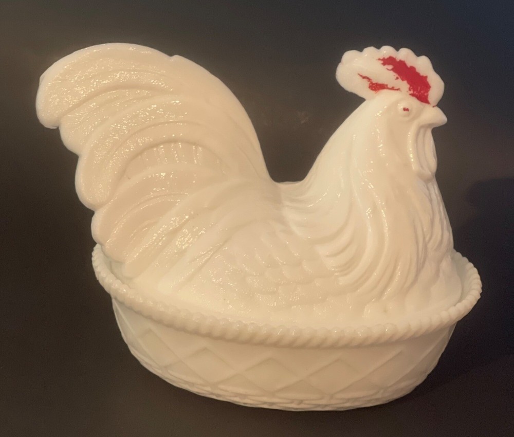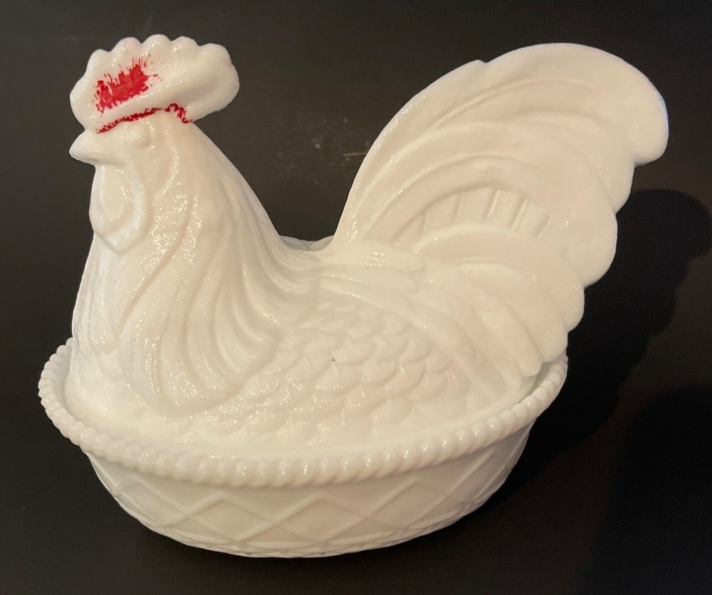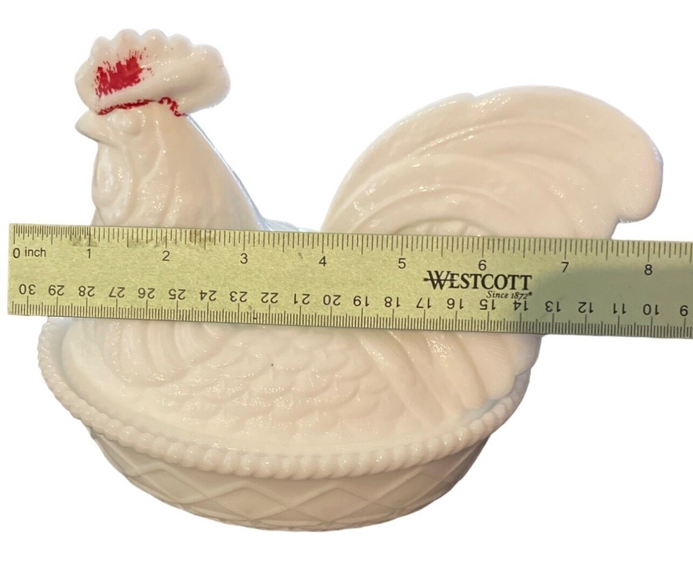 Westmoreland Rooster on a Nest White Milk Glass MCM Split Tail 8" x 6" Vintage 1950's This piece is in great vintage condition. There is paint loss on the eyes and comb but no cracks or chips. Shipping weight is over 4 pounds from Florida