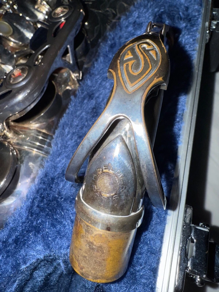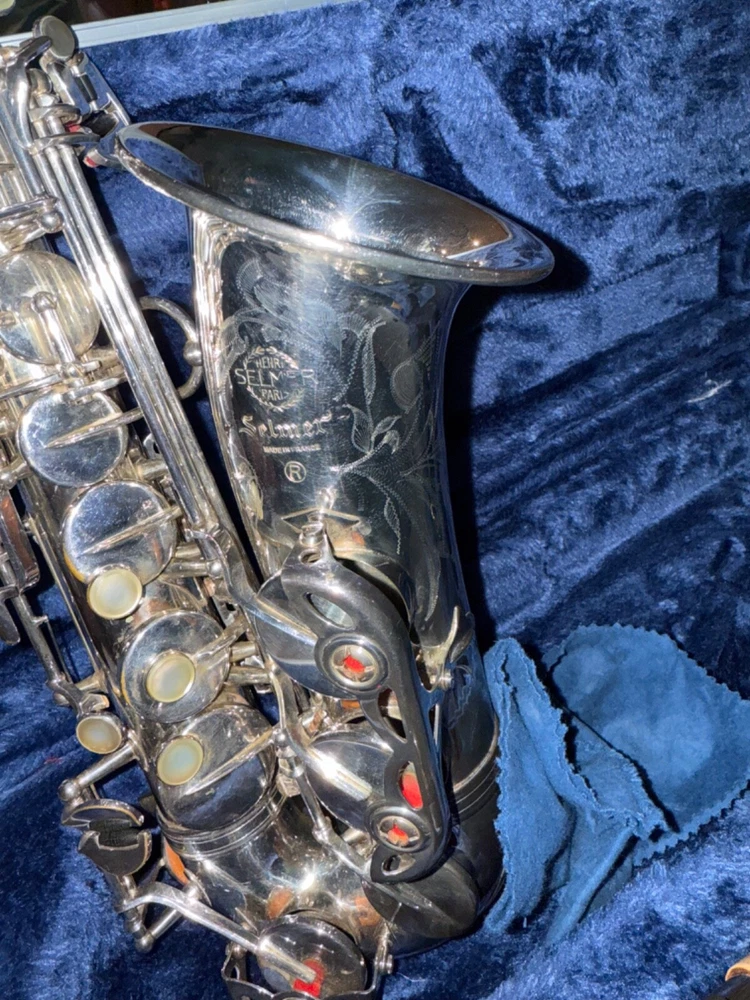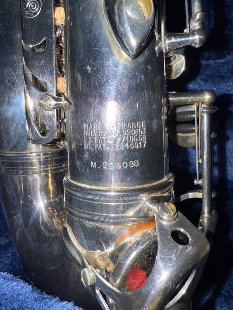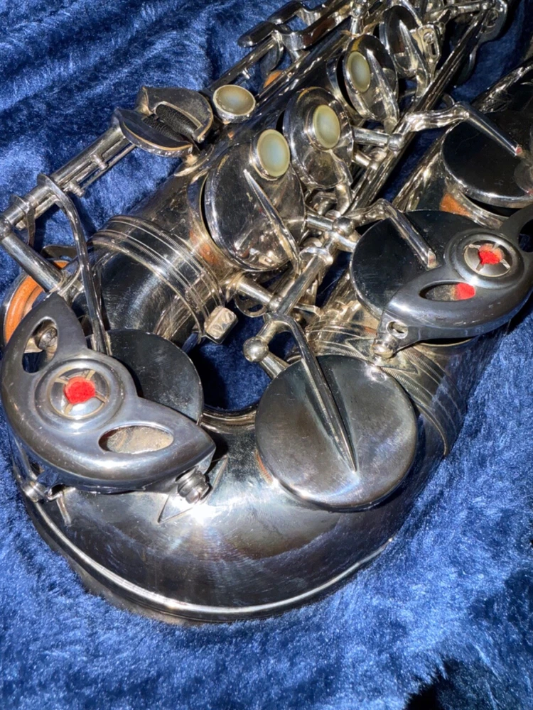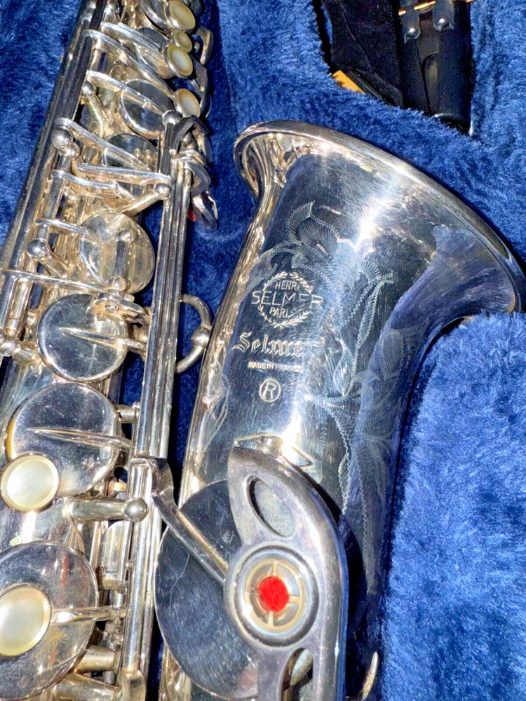 This is a beautiful instrument and the saxophone of my dreams! Henri Selmer Paris Mark VI Alto Saxophone, Rare Original Silver Plated, 1974 Model 22xxxx, one of the last ones of it's kind as Selmer switched to production of the Mark VII in the same year. This is sometimes called the "Conservatory Model" featuring 5 extra keys: high F#, G# trill key, forked Eb and high E trill key. Pads, felts, springs, and cork overhauled with a deep cleaning in 2019 when I purchased it from a fine instrument dealer. It has been played less than an hour since then. All pads seal well and springs function appropriately. Most of the original silver plate is intact with brass showing at playing wear locations. Some tarnish is present on the silver, especially on the neck. It is accompanied by a new Selmer S80 C Star mouthpiece, leather ligature, and padded strap. The original case was in tatters when I acquired it and was beyond repair so I replaced it with a hard-sided modern molded case for protection. An almost full pack of Van Doren size 3 reeds is included as well polishing and cleaning items.