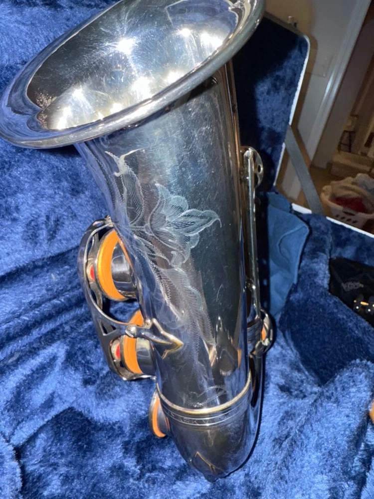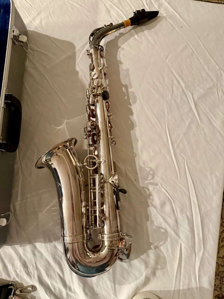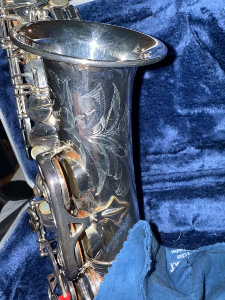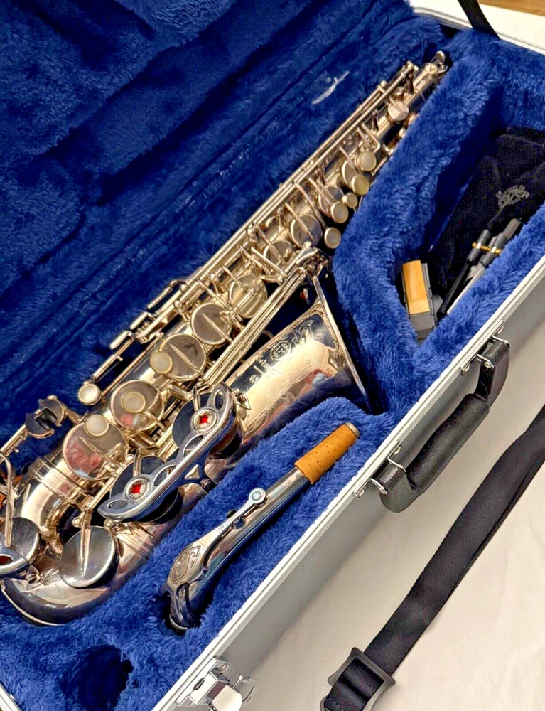 This is a beautiful instrument and the saxophone of my dreams! Henri Selmer Paris Mark VI Alto Saxophone, Rare Original Silver Plated, 1974 Model 22xxxx, one of the last ones of it's kind as Selmer switched to production of the Mark VII in the same year. This is sometimes called the "Conservatory Model" featuring 5 extra keys: high F#, G# trill key, forked Eb and high E trill key. Pads, felts, springs, and cork overhauled with a deep cleaning in 2019 when I purchased it from a fine instrument dealer. It has been played less than an hour since then. All pads seal well and springs function appropriately. Most of the original silver plate is intact with brass showing at playing wear locations. Some tarnish is present on the silver, especially on the neck. It is accompanied by a new Selmer S80 C Star mouthpiece, leather ligature, and padded strap. The original case was in tatters when I acquired it and was beyond repair so I replaced it with a hard-sided modern molded case for protection. An almost full pack of Van Doren size 3 reeds is included as well polishing and cleaning items.