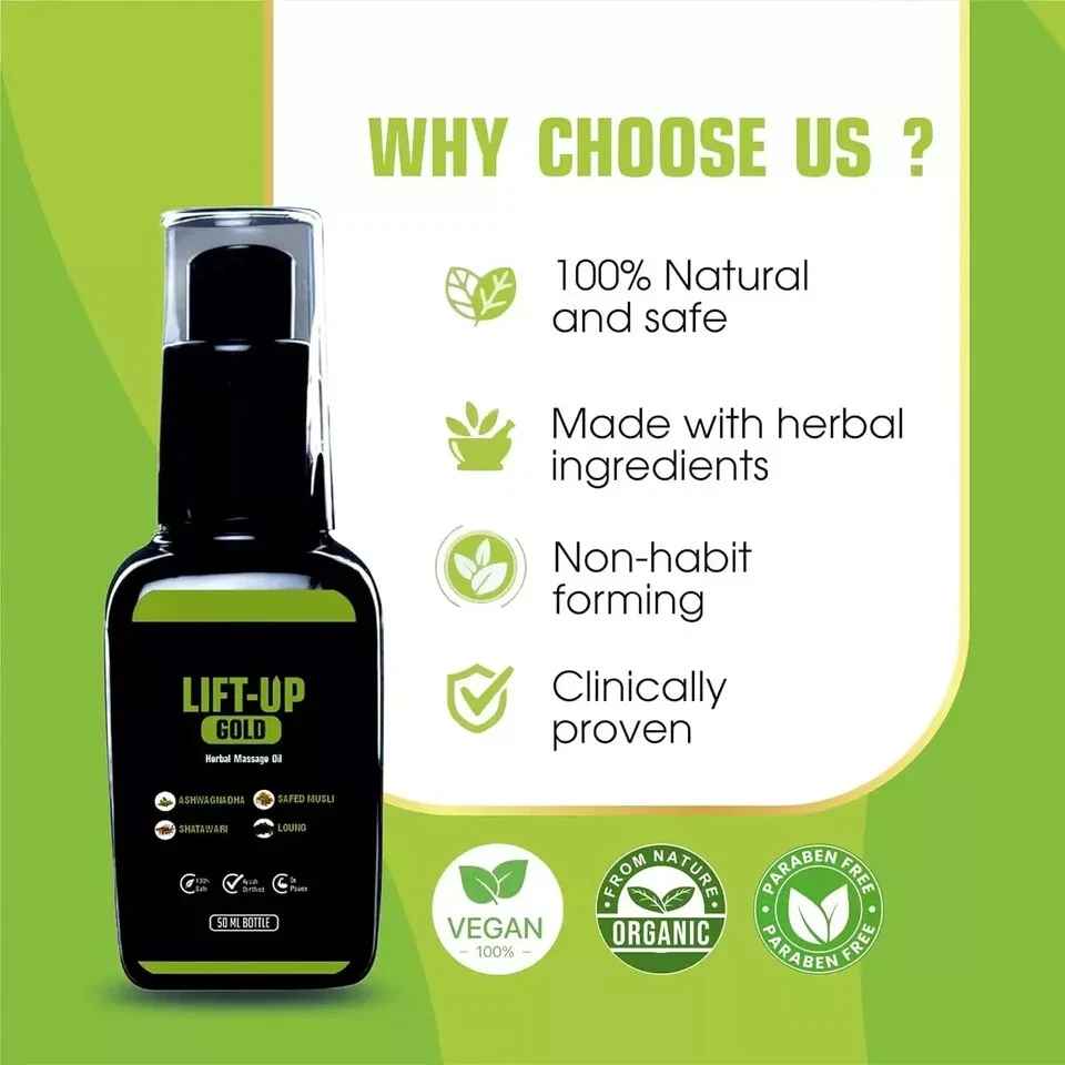 About this item For more products from "LIFT UP GOLD" see the name "Viaan Nutrition2" LIFT UP Massage Oil for Men: Enhance your massage experience with our specially crafted ayurvedic men massage oil, designed to rejuvenate and invigorate. Pure & Natural Formula: Immerse yourself in the goodness of nature with our carefully curated blend, free from artificial additives. No Side Effects, Clinically Tested: Trust in a LIFT UP massage oil that prioritizes your well-being. Rigorously tested for safety and efficacy. Easy Application: Apply 2-4 drops daily, gently massaging for 5 minutes. Incorporate it seamlessly into your routine. Personal Testimony: Witness the difference with our LIFT UP Massage Oil – a product endorsed by me and my team for noticeable results after just one bottle. --------------------------------------------------------------------------------------------------------------------- --------------------------------------------------------------------------------------------------------------------------------------------------------------------------------- Shipping and Handling Shipping time will be 3 business day after the cleared payment We will ship by Indian Post service Shipment will take 15-30 days. Few more days for your local customs delay and formalities. For any reason you wish to leave Negative or neutral feedback, Please contact us first and let us mutually resolve it. We care for your satisfaction and will make sure that you are happy with the transaction to post us 5**** ratings in all areas. ***Customs Information*** we will not be liable for packages refused or held by customs for delivery. We request that you contact customs office and ask about import regulations and restrictions before placing your order. It is important for you to become familiar with customs policies for your specific country before ordering. Customs regulations differ by country and not knowing their regulations can result in your order incurring high import duties, the delivery being delayed or even returned. Please check with your customs office to see if your country permits the shipment of the products you are planning to order from us and if any additional licenses or permits are needed. Please note: if your order is returned to us due to banned/ restricted products policy, a wrong address, refusal to pay customs fees, refusal to accept the order or because no one was there to accept the delivery of your order, we will refund your order as follow: you will be refunded the total amount of the order, minus the original shipping charge.