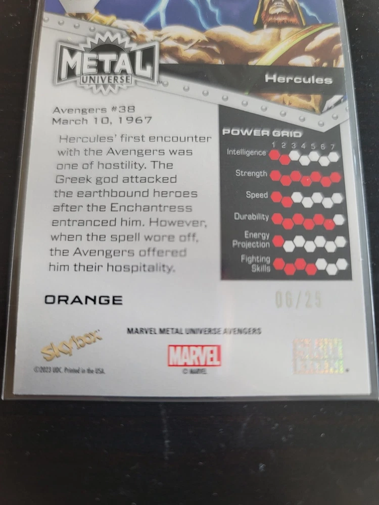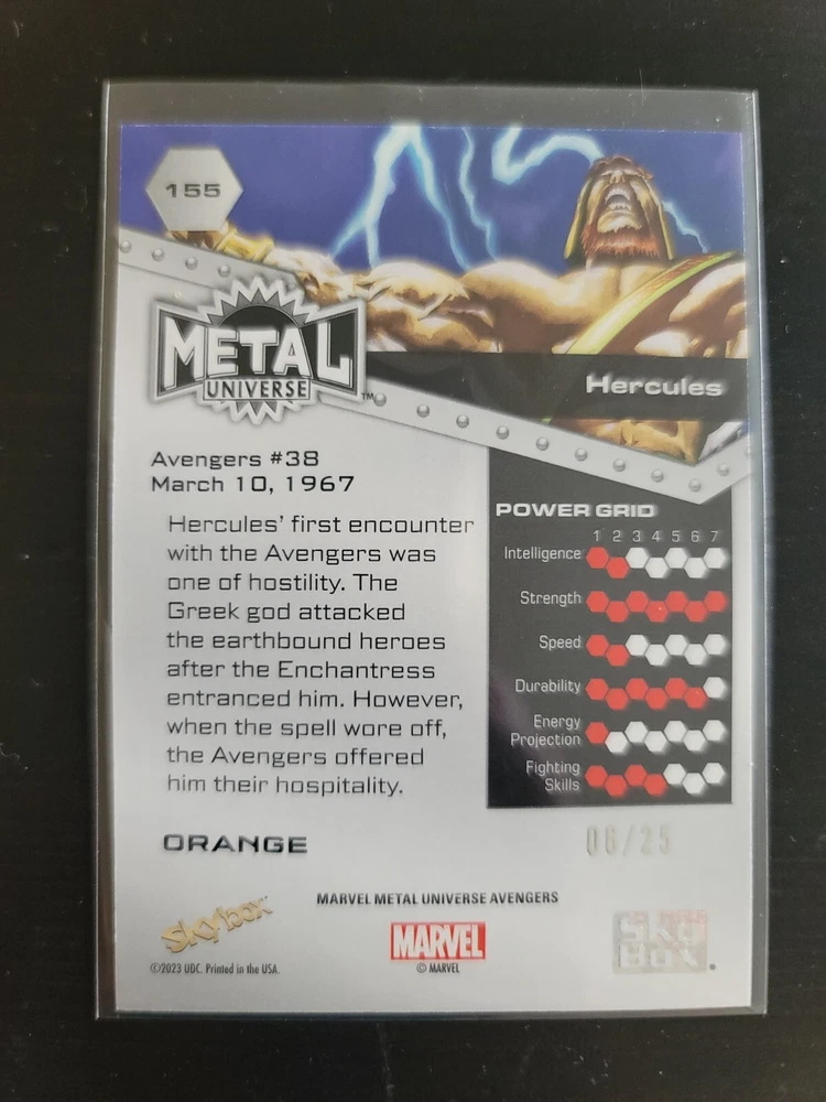 Combine shipments are welcome. Please wait for my Invoice before you make the payment once you combine the shipment. Each combine shipment, extra item will add USD$1 for the combining. Ex: Extra 1 item: add $1, Extra 2 items: add $2. Delve into the Marvel Metal Universe with the Hercules 2024 Skybox Avengers Orange FX card, a must-have for enthusiasts and collectors. This non-sport trading card, featuring the legendary figure from 'The Avengers' TV show, is a standout with its vibrant Orange FX parallel variety. It's a standard-sized original from Upper Deck, serial numbered to signify its exclusivity. With only 25 prints in existence, this card is a rare addition to any collection, boasting attributes like the base set, insert, and short print features. It's an English-language card numbered 155, capturing the essence of the 'Hercules' movie and the wider Avengers franchise. Enhance your assortment with this limited edition piece.