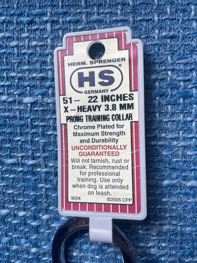 The Herm Sprenger 3.8mm Dog Training Collar. X/heavy duty. 22”. A high-quality, adjustable prong collar made of metal. It is designed for large dogs, with the brand Sprenger known for producing durable and effective training tools. Manufactured in Germany, this collar features a pinch or prong design, perfect for controlling and training strong-willed dogs. This collar has never been used but not that it is an earlier version of the Herm Sprenger collar.
