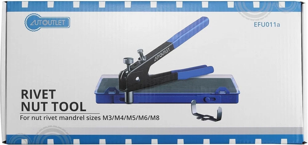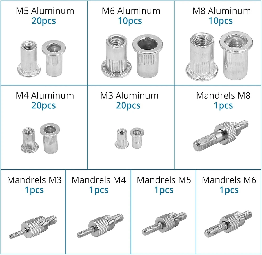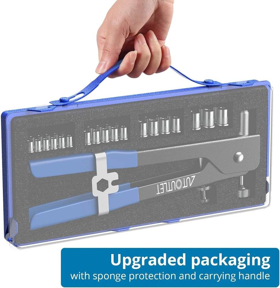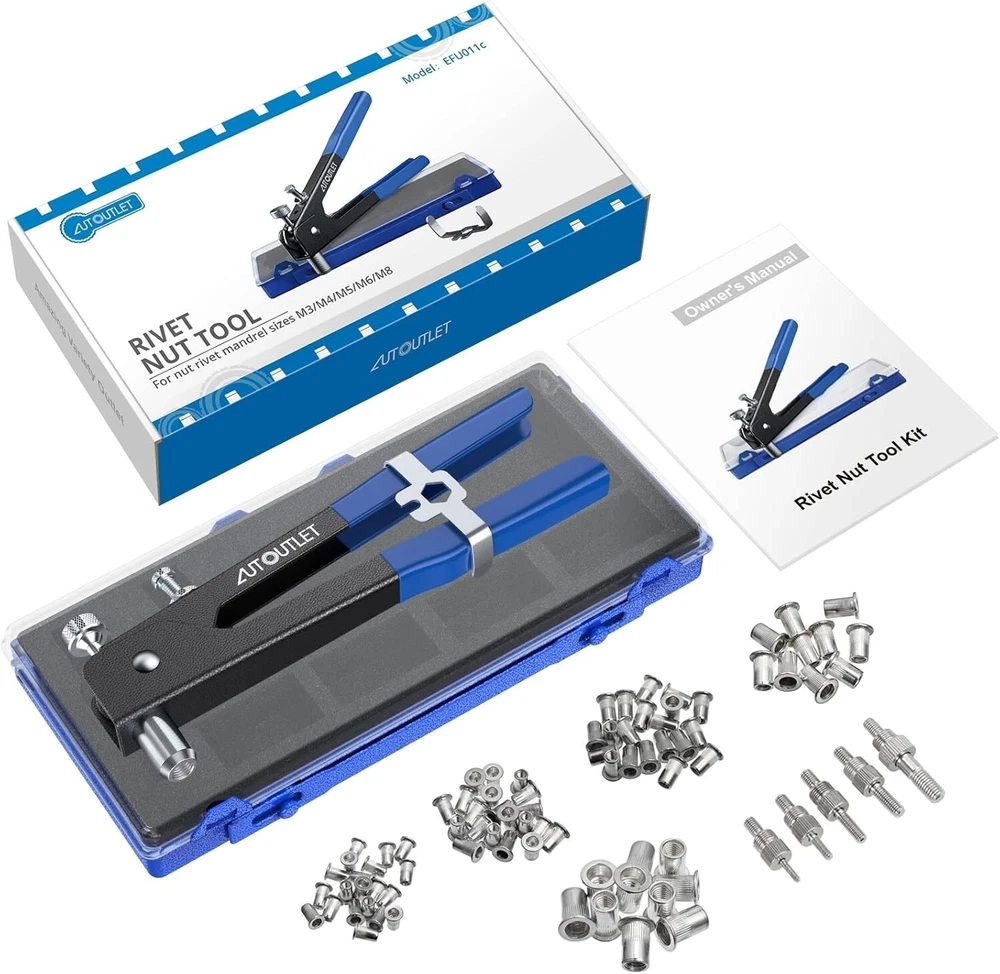 【Professional Rivet Gun】This 86 pcs rivet gun kit is suitable to be used in car, machine, trailers, and furniture repair, or even boat building. 【Complete Accessories】This rivet nut kit comes with 5 mandrels: M3/M4/M5/M6/M8, and 80 pcs rivet nuts: 20*M3, 20*M4, 20*M5, 10*M6, 10*M8. Meet your various needs. 【Apply for Alloy Nut and Iron Nut】The metric rivet tool does not apply for steel nut. Just for alloy nut(M3, M4, M5, M6, M8) and iron nut(M3, M4, M5, M6). 【Labor-saving Design】The robust, ergonomic rivnut tool is made of steel with non-slip handle. Wrench to hold handles and adjust mandrels is included in package. 【Portable Packing Storage Case】The functional rivnut tool kit is equipped with a sturdy carry case, easy to carry everywhere.