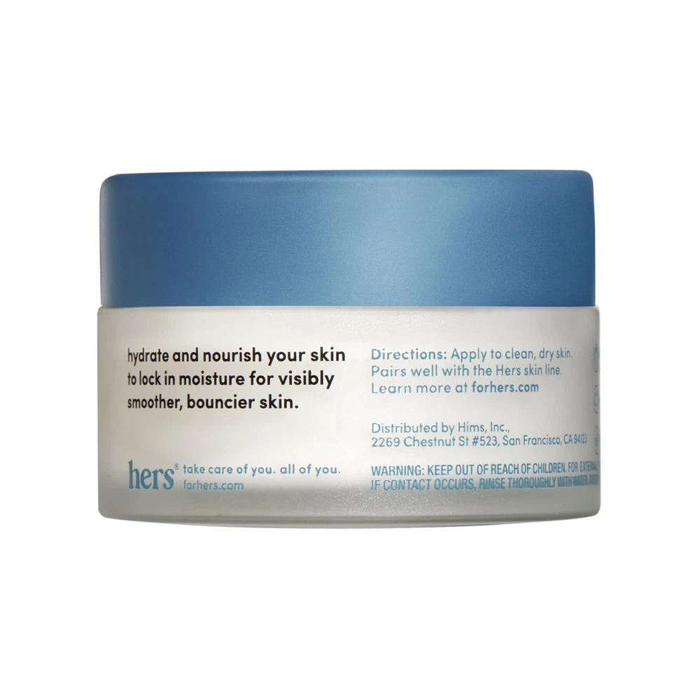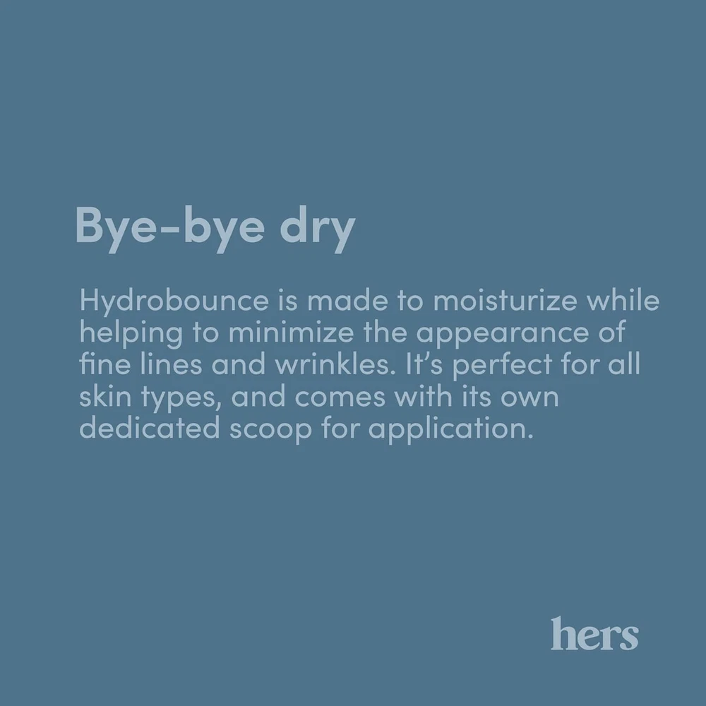Hers Hydrobounce Instant Moisturizer - Squalane Moisturizer, All Skin Types Product Details HYDRATION: Meet your go-to moisturizer. Formulated for hydration, this lightweight yet ingredient-rich moisturizer supports healthy skin, day and night. Give skin the non-greasy hydration it needs to look and feel bouncy, moisturized, and healthy PLUMPS & SMOOTHES: Dermatologist-trusted ingredients that deeply nourish and hydrate. Hyaluronic acid helps skin retain moisture, which reduces the appearance of fine lines and wrinkles and promotes plump, healthy skin STRENGTHENS SKIN BARRIER: This paraben-free, cruelty-free, vegan formula contains Squalane which helps strengthens the skin barrier and helps with moisture retention for a plump and bouncy complexion SUPPORTS SKIN MICROBIOME: Our Probiotic moisturizer contains balancing microorganisms that help support and strengthen your skin microbiome USE DAY & NIGHT: Apply in the morning after cleansing or at night after cleansing to protect the skin’s natural barrier from irritation Product Description Item Volume 1.7 Fluid Ounces Active Ingredients hyaluronic acid,squalane Age Range (Description) Adult Special Feature Lightweight Package Dimensions 2.95 x 2.8 x 2.32 inches; 6.74 ounces Size 1.7 Fl Oz (Pack of 1) 2.8 inches x 2.95 inches x 2.32 inches. Weight: 6.74 oz Payment Details We accept all payments via Ebay using Credit Cards , PAYPAL , Apple Pay and many others Shipping Details We are always working hard to ensure your package arrives as soon as possible. Please understand that some factors like weather, high postal traffic, and the performance of shipping companies are outside of our control. Delivery & Return Policy Details We offer a 30-Day Return Policy on items in which you are not completely satisfied with. You have the option of a full-refund or an exchange of the item. No returns are available on items shipped outside of the USA.