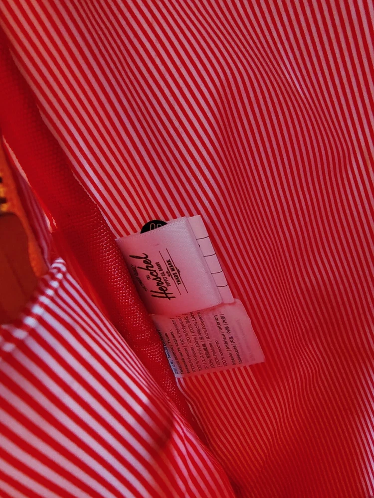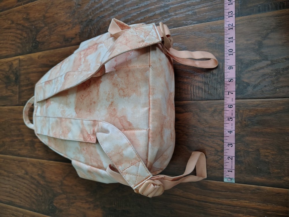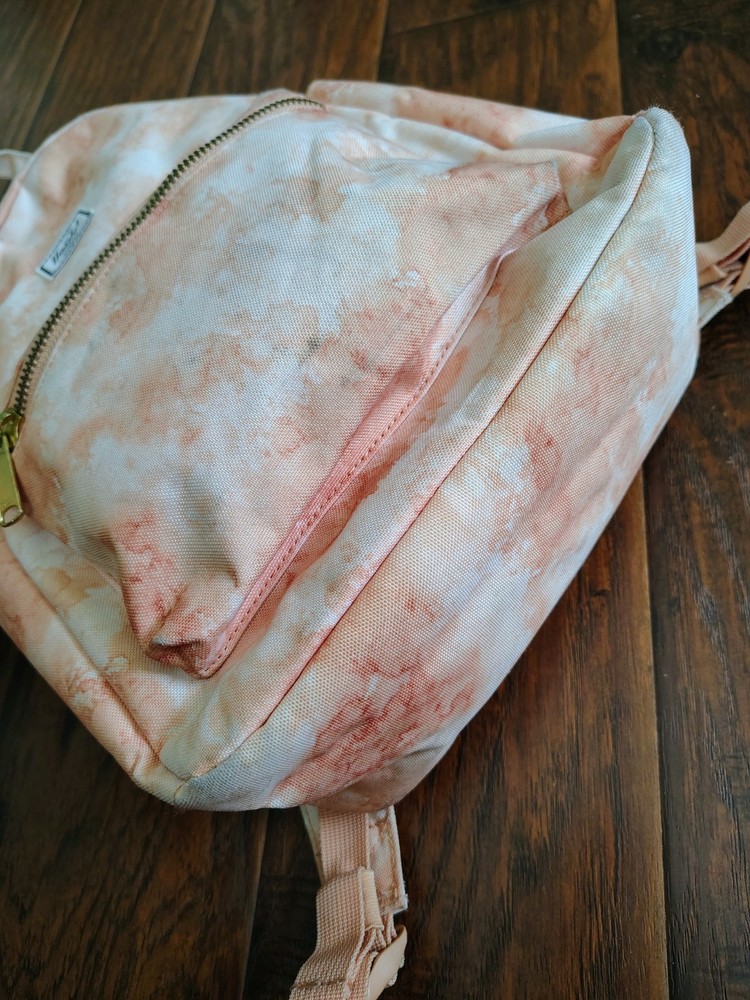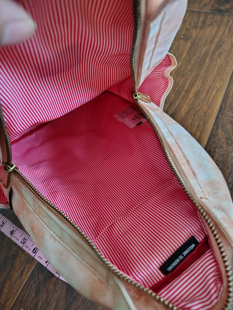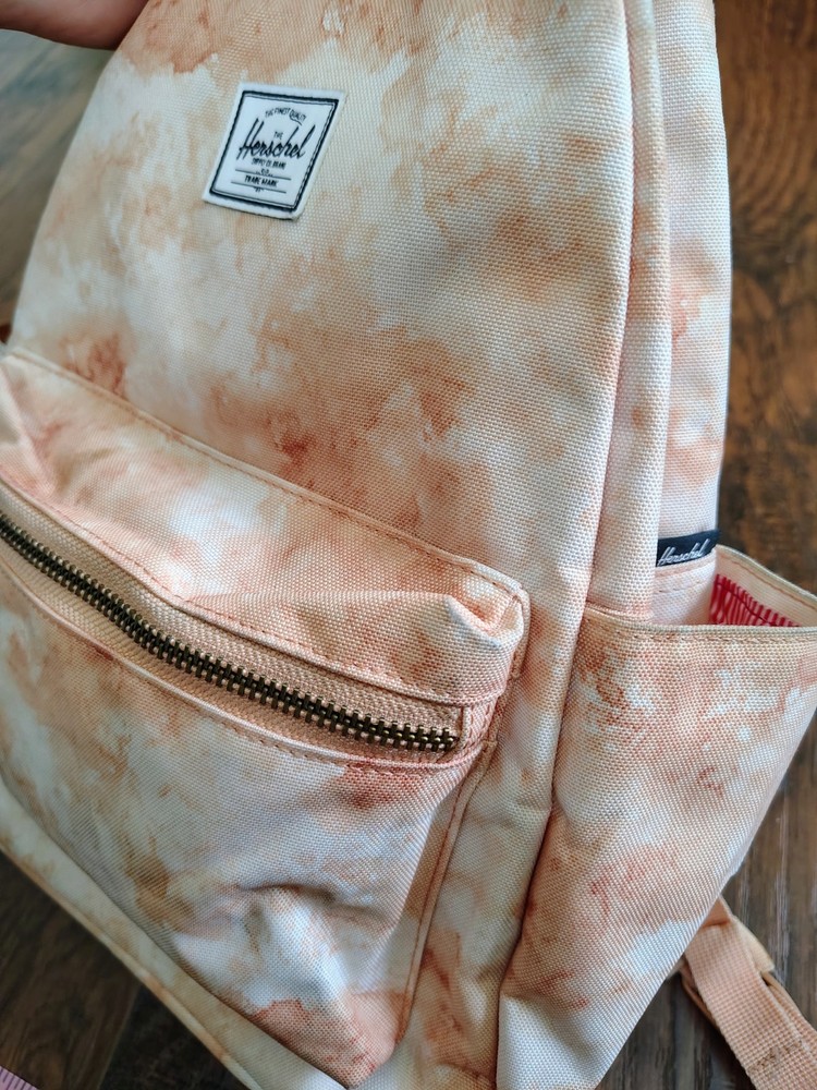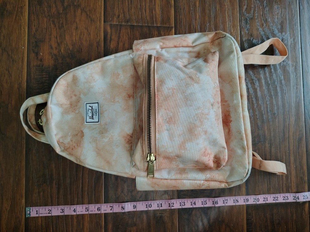 The Herschel Supply creamsicle tie dye small backpack. 2 handles on top. Red and white striped interior. Zipper functional. No holes. Some signs of wear on bottom as pictured.