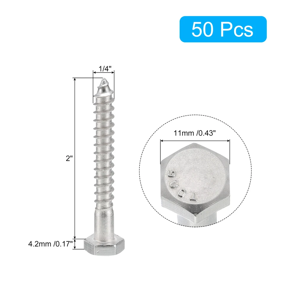 Document 1. Hex lag screws, also known as lag bolts, are wooden fasteners commonly used in construction projects such as building decks, fences, docks, bridges and other outdoor structures. They are hexagonal in shape with a pointed tip and have coarse threads making them strong and durable. They have a high level of holding power and are resistant to vibration and loosening.2. Made of 304 stainless steel material, which is corrosion-resistant and oxidation-resistant, ensuring that the bolts can withstand pressure and tension without deformation or breakage. The pickling passivation surface treatment gives the bolts a clean, beautiful and shiny finish.3. The hex self-tapping screws can be installed quickly and easily with a socket wrench or a hex wrench.4. Hex head lag screws can be used in a variety of applications including wood to wood, wood to concrete, and other heavy construction projects such as bridge building, dock building, deck building, shelving, furniture building, etc.Tips: To prevent splitting, drill a guide hole slightly smaller than the screw.Specification:Material: 304 Stainless SteelSurface Treatment: Pickling PassivationThread Size: 1/4" x 2"Threads Per Inch: 20Hex Head Size: 11 x 4.2mm / 0.43" x 0.17"(W*T)Package Content: 50pcs x Hex Lag Screws Hex Head Lag Screws Bolts, 50pcs 1/4" x 2" 304 Stainless Steel Wood Screws 1. Hex lag screws, also known as lag bolts, are wooden fasteners commonly used in construction projects such as building decks, fences, docks, bridges and other outdoor structures. They are hexagonal in shape with a pointed tip and have coarse threads making them strong and durable. They have a high level of holding power and are resistant to vibration and loosening. 2. Made of 304 stainless steel material, which is corrosion-resistant and oxidation-resistant, ensuring that the bolts can withstand pressure and tension without deformation or breakage. The pickling passivation surface treatment gives the bolts a clean, beautiful and shiny finish. 3. The hex self-tapping screws can be installed quickly and easily with a socket wrench or a hex wrench. 4. Hex head lag screws can be used in a variety of applications including wood to wood, wood to concrete, and other heavy construction projects such as bridge building, dock building, deck building, shelving, furniture building, etc. Tips: To prevent splitting, drill a guide hole slightly smaller than the screw. Specification: Material: 304 Stainless Steel Surface Treatment: Pickling Passivation Thread Size: 1/4" x 2" Threads Per Inch: 20 Hex Head Size: 11 x 4.2mm / 0.43" x 0.17"(W*T) Package Content: 50pcs x Hex Lag Screws Hot Item Payment 1.We accept eBay payment . 2.Payment must be received within 7 business days of auction closing. Shipping 1.We ship to your eBay or Paypal address. Please make sure your eBay and Paypal address is correct before you pay. 2.Items will be shipped within 1-3 business day when we received payment. 3.Delivery time depends on destination and other factors. Description Policy Hex Head Lag Screws Bolts, 50pcs 1/4" x 2" 304 Stainless Steel Wood Screws 1. Hex lag screws, also known as lag bolts, are wooden fasteners commonly used in construction projects such as building decks, fences, docks, bridges and other outdoor structures. They are hexagonal in shape with a pointed tip and have coarse threads making them strong and durable. They have a high level of holding power and are resistant to vibration and loosening. 2. Made of 304 stainless steel material, which is corrosion-resistant and oxidation-resistant, ensuring that the bolts can withstand pressure and tension without deformation or breakage. The pickling passivation surface treatment gives the bolts a clean, beautiful and shiny finish. 3. The hex self-tapping screws can be installed quickly and easily with a socket wrench or a hex wrench. 4. Hex head lag screws can be used in a variety of applications including wood to wood, wood to concrete, and other heavy construction projects such as bridge building, dock building, deck building, shelving, furniture building, etc. Tips: To prevent splitting, drill a guide hole slightly smaller than the screw. Specification: Material: 304 Stainless Steel Surface Treatment: Pickling Passivation Thread Size: 1/4" x 2" Threads Per Inch: 20 Hex Head Size: 11 x 4.2mm / 0.43" x 0.17"(W*T) Package Content: 50pcs x Hex Lag Screws Hot Item Payment 1.We accept eBay payment . 2.Payment must be received within 7 business days of auction closing. Shipping 1.We ship to your eBay or Paypal address. Please make sure your eBay and Paypal address is correct before you pay. 2.Items will be shipped within 1-3 business day when we received payment. 3.Delivery time depends on destination and other factors.