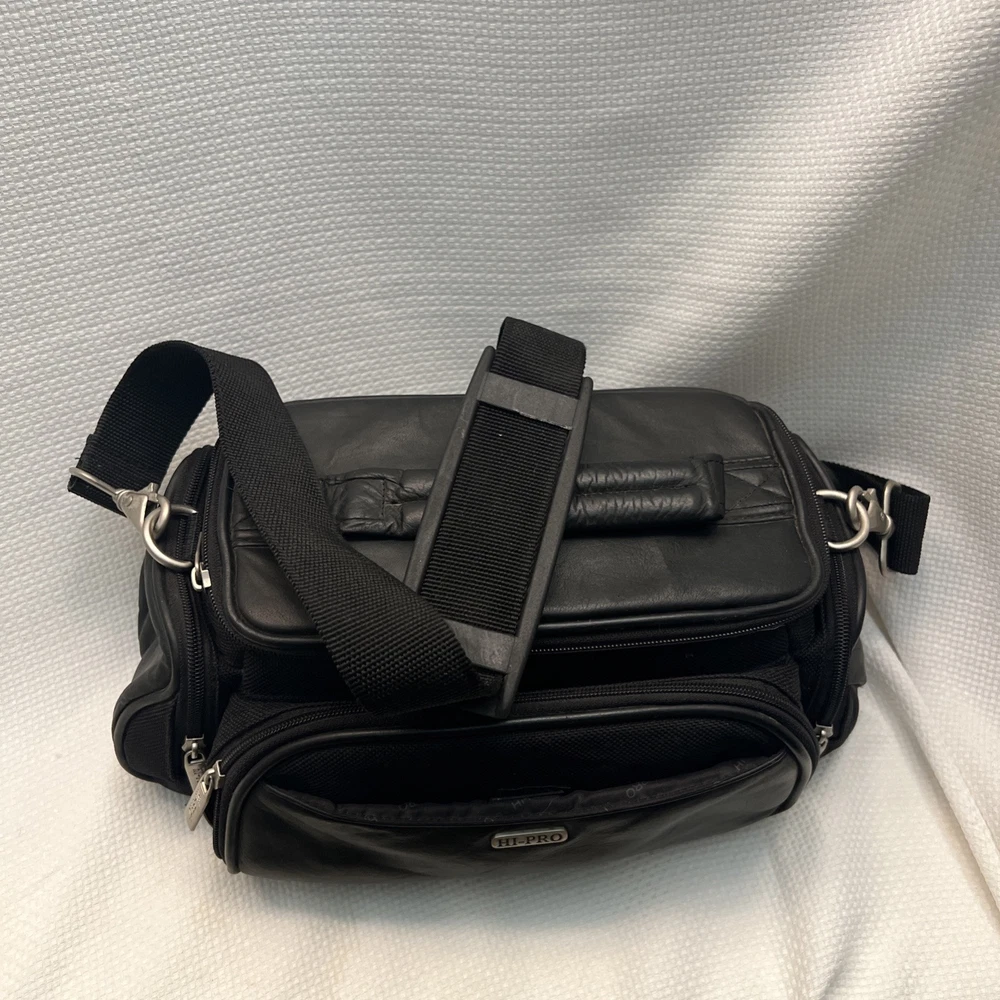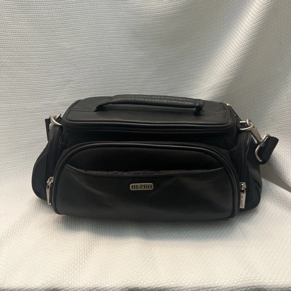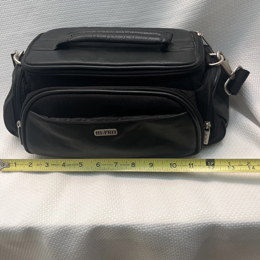 This is a Hi-Pro camera and camcorder storage bag made of black genuine leather. It is compatible with Canon, Sony, and universal brands, sized for standard camcorders. The bag has external dimensions of 13 x 6 x 6 inches and features padded compartments with a strap for accessories. It is designed to fit various types of cameras and camcorders, including compact, DSLR, and point & shoot models.