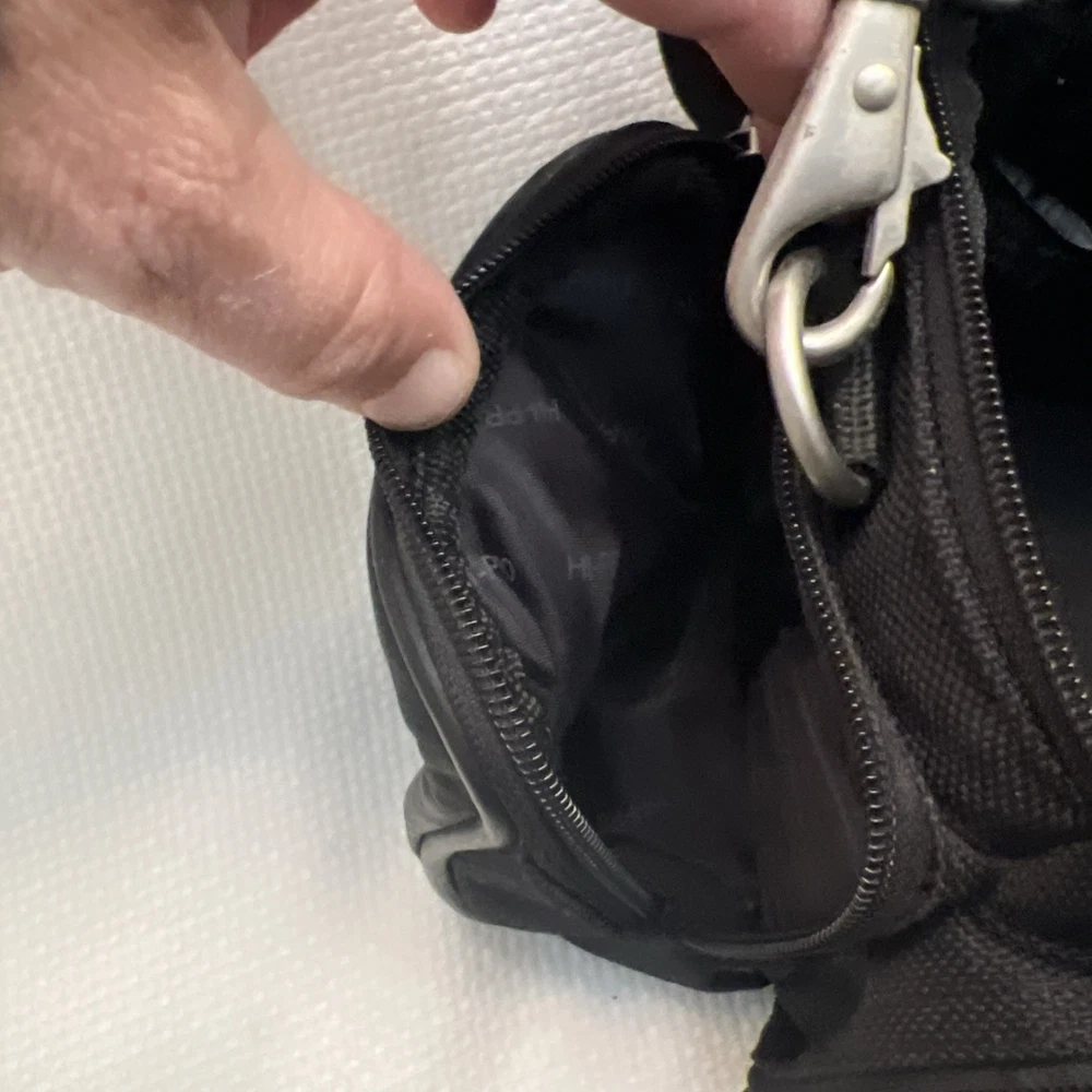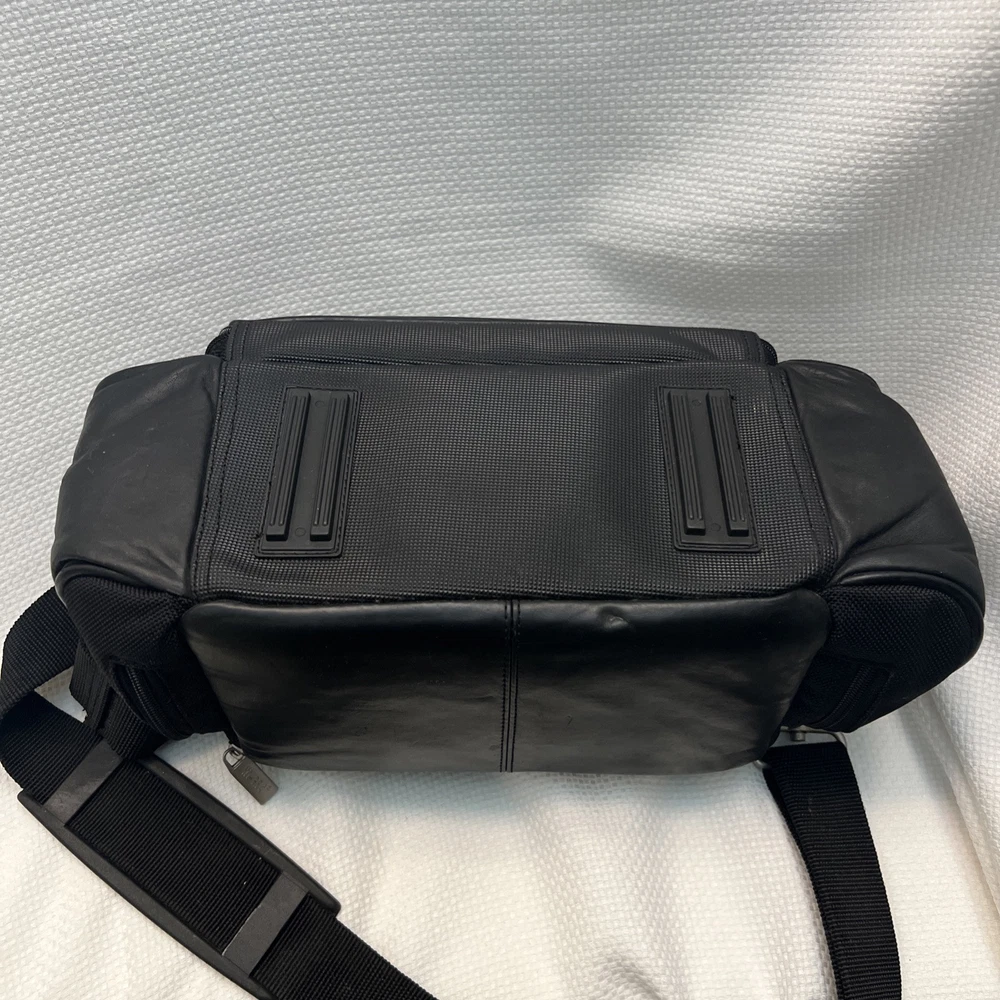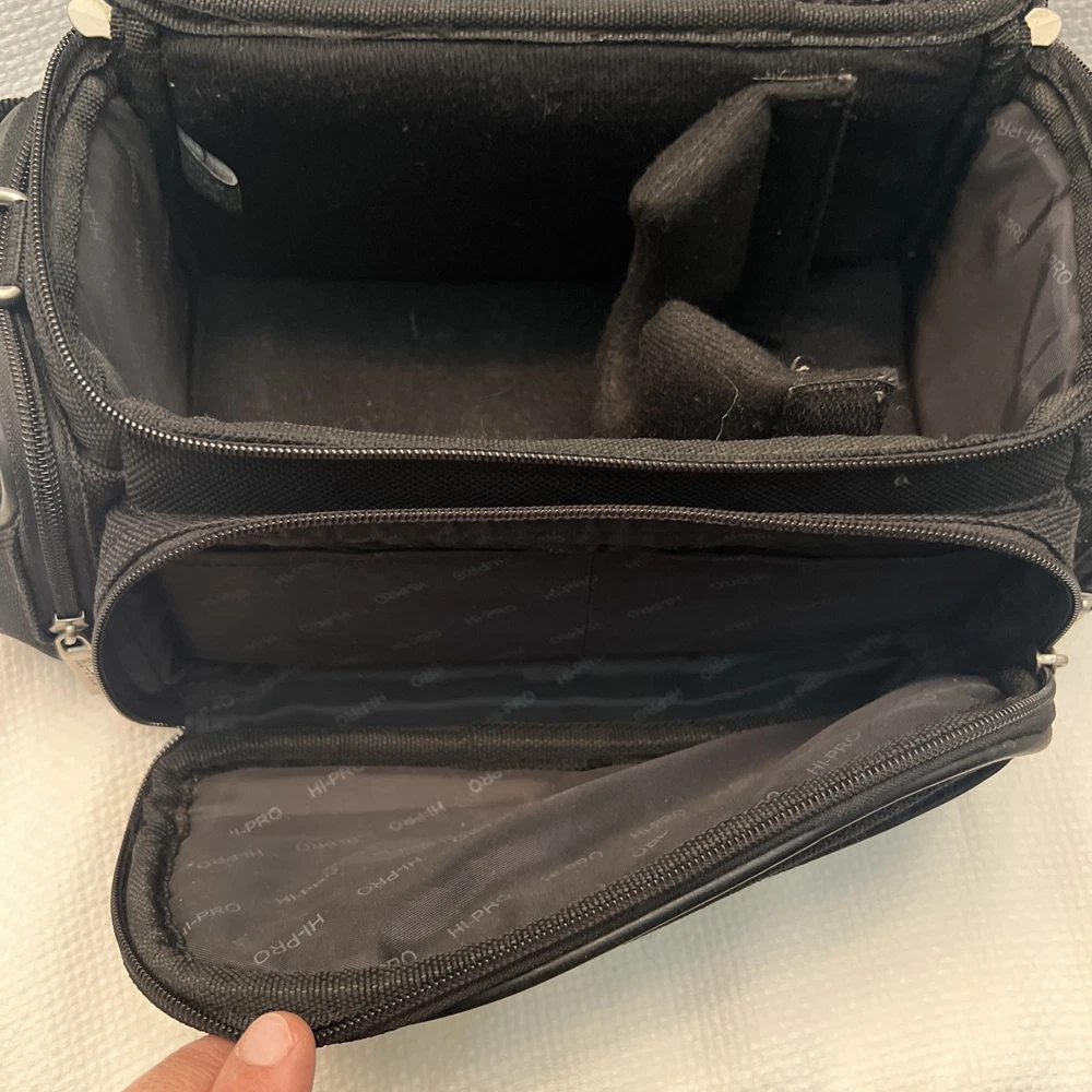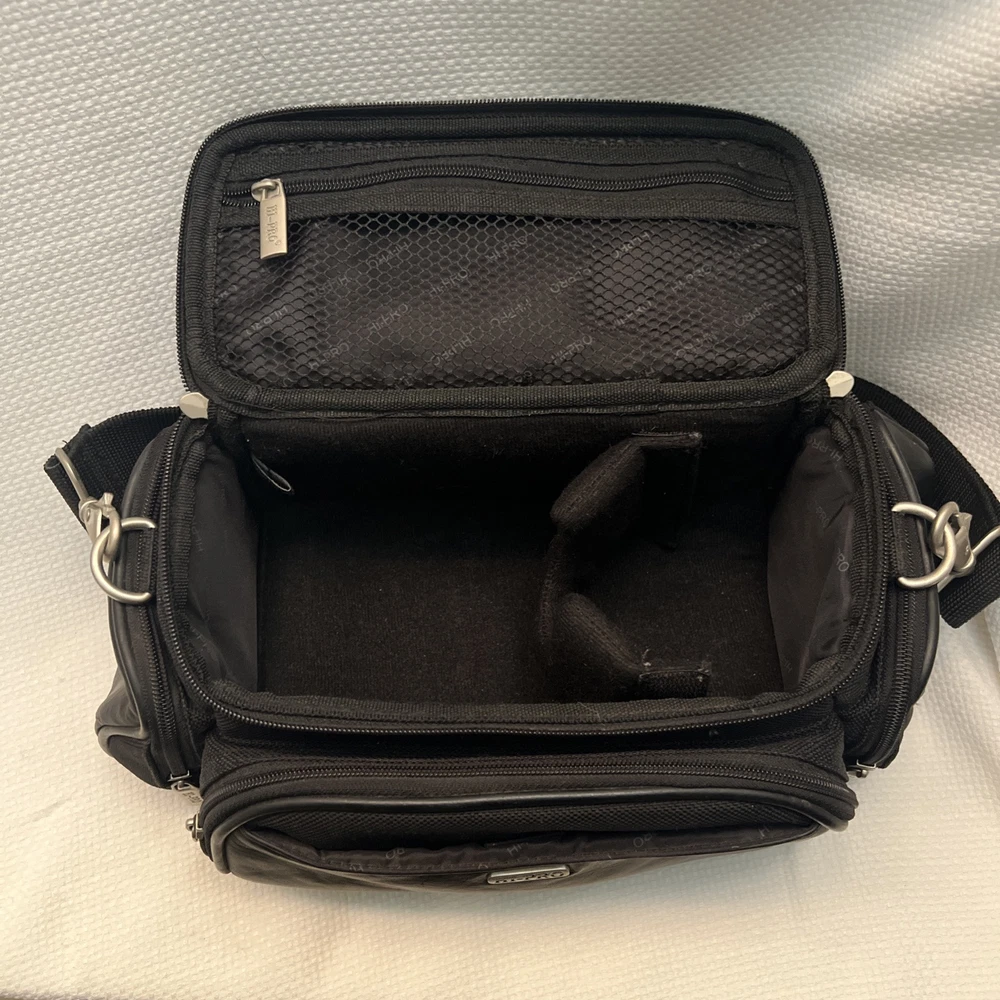 This is a Hi-Pro camera and camcorder storage bag made of black genuine leather. It is compatible with Canon, Sony, and universal brands, sized for standard camcorders. The bag has external dimensions of 13 x 6 x 6 inches and features padded compartments with a strap for accessories. It is designed to fit various types of cameras and camcorders, including compact, DSLR, and point & shoot models.