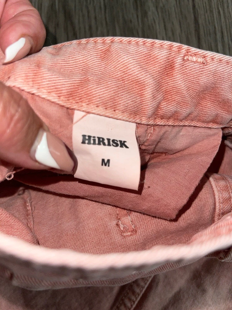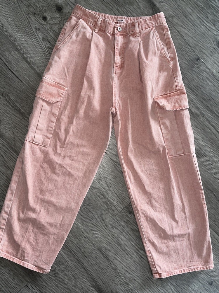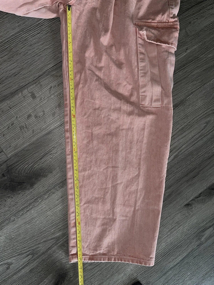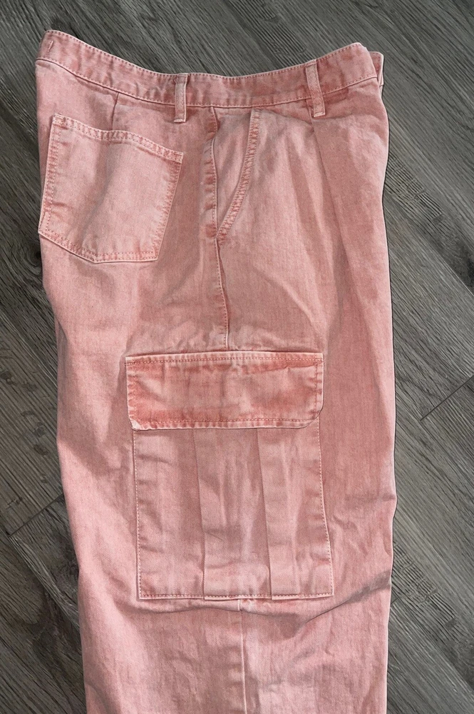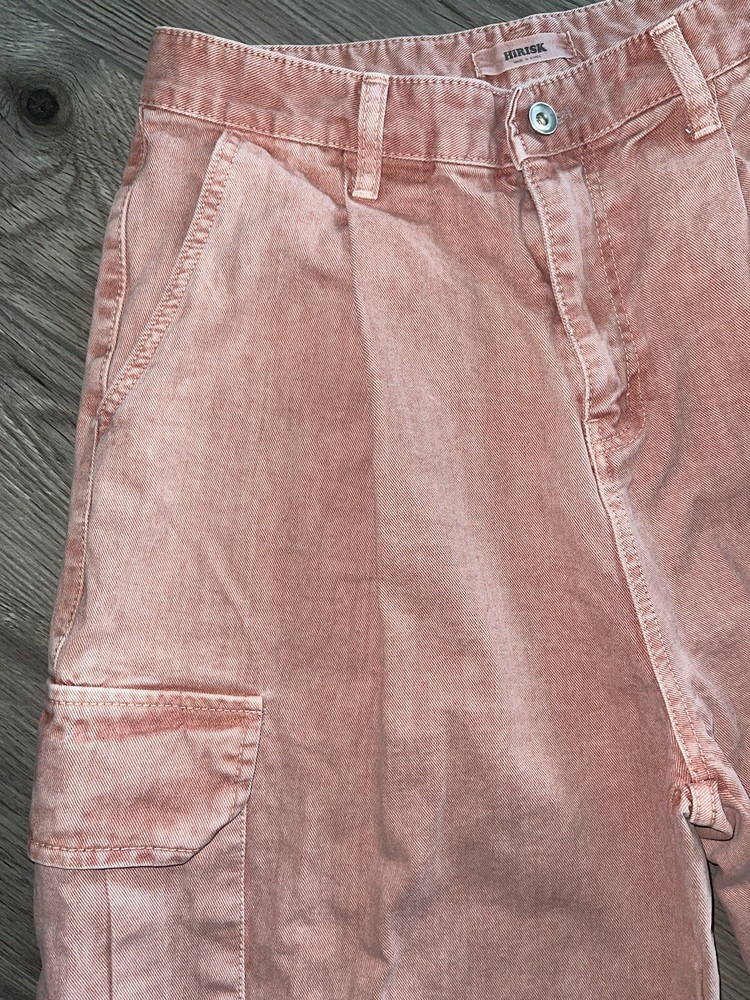 Excellent used condition HiRisk Men’s Wide Leg Cargo Denim Pants Size Medium . Super cool and stylish and wide leg Pinkish/Soft red cargo jeans . They are described as pale pink but I see it as a very dull red lol . Great condition with the exception of the he on the bottom back As shown in the photos.