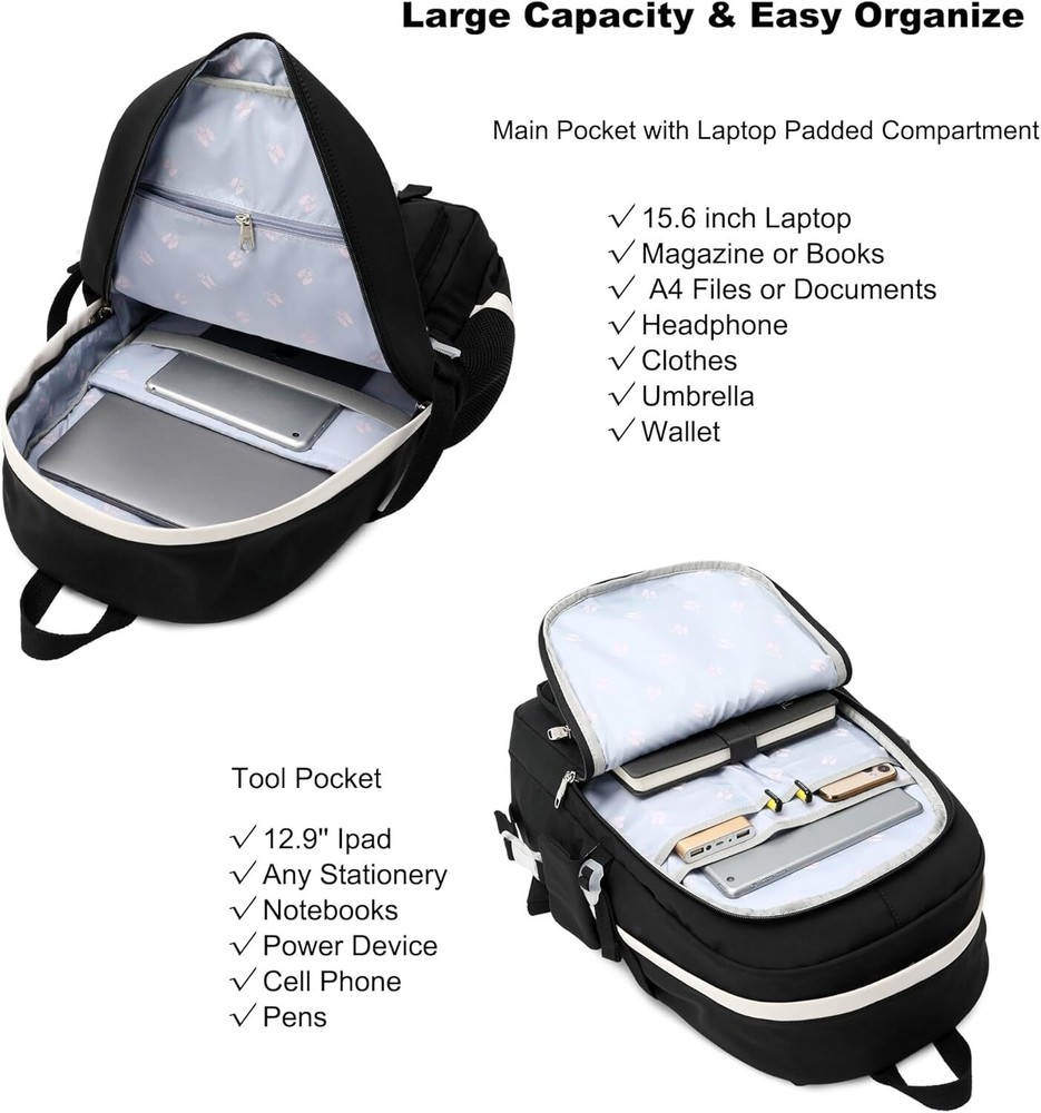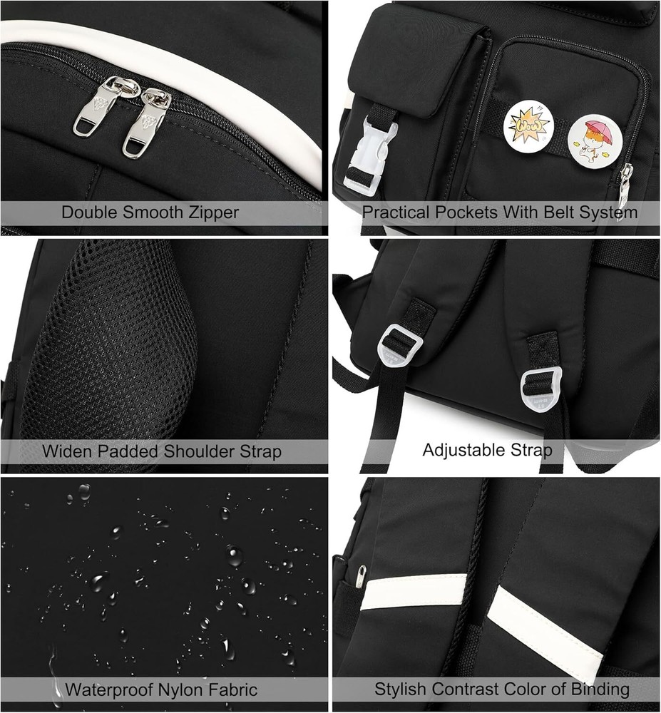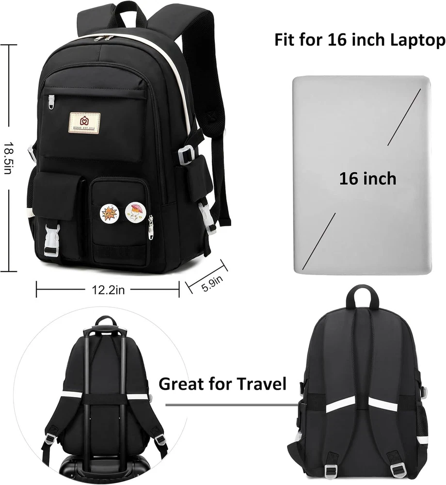 Hidds Laptop Backpacks 15.6 Inch School Bag College Backpack Anti Theft Black Product Details 【Large Size & Gift】: The size of back pack is 13.8"x7.5"x17.8"(L*W*H), Weight:1.65 LB. The laptop bag with padded compartment sleeve fit for 13.3,15.6 ,16.1 inch tablet. This bag sacks also along with fluffy ball key pendant and personality badge as gift makes the bags more fashionable and unique 【Waterproof Material &Smooth Zipper】: The campus backpack is made of waterproof, ultra-lightweight, high density nylon fabric and cute printing polyester lining. The metal zippers closure are used by the premium quality zippers to ensure the long-lasting usage 【Safety & Comfortable 】: The considerate belt on the both side can create a solid base of support if you’re packing a lot of stuffs on the back packs. The Widen and thicken durable S-shape straps is well-padded, adjustable and comfortable to carry. The luggage belt on the back can be fitted on luggage/suitcase to make your travel more convenience 【Multi-compartments & Large Capacity 】: The big bookbag has 5 separate different size pockets and two side pockets meet your daily storage. The front three pockets can hold charge device and other small items, convenient for your daily organization. The main pocket of includes laptop padded sleeve with elastic belt and hidden inner zipper pockets. The front tool pockets also come with multiple compartments to provide roomy space for necessities 【For Any Ages & Occasion】 The waterproof backpack purse is stylish enough for casual and student use, while the design provides the multi functionality. Backpack perfect for young teens, girls, ladies. The basic multipurpose daypack for most of your needs, easy to match your cloths, suitable for short trip, work, shopping, university, school, etc.