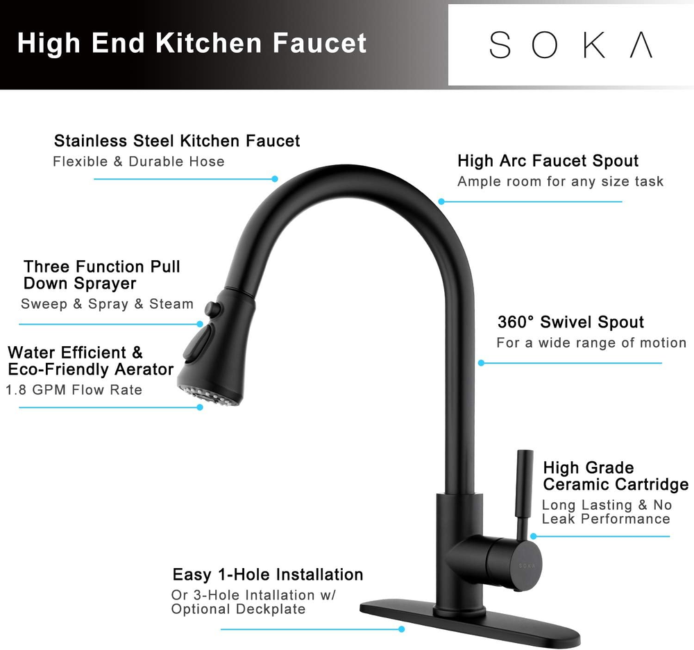 Store New Arrivals Add to Favorite View Feedback Contact Commercial Kitchen Sink Faucet with Pull down Sprayer High Arc Fit for One & 3 Hole W/Deck Plate Single Handle Industrial Style Matte Black Description Item model number SK5002PA Style kitchen faucet Spout Height 6.5 Inches Hole Count 3 Spout Reach 10 Inches Warranty Description lifetime Hose Length 25 Inches Batteries Included? No Usage Bar, Inside, Outside, Laundry, Garage Sink Handle Location Right Number of Pieces 1 Batteries Required? No Finish Matte Black Product Dimensions 24.41"D x 2.95"W x 13.58"H Material Stainless Steel Shape Gooseneck Installation Type Single-Hole, Deck-Mount, Screw-In Model Name kitchen faucet Finish Type Matte Black Included Components Sprayer, Deck Plate, Installation Hardware Item Package Quantity 1 Spout Design Single Handle Number of Handles 1 Cutting Diameter 1.25 Inches Item Weight 1.5 pounds Is Electric No Special Features Water efficient, 360-Degree Rotation, Easy Installation, Kitchen faucet, Multifunctional Sprayer Modes Assembled Diameter 1.25 Inches Special Feature function(f) {var _np=(window.P._namespace("DetailPageProductOverviewTemplatesJava"));if(_np.guardFatal){_np.guardFatal(f)(_np);}else{f(_np);}}(function(P) { P.when('A').execute(function(A){ A.on('a:truncate:po-attribute-truncate-9:updated', function(data) { var isTruncated = !data.truncateInstance.getIfTextFits(); var seeMoreElement = document.getElementById('po-attribute-see-more-id-9'); if(seeMoreElement) { seeMoreElement.style.display = isTruncated ? '' : 'none'; } }) }); })); Water efficient, 360-Degree Rotation, Easy Installation, Kitchen faucet, Multifunctional Sprayer Modes See more Part Number SK5002PA Mounting Type screw-in Certification WaterSense Color Matte Black Handle Material Stainless Steel Recommended Uses For Product Kitchen Handle Type Lever Size Upgrade AQUABLADE Design - Spout Height 8", Spray Reach 9", Faucet Height 16.4", Spout Reach 10".Specially designed pull down sprayer creates a forceful blade of water, more powerful than spray mode. Now it is very convenient to sweep away stuck-on food from your dishes or directing food and dirt from sink corners to the drain. Three Working Modes & Pull Down Sprayer Head - Our kitchen faucet with 3 flow setting (STREAM/ SPRAY/ SWEEP), stream for filling water,spray for strong cleaning wash, powerful sweep blade to clean dishes. The Kitchen Faucet Sprayer Head is Neoperl ABS areator wich can be removed by a coin easily for clean and . Easy to Set Up - The kitchen faucet easy to setup in few minutes with the install manual. The single handle sink faucets package include all the accessories, thoughtful packaging independently designed, full sponge wrapping protects all accessories from damage, these kitchen sink faucet is the perfect partner for you. Sturdy & Rust Resistant -Our single handle kitchen faucet made of 304 stainless steel, high quality ceramic cartridge has passed 1000,000 cycle testing to ensure that it will lasting over 20 years. Superior corrosion & rust-resistant finish prevent dirty from sticking to faucet surface, clean faucet by cloth is enough in Daily Use. Elegant Design & Easy to Match - Kitchen faucet with sleek industrial style offer contemporary good looks, the pull down sink faucet was very easy matching with the rest of your furniture.Proper faucet size and water outlet angel fit most of sinks,save your time to make choice. About Manufacturer: We has been specialized in kitchen supply for more than a decade. We focus on item quality, function,material, and style to make personalized kitchen product more available to users. We provide affordable and durable items to realize 100% customer satisfaction. Product Feature: √Enjoy unparalleled value of the modern convenience and flexibility of put-out kitchen faucet. √Easy to install with a wrench, no need plumber, save money and time. √Durable: Brushed Nickel Finish, resists tarnish and corrosion from daily use √Pull Out Sprayer and 360 Degree Rotation: Offer more room pots/pans and superior clearance for sink. √Three function spray wand allows you to easily and ergonomically switch from spray to stream to sweep.(Higher pressure when spraying,less splashing). √Stainless steel kitchen faucet include eco-friendly,lead-free materials,complied with NSF/AB1953 lead-free regulation, and certified by IAMPO, assure your family healthy. Product Specifications: -Material: Solid Stainless Steel -1 or 3 hole installation -Overall height: 16.4" -Spout Height: 8" -Spout Reach: 9" -Stainless steel deck plate:10" -Sprayer Head:ABS Plastic -Handle Material: Zinc Alloy -Valve: Ceramic Valve -Water Mode: Stream/Spray/Sweep Package Including: 1 x Kitchen Faucet 1x hot and cold inlet water pipe 1x Installation instruction After-sales commitment: Any quality problem within the first month, you can get full and a new kitchen faucet. Any quality problem within 1 month, you can get a new product. Any product issues, please feel free to through . We will reply within 24 hours. We always strive for 100% product satisfaction. ABOUT US We offer the best prices around on high quality products. Our E-store includes media such as books, movies, music and games while offering electronics, toys, sporting apparel, clothing, tools, general home, garden items and more. SHIPPING We are always working hard to ensure your package arrives as soon as possible. Please understand that some factors like weather, high postal traffic, and the performance of shipping companies are outside of our control. We offer free shipping to the lower 48 states and ship within 2 business days of payment, usually sooner. We do not accept P.O. Boxes. Please provide a physical address. For shipping outside of the continental USA, we only use eBay's Global Shipping Program.The item is shipped to KY and then sent to the rest of the world. International customers are responsible for all duties and taxes. Continue to check out in order to calculate cos
