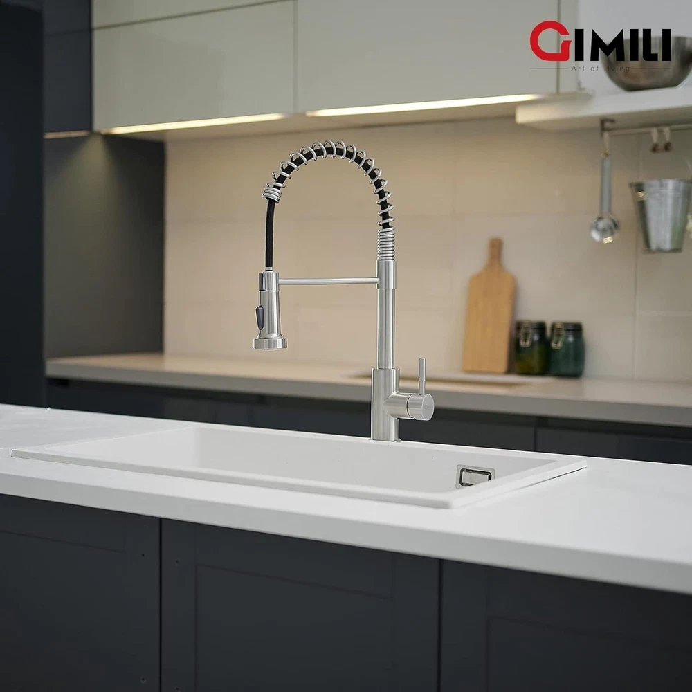 Kitchen Faucet with Pull Down Sprayer High Arc Single Handle Spring Kitchen Sink Faucet Brushed Nickel Modern Stainless Steel Kitchen Faucets High Quality Design:The brushed nickel sink faucet has exquisite special solid brass body design ,rust-resistant finishing. Two Function Sprayer: Kitchen sink faucets setting (STREAM, SPRAY), stream for filling water, spray for rinsing, providing stable water pressure, makes cleanup now on it will create a different kitchen cleaning experience. Flexible to Operate: High arc 360 degree swivel spout for full sink access, pull down sprayer to avoid splashing. It suitable both single bowl and double bowl kitchen sink. Also single handle design make its easy control the hot&cold water and flow volume. Easy to Clean: Brushed nickel finish & surface transition design prevent dirty / water stain from sticking to faucet surface, only cleaning faucet by cloth is enough in Daily Use. What will you get: we have the best team online at any time, and the professional after-sales team can solve any problems about the faucet for you.