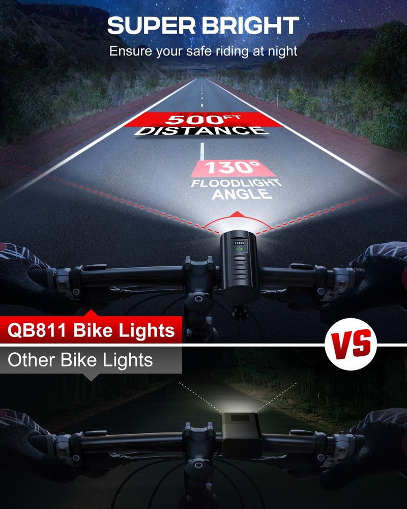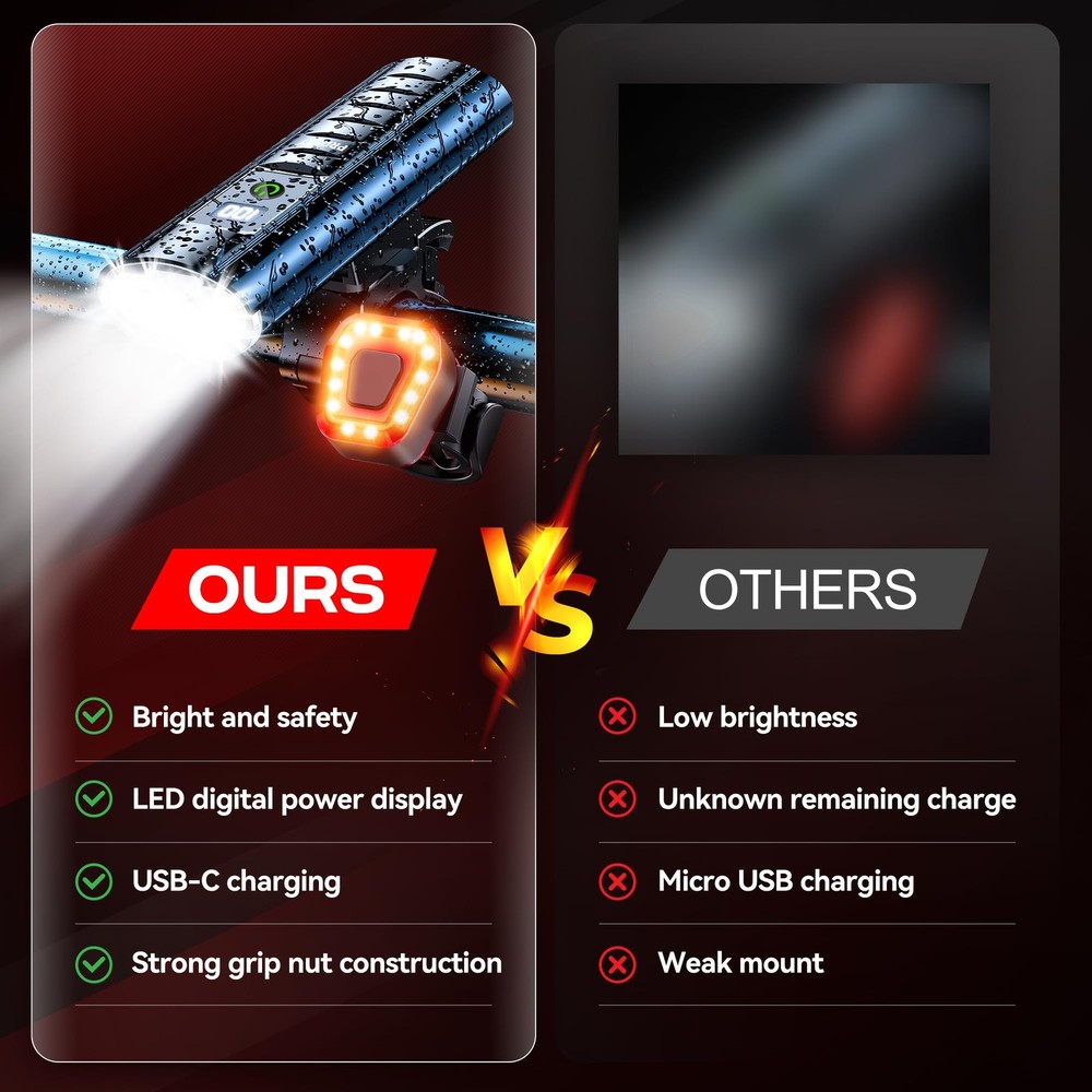 1. Bright, extra wide, long-range beam, improves visibility. This front and rear rechargeable LED bike light kit allows you to ride safely and stay visible day and night. The bright high lumen headlight and taillight emit powerful beams that caution approaching cars and pedestrians from all angles. 2. 6+5 Multiple Light Modes The headlight has 6 lighting modes: strong/medium/low brightness/fast flash/SOS/slow flash. Quickly double-click the headlight power button for flashing modes. The taillight has 5 lighting modes: running/cycling/breathing/fast/slow flash. 3. Bike light with battery display, lets you know your battery level at any time, making sure you don't lose light when riding at night suddenly. 4. Designed with an all-metal body and IPX65 waterproof rating, you can rely on these flashlights in the rain as well as dirt road conditions. Versatile, durable, and easy to use, this set is the best safety lighting combination for more than just biking. Use it during running, hiking, camping, dog walking, night activities, power outages, etc. Mount it to a scooter, stroller, or wheelchair, or even use it with your helmet in place of a headlamp. And can be used as an emergency flashlight, and put in the car, basement, attic, and emergency kit. 5. It can be installed and removed without tools. High Brightness and Securely Lock: 's high-performance bike lights have a maximum output of high lumens, reaching distances of up to 500ft with a wider angle view, illuminating the road as you ride at night. The bicycle lights front and rear can be securely and easily installed in seconds without the need for any tools. C-clamp handlebar brackets are more stable and durable than other rubber straps 6+5 Light Modes: The bike front cycling lights features a one-touch switch with 6 different lighting modes to suit your needs, including strong/medium/low brightness, fast flash, SOS, and slow flash. The taillight includes 5 different lighting modes: running/cycle/breathing light and fast/slow flash, designed to alert following cars or people. You must double-click the bike headlight switch to enter flashing modes quickly Long Runtime and LED Screen: Our bicycle light is equipped with a 5000mAh large capacity battery. It operates for over 10 H in low brightness mode, catering to your extended riding lighting requirements. Featuring an LED display, you can easily monitor the battery level and avoid the concern of running out of power Military Grade and IPX65 Waterproof: The LED road bike light is crafted with a premium aluminum alloy shell, offering excellent impact resistance and heat dissipation, ensuring durability and longevity. The bike lights for night riding with an IPX65 water-resistant rating, you can enjoy cycling even in rainy, snowy or foggy conditions Versatile, More Than Bike Accessories: This bicycle headlight integrates a USB port for emergency phone charging, ensuring backup power during rides. It can be widely used in various scenarios as emergency flashlights. Use mountain bike lights front and back while cycling, hiking, running, camping, walking pets, or some emergency situations What You Will Get: Bike headlight*1, bike taillight*1, type-c to USB cable*2, user manual*1, bracket*2. Replacement of the mount within 1 year. For your best experience, please fully charge the bike lights front and back before your first use. Recommended to use a 5V-1A or 5V-2A charging device to charge this bike light