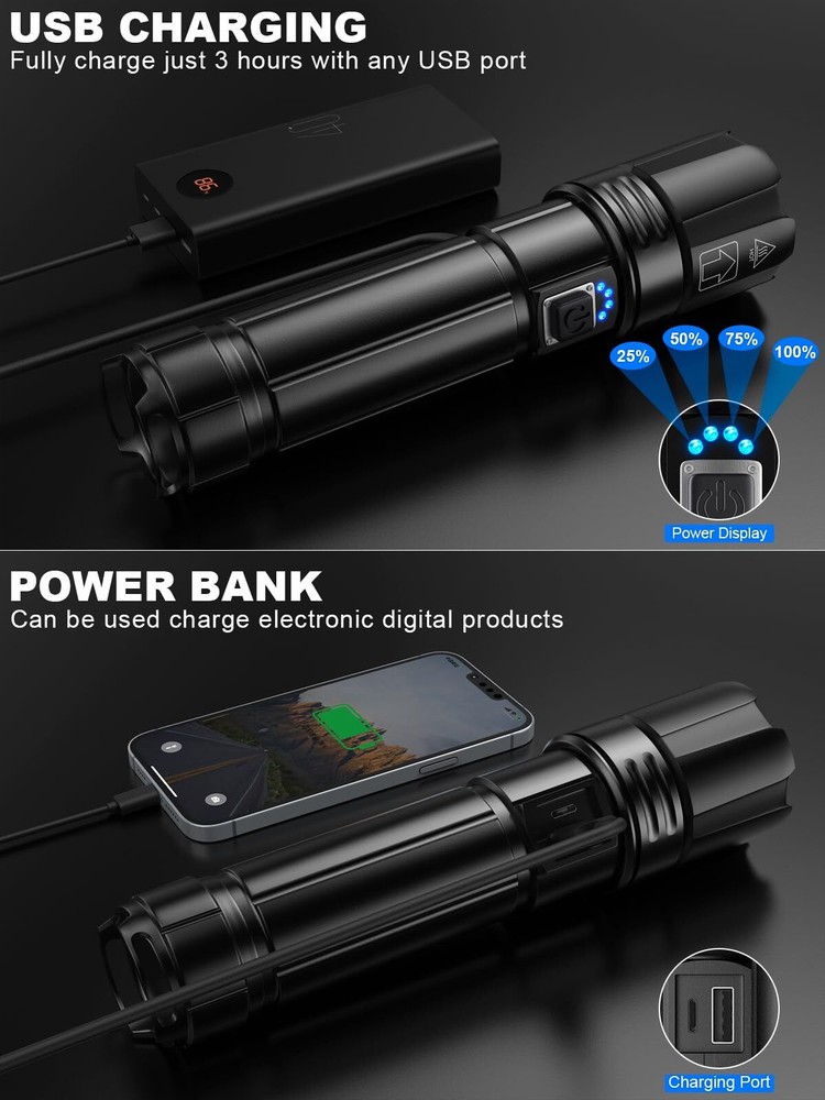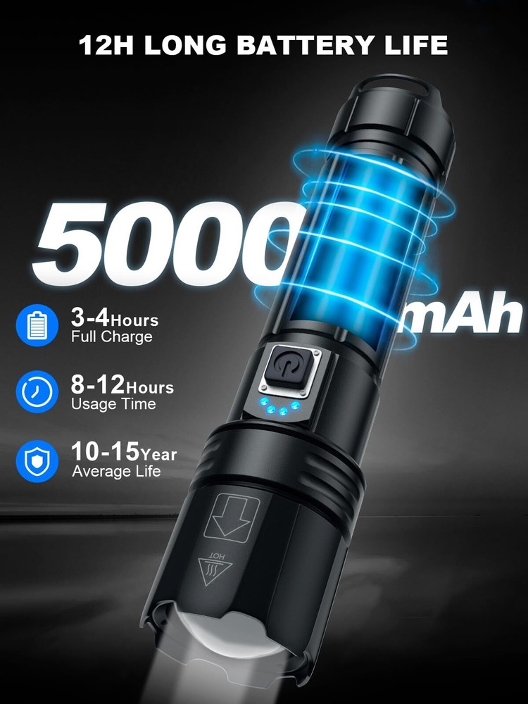 【Super Bright & Comfortable Experience】GOHOMAN super bright flashlight can achieve a maximum output of 900000 lumens, with constant brightness and no flicker, providing a comfortable visual experience. The LED flashlight has USB fast charging, IPX6 waterproof, and anti-drop function. simple use method, and is easy to carry. 【USB Rechargeable & Energy Conservation】LED flashlight high lumen rechargeable with a large capacity of 5000mAh Βattery (included) uses USB for fast charging, which is very energy efficient and environmentally friendly. Flashlights usually take 3-4 hours to charge and can be used for 8-12 hours, with each power state representing 25%. 【5 Lighting Modes & Adjustable Focus】Our high-lumen rechargeable flashlight comes in 5 modes (high/medium/low/flash/SOS), press the 3S button to turn off all modes. The brightest flashlight ever made has adjustable focus, and we have adjusted the grid lines to a maximum range of 3280 feet for clearer remote viewing. 【High-Quality Materials & IPX6 Waterproof】2 Pack flashlights are made of high-quality aviation aluminum and can withstand a drop of 10 feet. The surface has undergone hard oxidation and wear-resistant treatment, making it easy to dissipate heat and waterproof. It is very suitable for home, fishing, patrolling, work, power outages, hiking, camping, or as a gift for family. 【A pleasant experience】GOHOMAN ultra bright flashlight will bring you a comfortable experience. We always value quality, integrity, and dedication. If you receive a defective flash light, please contact us.