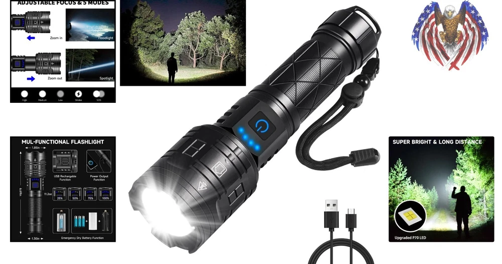 High Power 990000L Tactical Flashlight - Adjustable Modes, USB Rechargeable ‹ › ‹ › ‹ › ‹ › ‹ › ‹ › ‹ › ‹ › ‹ › High Power 990000L Tactical Flashlight Adjustable Modes, USB Rechargeable Features: Unmatched Brightness: Equipped with a cutting-edge P70.2 LED chip, this flashlight produces an astounding 990,000 lumens of bright light, illuminating an expansive area of up to 1300 ft² or reaching distances of 1500 ft . Long-lasting Performance: Thanks to its upgraded 5000mAh battery , the tactical flashlight offers an incredible 12 hours of continuous use on a full charge, empowering you for extended adventures without worry. Rapid Charging: The flashlight features a Type-C fast-charging port for unprecedented efficiency in recharging, complemented by four power indicators for easy monitoring of battery levels. Versatile Modes: Enjoy five lighting modes including high, medium, low, strobe, and SOS, to adapt your light output to any situation. Adjustable Focus: Easily switch between a floodlight setting for wide-area illumination and a spotlight for long-range visibility by adjusting the flashlight's head. Durability & Multi-functionality: Robust Build: Constructed from aviation-grade aluminum alloy, this tactical flashlight is designed to withstand the elements with an IP67 waterproof rating and shatter-resistant capabilities. Multi-functional Design: Comes equipped with a USB output port to charge your electronic devices, a head cusp designed for safety hammer use, and a dry battery function for emergency situations. What’s Included: 1 * LED Tactical Flashlight 1 * Rechargeable Battery 1 * Type-C Charging Cable 1 * Dry Battery Fix Bracket 1 * Carrying Lanyard 1 * Protective Packing Box Why Choose the High Power Tactical Flashlight? In a world where reliability meets functionality, the High Power 990000L Tactical Flashlight stands out as an essential companion for all your adventures. Whether you're navigating through dark trails, ensuring safety during emergencies, or simply illuminating your surroundings while camping or hiking, this flashlight delivers unparalleled brightness and adjustability. It's not just a flashlight; it's your trusted partner in innovation and safety. Order the High Power Tactical Flashlight today and shine a light on your adventures with confidence! Shipping Free & Fast Shipping - We offer free shipping to most of the USA with a normal delivery time of 3-7 days. However, due to the current situation, additional delivery time (up to 3 weeks) may be required for some items. Alternative Carriers - We may use alternative carriers (e.g. USPS, FedEx, UPS, etc.) to ensure your package arrives safely and on time. Due to the use of multiple carriers, we are unable to provide a tracking number automatically. Handling Time - Orders are processed and shipped within 1-2 business days of receiving cleared payment. Shipping Restrictions - Shipping to Alaska, Hawaii, Puerto Rico, Guam, and other US territories may incur shipping charges or delivery restrictions. Please contact us before ordering, or your order can be refunded/cancelled. State Restrictions - There may be restrictions based on your state of purchase. For example, certain items may not be shipped to California due to state regulations. Contact for Tracking Updates - If you require tracking updates or have any concerns about the delivery of your order, please feel free to contact us, and we will be happy to assist you. Return 30-Day Hassle-Free Returns - We want you to be completely satisfied with your purchase. If you are not, you can return the item within 30 days of receiving it for a full refund or exchange. Easy Return Process - To start a return, simply contact us and we will provide you with a prepaid return shipping label and detailed instructions. Restocking Fee - There are no restocking fees for returns. However, the buyer is responsible for return shipping costs if the return is not due to a seller's error. Refund Processing Time - Refunds will be processed within 5 business days of receiving the returned item in its original condition. Payment We accept all major credit cards, PayPal, and Apple Pay for your convenience. Your payment information is secure and encrypted to ensure a safe and seamless transaction. Please complete your payment within 3 days of purchase to avoid any delays in shipping. Feedback Your feedback is extremely important to us. We strive to provide the best products and customer service possible. If you are satisfied with your purchase, please take a moment to leave us a positive review. If you have any concerns or issues with your order, please contact us before leaving negative feedback. We are committed to resolving any problems and ensuring your satisfaction. Contact Us If you have any questions or concerns, please feel free to reach out to our customer support team. You can contact us through the eBay messaging system. We are available Monday to Friday, 9:00 am to 5:00 pm EST, and we will do our best to respond to your inquiry within 24 hours. Thank you for supporting our small family business! UPC: Not Set Voltage: 5V Item Height: Rechargeable Flashlights Item Length: Rechargeable Flashlights Item Weight: 11.2 ounces Item Width: Not Set Model: Not Set Lumens: 990000 lumens Number of LEDs: 1 Unit Quantity: 1 Features: Rechargeable,Waterproof,Adjustable light modes,Adjustable focus,USB output port,Safety hammer feature,Dry battery function Material: Aluminum,Aviation grade aluminum alloy Brand: Unbranded Type: Flashlight Lighting Technology: LED Power Source: Battery Operating Range: 1500 feet MPN: Not Set Battery Technology: Li-Ion Number of Batteries: 1 Color: Black Country/Region of Manufacture: Not Set IP Rating: IP67 Operating Time: More Than 10 Hours Number of Lights: 1-3 Unit Type: oz Personalize: Not Set