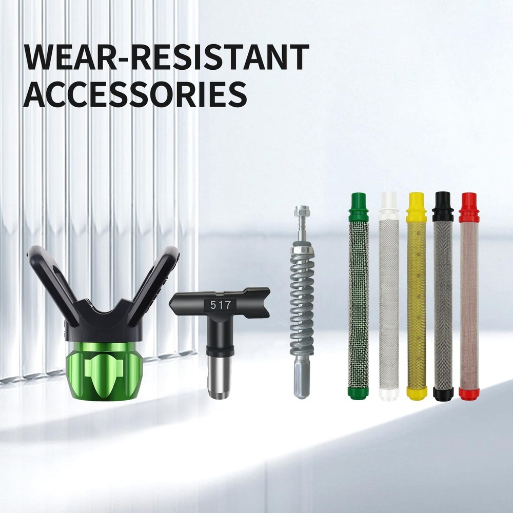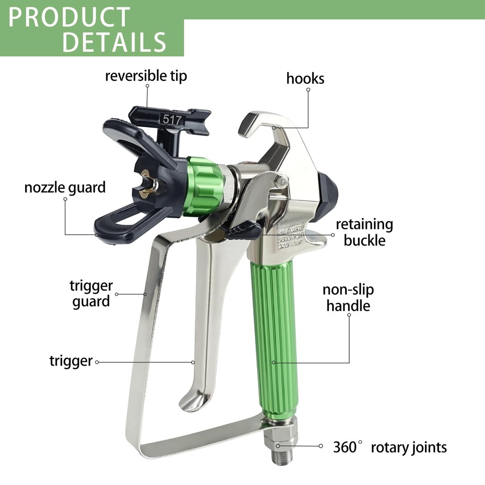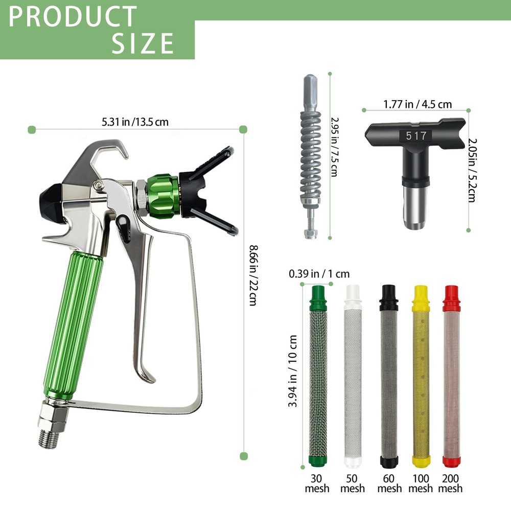 Airless Paint Sprayer Gun Package Quantity: You will get a sprayer gun kit, including a paint spray gun, a 517 reversible spray tip, a tip guard, 5 pcs airless spray gun mesh filters and an abrasion-resistant gun needle. The airless sprayer tool kit can meet your daily spraying needs Quality Materials: Airless gun is made of high quality aluminum alloy, airless nozzle is made of 304 stainless steel handle and tungsten carbide hole; airless nozzle tip guard is made of metal and plastic. Rustproof and wear-resistant, can be used for a long time High Efficiency Spray Gun: Equipped with 3600 PSI high pressure and reversible 517 nozzle , the sprayer gun provides faster, more uniform spraying and saves paint. The 60 mesh gun filter can filter paint and reduces nozzle clogging. Safety lock design locks the handle when not spraying to ensure paint does not drip Practical to Use: Airless paint spray gun is easy to install. First, install the tip seal onto the reversible spray nozzle, then insert the tip seal into the protective tip guard, and then insert the paint spray nozzle into the protective base, and finally rotate the fixed. The sprayer gun repair kit is easy to replace on a daily use Widely used: The airless spray gun can be widely used for paints, latex paints, primers and other kinds of water-based coatings, suitable for spraying commercial buildings, home decorations and other places