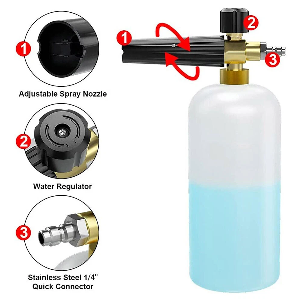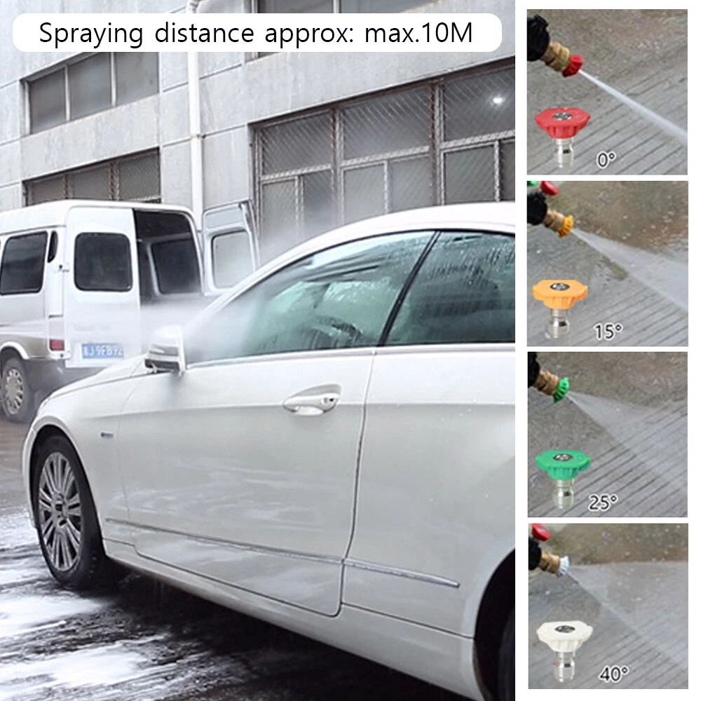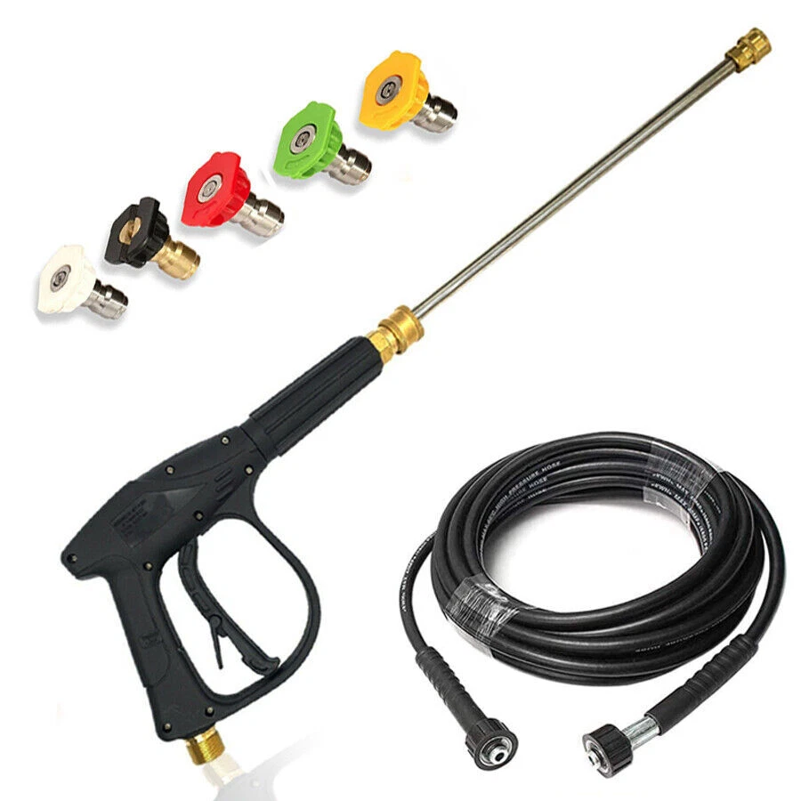Product Description High Pressure Spray Gun Description: PLEASE NOTE: Fit for M22-14mm thread connector pressure washer hose. Not fit garden hose, regular hose or faucet. Perfect Pressure Washer Gun Kit: MAX 4000 PSI power washer gun with a 1/4 inch outlet quick-connector and M22-14 thread inlet fitting (inside diameter 14mm). Premium Material: The pressure washer gun shell body is made of high-quality engineering plastics, which is more wear-resistant. The valve core is made of aluminium, which has good resistance to high pressure and impact. The pipe is stainless steel material. Last longer, more Long-lasting and leak-proof. Professional Cleaning: 5 pressure washer spray nozzles tips creating 5 patterns for a variety of uses. 0 degree (red), 15 degree (yellow), 25 degree (green), 40 degree (white) and 65 degree (black Soap Nozzle). Great Compatibility: The pressure washer gun fits a M22-14 thread inlet fitting with 14 mm inside diameter. Please confirm the hose interface size before purchasing to avoid leakage. Safe Design: The handle of the short wand high pressure gun adopts a trigger lock design to prevent accidental spraying, make you safer when cleaning the car or the roof. Widely Applicable: Suitable for cleaning cars, pool, windows, roofs, sidewalks, auto detailing business, garden tractor, etc. Easily support your efficient cleaning. Specification: Material: Aluminium+ ABS Color: Black Gun Type: Ergonomic Max. Pressure: 4000PSI Normal Working Pressure: 2175PSI Max. Temperature: 60℃ / 140℉ (Cold water use only) Gun to Hose Connection: M22 - 14 Lance to Nozzle Connection: 1/4" Quick Coupling Size: 17.5 x 17.5cm / 6.9 x 6.9in 26ft Hose Color: Black Material: Rubber Length: Approx.26ft Hose Size: Inter Diameter: 6mm/Outer Diameter: 10mm Working Pressure: Max. 3200PSI Fit in with Connector: Inter Diameter: 14mm / Outer Diameter: M22mm Connecting Thread: NPT Thread Working Temperature: MAX 60℃/140℉ 5 Nozzle Nozzle Details: 0° Red Nozzle Tip: Clean high areas or are as hard to reach such as crevices in sidewalks 15° Yellow Nozzle Tip: Clean brick,concrete and other hard surfaces with stubborn stains. 25° Green Nozzle Tip: Clean wood,fences,painted surfaces,siding and lawn mowers. 40° White Nozzle Tip: Clean screens and windows. 65° Black Soap Nozzle Tip: Spray on detergents. Extension Wand Lance Description: Excellent Pressure: Pressure washer wand extension’s max pressure is up to 4000 psi, fits most pressure washer. During the using time, power washer wand extension can provide great cleaning function. Easy to Install: General M22 14mm Male to 1/4 quick plug (TYPE 1); 1/4'' quick Connector and 1/4'' quick plug (TYPE 2), fit for most pressure washer attachments in the market, including surface cleaner, undercarriage cleaner, foam cannon, pressure washer gun, hose, nozzle tips and adapter. Specification: Material: Stainless Steel + Brass Length: 16” Connector: M22-14 X 1/4” Quick Connector, 1/4 ” Quick Connector X 1/4 ” Quick Plug Max Working Pressure: 4000 PSI Package Included: Option 1 : 1 x High Pressure Spray Washer Gun + 1 x Extension Wand Lance + 5 x Spray Nozzles + 26ft Hose Option 2 : 1 x High Pressure Spray Washer Gun + 1 x Extension Wand Lance + 5 x Spray Nozzles Option 3 : 1 x 26FT Hose Only Option 4 : High-Pressure Cleaning Sprayer Set Option 5 : Adjustable High-Pressure Cleaning Sprayer Set On Jan 24, 2025 at 10:22:06 PST, seller added the following information: