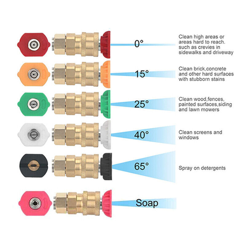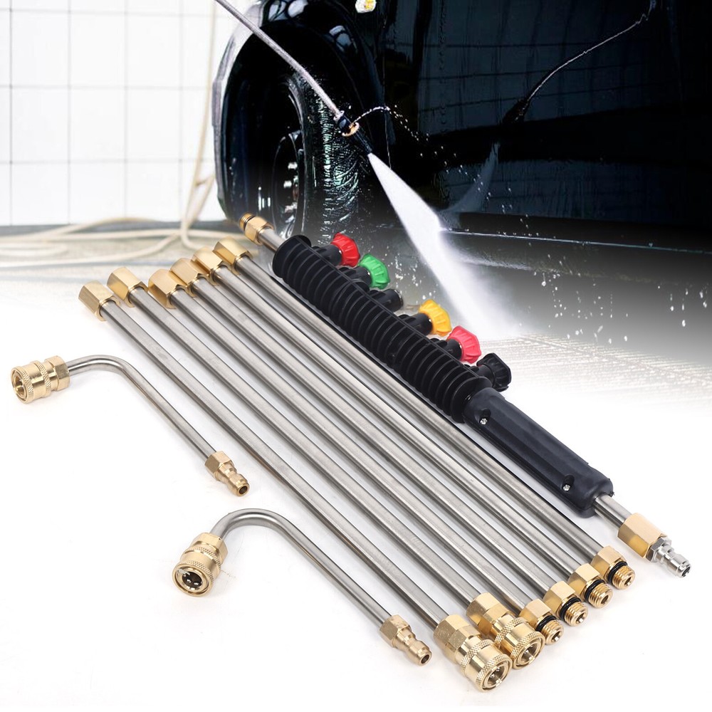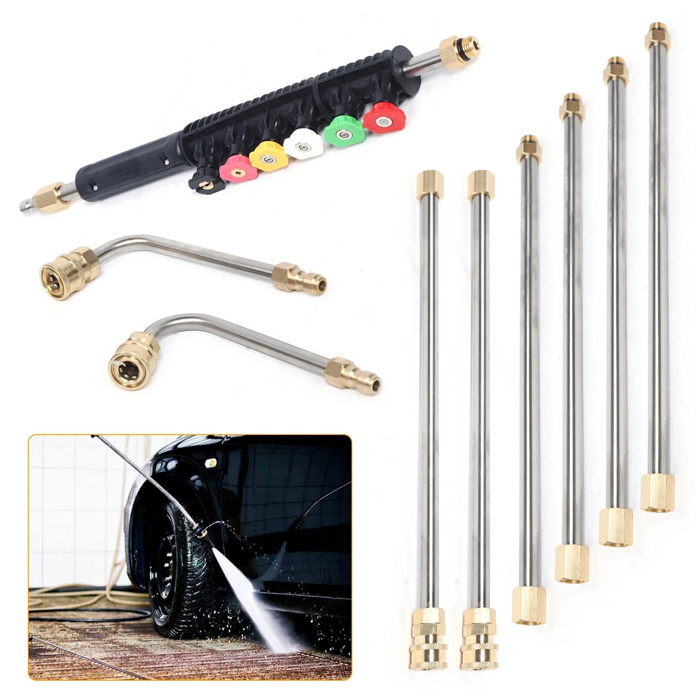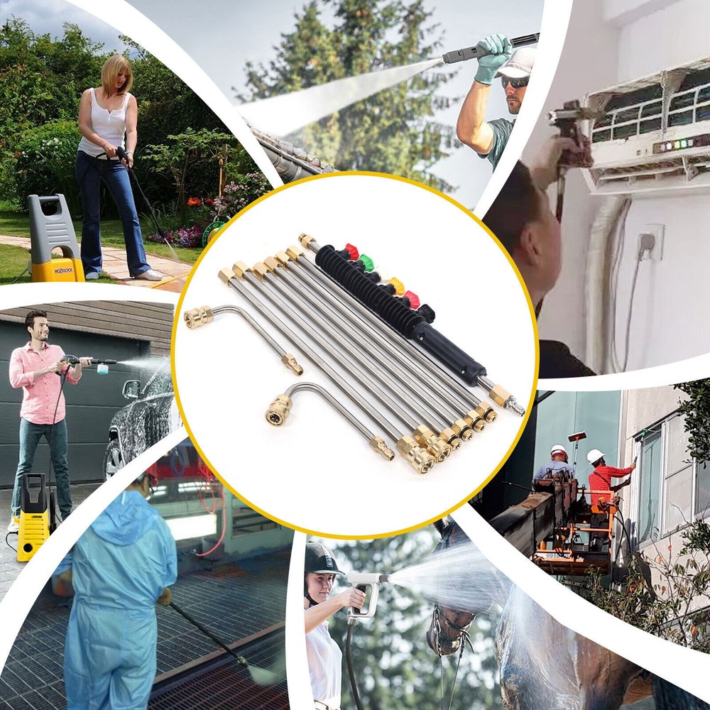 Have a nice day~ High Pressure Car Power Washer Spray Gun Wand Extension Lance Nozzle Tips 8pcs Features: 1. the Cleaning Tool Are Made of Brass and Stainless Steel. Working Pressure Is up to 4000 Psi. Working Temperature Is up to 140 ℉ . 2. the Cleaning Tool Consists of 6 Straight Rods, One 90° Curved Rod and One 120° Curved Rod Which Is S afe and Efficient. It Also C an Get Areas Which Is Hard to Reach, Great for Cleaning. 3. You Can Adjust the Total Length of Wand Freely According to Your Needs. Specifications: Spray Wand Material: Stainless Steel Tip Material: Copper Color: Gold&Silver Connector:1/4" Male Thread /1/4" Female Thread Quantity: 8 pcs O-ring Size: Outside Diameter Is 14mm, Inside Diameter Is 9 .2 mm. Quantity: 10pcs 6 xnozzles Material: Brass,Stainless Steel, Rubber Nozzles: 0° Red,15° Yellow,25° Green,40° White,60° Black , Soap Pink 6 Sp ra y Nozzle Tips: Red - 0 Degrees - Areas That Are High and Hard to Reach Such As Sidewalks and Driveways. Yellow - 15 Degrees - Use on Concrete, Brick and Other Hard Surfaces with Stubborn Stains. Green - 25 Degrees - Use on Painted Surfaces, Wood Siding, Fences and Lawn Mowers. White - 40 Degrees - Use on Windows and Screens. Black - 65 Degrees - Use to Spray Soaps and Detergents. Pink - Soap - Jet Stream Tips,Soap Mode Application ² Ideal for Nozzle, Undercarriage Cleaner, Water Broom, Surface Cleaner and Cleaning Brushes. ² Also Can Be Used to Clean Areas Such As Siding, Shutters, Windows and More. Package Included: 6 X Straight Rod s 1 x 90° Curved Rod 1 x 120° Curved Rod 1 x Cover 10 X O-ring s 6 X Nozzles Payment Delivery details Terms of sales About us Contact us Payment We accept ebay payment 。 Fees such as import duties, taxes are not included in the item price or shipping costs. These charges are the buyer's responsibility. Delivery details Shipping: 2-9 working days to: USA Terms of sales We maintain high standards of excellence and strive for hundred percent customer satisfaction. Feedback is very important to us. We hope that you contact us immediately before you give neutral or negative feedback, so that we can address your concerns. It is impossible to address issues if we do not know about them! About us Your satis faction is our ultimate goal. We work hard to earn your trust and future business. Our certified technicians have tested each item before shipping. The unit comes with 1 year limited warranty on all manufacturing defects. a) If you receive a defective item, you may return it or ask for a discount. Please contact us within 14 days after you receive the package. b) What you returned must be intact and in its original packaging as re? u. Customer is responsible for shipping costs of the returned item. c) We will cover the cost of shipping back t with the shipping rate indicated in the registration page. We will send you a new unit or refund the full payment you paid. Thank you. Contact us Business Hour Business Hour: Monday To Friday: 8:30 AM to 5:00 PM (Beijing China time) Due to time zones, our reply to your questions may not be immediately. But within above working time, we will reply your email within 24 hours. If it's non-workdays, please kindly be patient and wait till Monday. Please contact us with ebay message. Please feel free to contact us if you have any questions. Monday To Friday: 8:30 AM to 5:00 PM (Beijing China time) Due to time zones, our reply to your questions may not be immediately. But within above working time, we will reply your email within 24 hours. If it's non-workdays, please kindly be patient and wait till Monday. Please contact us with ebay message. Please feel free to contact us if you have any questions.