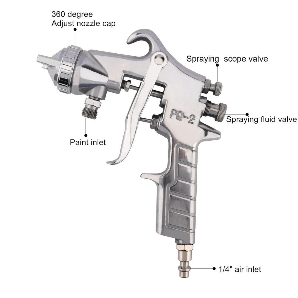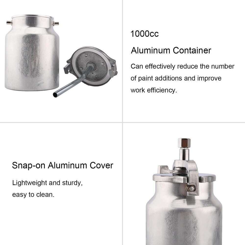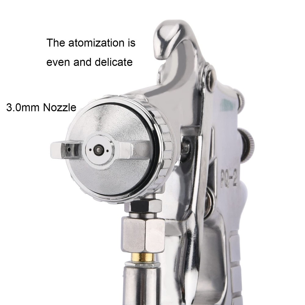 Product description: 360° three-dimensional atomization, 3.0 mm aperture nozzle, high pressure resistance, uniform and sensitive. Watering with a large capacity of 1000 ml can effectively reduce the number of paint additions and improve work efficiency. Whether it is industrial supplies, automotive, furniture, marine machinery and other industries, it is widely used. It is easy to use, saves time and colour, is cost-effective and looks better. Product Information: Cup Color: Silver Inlet Size: 1/4" Cup Capacity: 1000cc Feed Mode: Siphon Feed Air Consumption: 100-200L/min(4-7CFM) Working Pressure: 50-60PSI Nozzle Diameter: 3.0mm Packaging Includes: 1* Wrench 1* Spray Gun 1* Cleaning Brush 1* 1000cc Anti-Drip Canister If you have any questions, please do not hesitate to me at any time. I will reply to you within 24 hours and do my best to help you! Nozzle Size: 3.0mm nozzle , 1/4 inch air inlet. Suitable to handle a wide range viscosity of water or oil based material for general purpose. 1000cc Anti-Drip Canister: The anti-drip canister seals tight helps minimize cleanup, will increase productivity and save you money by minimizing waste. you never have to worry about making a mess or wasting paint. High Quality: Handheld Sprayer with Anti-Drip Canister featuring exclusive air valve design, allowing you to tackle projects with ease and providing finest atomization and classic quality. Adjustment: Spray gun has control knobs for full adjustment over spray pattern, fluid control and air pressure. Hold gun at any angle with various fill levels while maintaining proper suction and without spilling paint from canister. WIDELY APPLICATION: Our siphon-feed spray gun is perfect for spraying oil-based or latex paints, suitable for medium to large size painting jobs in automotive, home, and furniture applications.