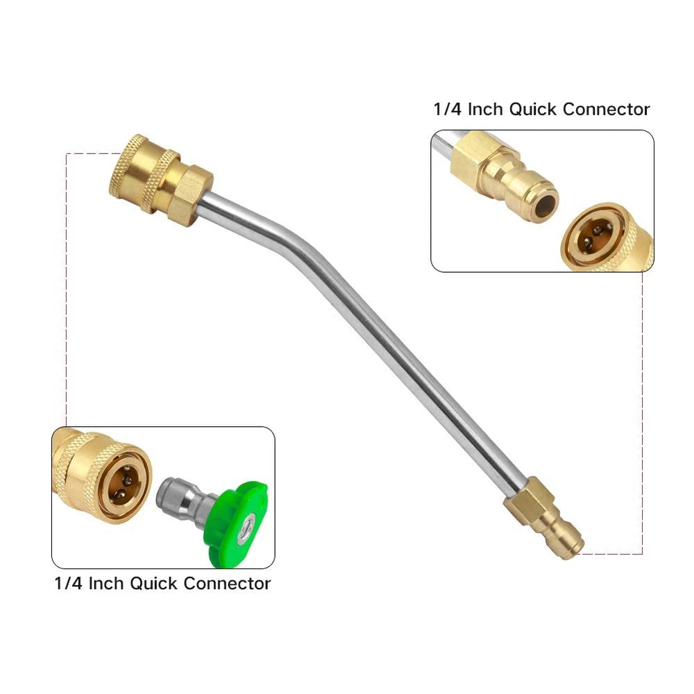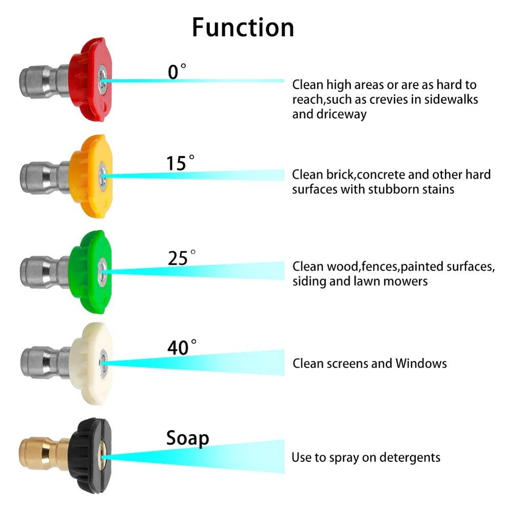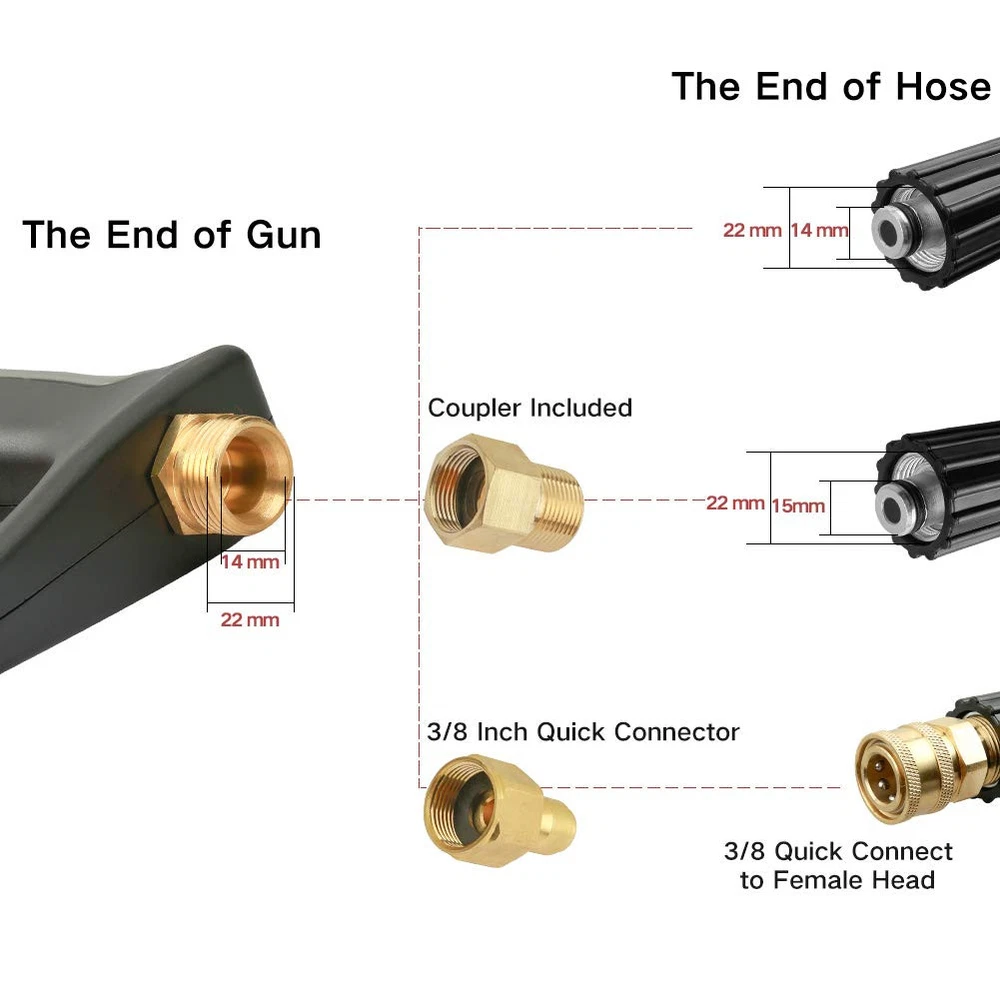 ❤【Scientific Design】Gun has a comfortable grip to fit your hands, making your pressure washing job a breeze. The gun also has a safety locking trigger to prevent unwanted trigger pulls. ❤【Special Improvement】7 inch 30 degree wand with 1/4" quick-disconnect end for simplified spray tip exchange.It provides extra length for gun so easy to reach hard places.Five pieces pressure washer tips meet your needs in different situations:red(0°); yellow(15°); green(25°); white(40°); black(soap). ❤【Compatibility】Maximum flow: 3.96 GPM,Working pressure is up to 4000 PSI.The pressure washer gun perfect design for car cleaning, windows washing, driveways, roofs, siding washing. ❤【Attention】Please make sure your pressure washer hose is Metric M22 female thread fitting. The high pressure washer gun which inlet size have M22-14mm[inner diameter],M22-15mm [inner diameter]and G3/8 quick connector. ❤【Quality Assurance】If you have any questions, please feel free to contact with us.Our professional after-sales team is at your service.