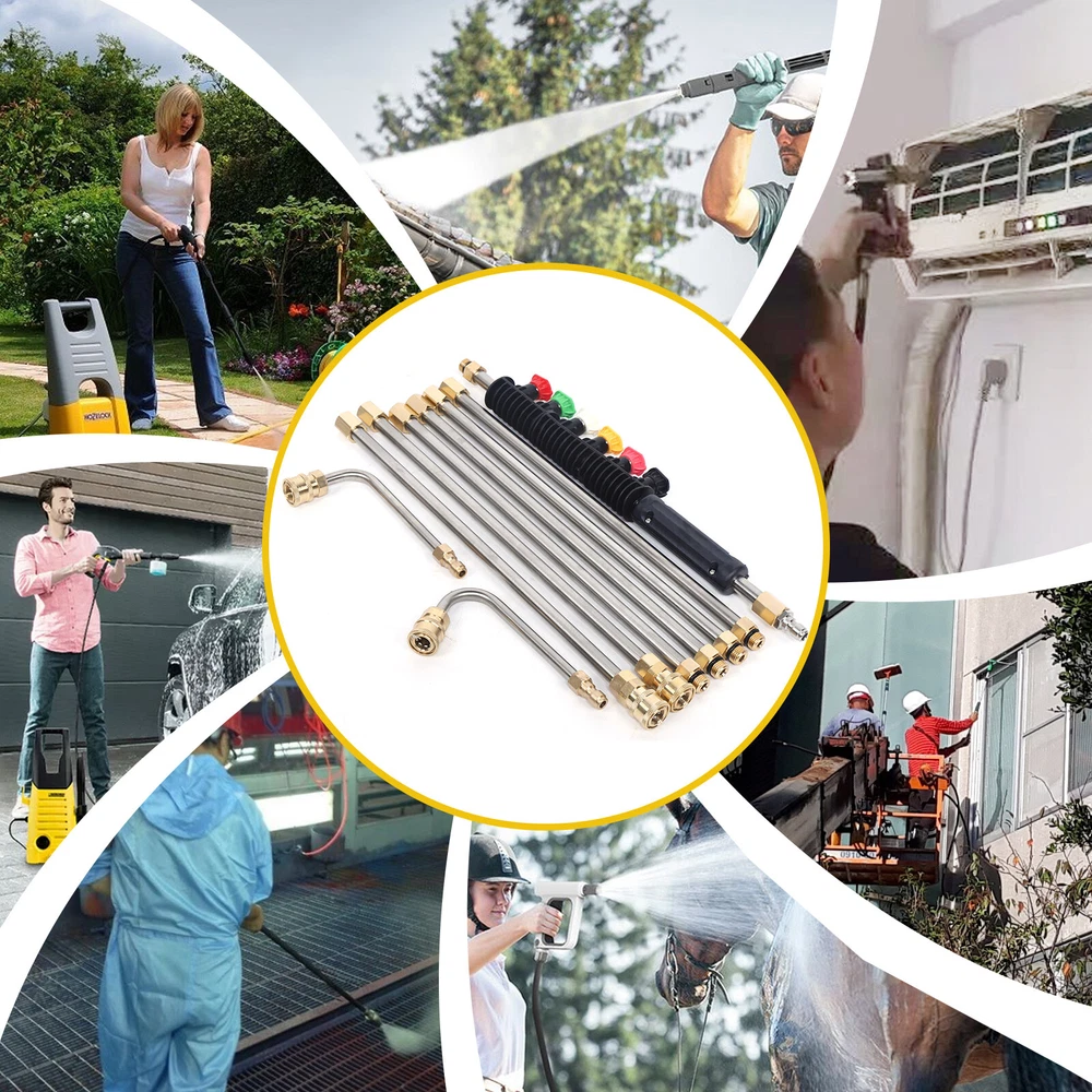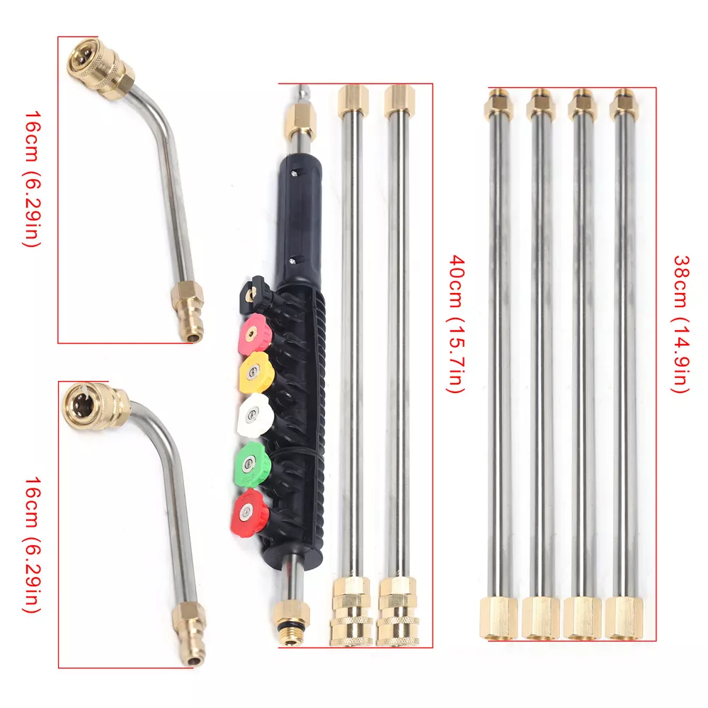 Product Description Features: 1. The cleaning tool are made of brass and stainless steel. Working pressure is up to 4000 PSI. Working temperature is up to 140 ℉. 2. The cleaning tool consists of 6 straight rods, one 90°curved rod and one 120°curved rod which is safe and efficient. It also can get areas which is hard to reach, great for cleaning. 3. You can adjust the total length of wand freely according to your needs. Specifications: Product: High Pressure Spray Wand Material: Stainless steel Tip Material: Copper Color: Gold&Silver Connector: 1/4" Male thread /1/4" Female thread Quantity of Connector: 8pcs O-ring size: Outside Diameter is 14mm, Inside Diameter is 9.2mm. Quantity of O-ring: 10pcs Quantity of Nozzles: 7+2(A total of 7 straight, 2 curved) High Pressure Washer Rod Cleaning Extension Wand For Karcher 6 Nozzle 90°+120° Stainless High Pressure Spray Wand Extension Rod Kit Cleaning Tool This Product Is Suitable for Water Pressure of 1 500-4000psi , the Pole Will Not Shake When Working, but Please Be Careful While Using It! Note: the Length of Each Straight Rod Is About 38-40cm Product Description 1. the Cleaning Tool Are Made of Brass and Stainless Steel. Working Pressure Is up to 4000 Psi. Working Temperature Is up to 140 ℉ . 2. the Cleaning Tool Consists of 6 Straight Rods , One 90°Curved Rod and One 120°Curved Rod Which Is Safe and Efficient. It Also Can Get Areas Which Is Hard to Reach, Great for Cleaning. 3. You Can Adjust the Total Length of Wand Freely According to Your Needs. Specifications: Product: High Pressure Spray Wand Material: Stainless Steel Tip Material: Copper Color: Gold&Silver Connector: 1/4" Male Thread /1/4" Female Thread Quantity of Connector: 8pcs O-ring Size: Outside Diameter Is 14mm, Inside Diameter Is 9.2mm. Quantity of O-ring: 10pcs Quantity of Nozzles: 6 Material: Brass,Stainless Steel, Rubber Nozzles: 0° Red,15° Yellow,25° Green,40° White,60° Black, Soap Pink With Curved Rod: 90°+120° 6 Spray Nozzle Tips: Red - 0 Degrees - Areas That Are High and Hard to Reach Such As Sidewalks and Driveways. Yellow - 15 Degrees - Use on Concrete, Brick and Other Hard Surfaces with Stubborn Stains. Green - 25 Degrees - Use on Painted Surfaces, Wood Siding, Fences and Lawn Mowers. White - 40 Degrees - Use on Windows and Screens. Black - 65 Degrees - Use to Spray Soaps and Detergents. Pink - Soap - Jet Stream Tips,Soap Mode Application 1.Ideal for Nozzle, Undercarriage Cleaner, Water Broom, Surface Cleaner and Cleaning Brushes. 2.Also Can Be Used to Clean Areas Such As Siding, Shutters, Windows and More. Package Included: 6 X Straight Rods 1x 90°Curved Rod 1x 120°Curved Rod 1x Cover 10 X O-rings 6 X Nozzles Payment Delivery details Terms of sales About us Contact us Payment We accept ebay payment 。 Fees such as import duties, taxes are not included in the item price or shipping costs. These charges are the buyer's responsibility. Delivery details Shipping: 2-9 working days to: USA Terms of sales We maintain high standards of excellence and strive for hundred percent customer satisfaction. Feedback is very important to us. We hope that you contact us immediately before you give neutral or negative feedback, so that we can address your concerns. It is impossible to address issues if we do not know about them! About us Your satis faction is our ultimate goal. We work hard to earn your trust and future business. Our certified technicians have tested each item before shipping. The unit comes with 1 year limited warranty on all manufacturing defects. a) If you receive a defective item, you may return it or ask for a discount. Please contact us within 14 days after you receive the package. b) What you returned must be intact and in its original packaging as re? u. Customer is responsible for shipping costs of the returned item. c) We will cover the cost of shipping back t with the shipping rate indicated in the registration page. We will send you a new unit or refund the full payment you paid. Thank you. Contact us Business Hour Business Hour: Monday To Friday: 8:30 AM to 5:00 PM (Beijing China time) Due to time zones, our reply to your questions may not be immediately. But within above working time, we will reply your email within 24 hours. If it's non-workdays, please kindly be patient and wait till Monday. Please contact us with ebay message. Please feel free to contact us if you have any questions. Monday To Friday: 8:30 AM to 5:00 PM (Beijing China time) Due to time zones, our reply to your questions may not be immediately. But within above working time, we will reply your email within 24 hours. If it's non-workdays, please kindly be patient and wait till Monday. Please contact us with ebay message. Please feel free to contact us if you have any questions. Brand Unbranded Type Water Pressure Washer Product High Pressure Spray Wand Material Brass,Stainless Steel, Rubber Tip Material Copper Color Gold&Silver Connector 1/4" Male thread /1/4" Female thread Quantity of Connector 8pcs O-ring size Outside Diameter is 14mm, Inside Diameter is 9.2mm Quantity of O-ring 10pcs Quantity of Nozzles 7+2(A total of 7 straight, 2 curved) Nozzles 0° Red,15° Yellow,25° Green,40° White,60° Black, soap Pink with curved rod 90°+120° Power Source N/A Maximum Pressure 4000 psi Features N/A Product Line N/A Model N/A Voltage N/A Horsepower N/A Engine Type N/A Soap Tank Capacity N/A Fuel Tank Capacity N/A Power N/A Assembly Required Yes Engine Size N/A Noise Level N/A MPN Does not apply Manufacturer Warranty N/A Item Length 41cm Item Width 8cm Item Height 6cm Item Weight 1.43kg