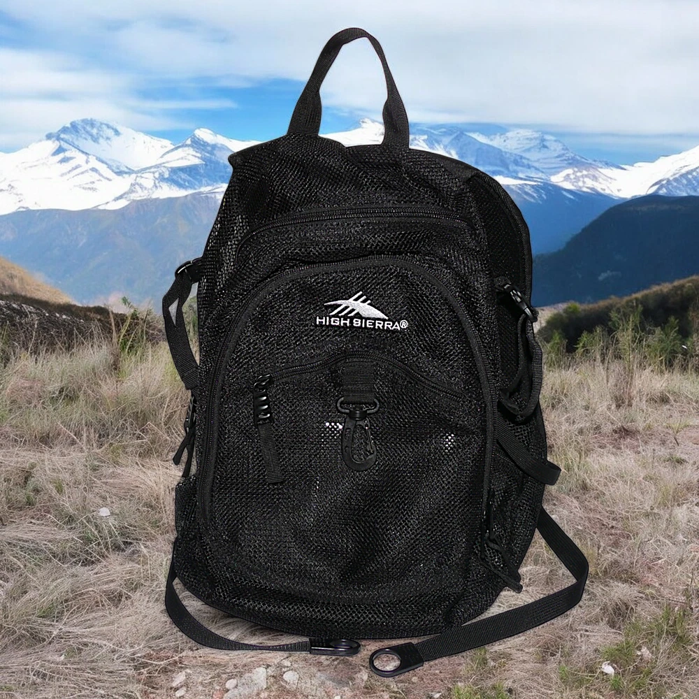 High Sierra mesh backpack. Three zippered pockets and one pocket on the strap. Two clear pocks in second pocket for cell phone and misc items. Rain cover is stored in pocket on the bottom of the backpack. Padded straps with a security clip to keep the pack in place. Secure clip on the front of the backpack for keys or other items. Measurements are approximate: 17" x 12" x 6".