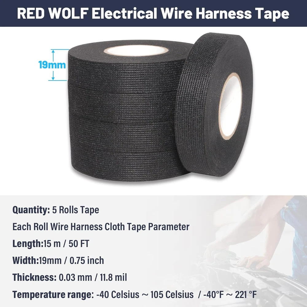 Description: Type: Bonded wiring tape Product features: sound-absorbing Wire loom harness tape is flexible and wear-resistant, resistant to aging, hand-tearing Color: black Length:15 m / 49.2 FT Width:19mm / 0.75 inch Thickness: 0.03 mm / 11.8 mil Temperature range:-40 Celsius ~ 105 Celsius / -40°F ~ 221 °F Strong adhesive force, No harmful substance Not easy to corrosion, Reduce noise, It is not easy to wear Soft and strong expansion, Temperature stability Anti pollution ability strong surface Widely application: The material of wire harness cloth tape is soft and corrosion-resistant, which is suitable for the use of wire harness in automobile interior noise reduction part, such as wire harness of the dashboard, main harness wound and applied for wire joint and wire fixing; It can also sort out home appliance wiring and more Easy to tear: Just stick one end of tape to cable, start pulling and wrapping onto the cable and tear it gently; No need scissors and other tools; You can decide the length of the wire cloth tape according to you needs Professional cloth tape material: It is made of polyester non-woven fabric and strong acrylic pressure sensitive adhesive; High viscosity, high temperature resistance ( -40°F to 221°F ), well seal and excellent flexibility Excellent performance: The wiring harness tape maintains features high adhesive force, good noise reduction, hand tearable and heat insulation performance, and wear resistance; It is suitable for electrical automotive engine and circuit maintenance to achieve the purpose of insulation protection Specification: A set of 5 rolls wire harness cloth tap; SIZE: Each roll black electrical harness tape is 50 FT long and 3/4 inch wide; It is work for your different daily needs in diversified use scenarios