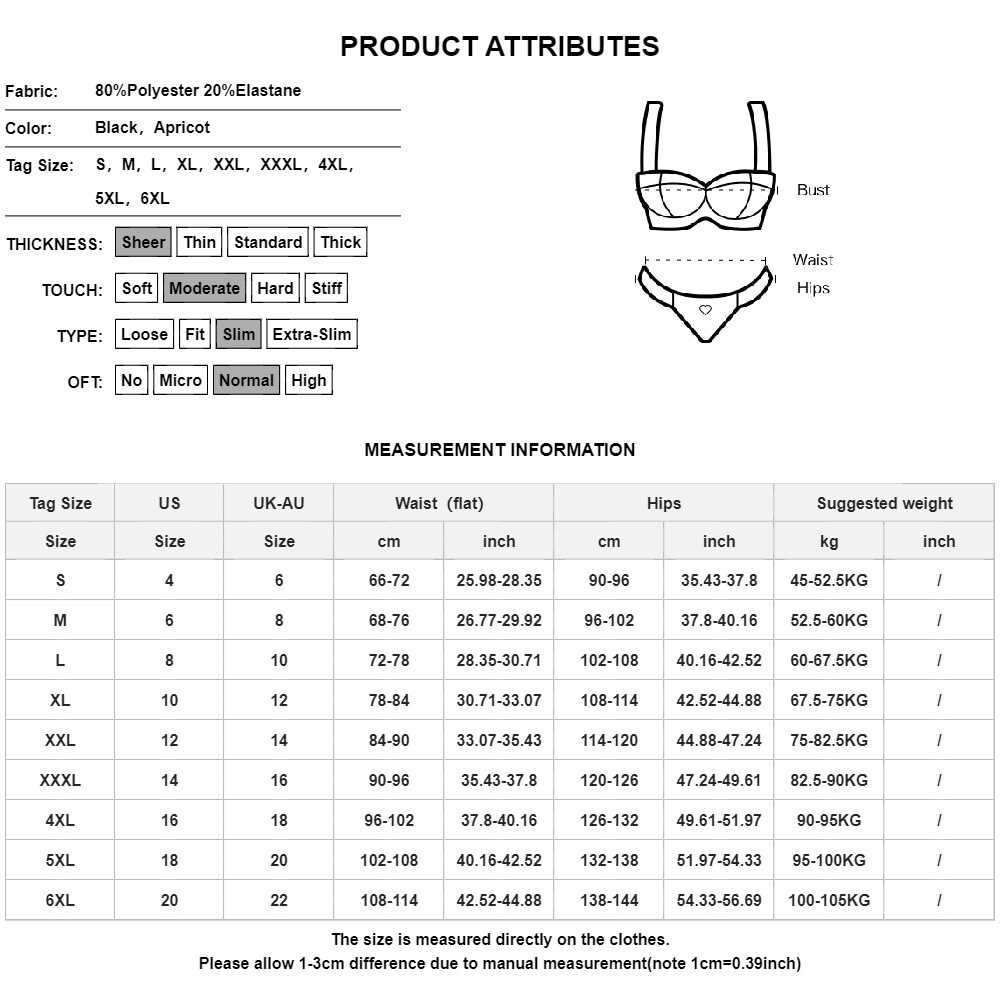 Sexy Ladies ❤️ Lingerie Women Satin Silk Underwear Babydoll Sleepwear Nightdress 10.89 USD Free shipping Women Floral Boho Casual Loose Slip Maxi Dress Lady Summer Holiday Cami Sundress 13.99 USD Free shipping Women Sleeveless Dungaree Casual Jumpsuit Overalls Bibs Loose Long Pants Romper 17.99 USD Free shipping Womens Cotton Linen Jumpsuit Sleeveless Pockets Casual Wide Leg Pants Romper US 23.89 USD Free shipping Sexy Women's Lingerie Bodysuit Maid Outfits Babydoll Mini Dress Nightwear 12.69 USD Free shipping Spring Womens Solid V Neck Short Sleeve T-shirts Casual Pants Outfits Sets 2PCS 17.99 USD Free shipping Plus Size Butterfly Embroidery Open Back Lace Up Sundress, Sexy Beach Dress 19.19 USD Free shipping Women Sexy Floral Maxi Long Dress Ladies V Neck Casual Holiday Party Sundress US 22.29 USD Free shipping Women Solid V-Neck Casual T-Shirt Tops Ladies Loose Button Flared Sleeve Blouse 15.09 USD Free shipping Women Palazzo Split Harem Pants Ladies High Waist Loose Yoga Wide Leg Trousers 17.39 USD Free shipping Lace Slim Women's Long Sleeve V-Neck Sexy T-Shirt Loose Casual Party Tops Blouse 17.69 USD Free shipping Womens Drawstring Cotton Linen Pants Ladies Summer Casual Loose Wide-Leg Trouser 19.09 USD Free shipping Womens Boho Floral Holiday Beach Maxi Dress Ladies Sleeveless Summer Sundress 19.09 USD Free shipping ⭐⭐⭐⭐⭐Sexy Lingeries Womens Teddy Lace Sheer Mesh Sleepwear Nightie Robes Pajamas 13.59 USD Free shipping Product Description Product Features: Material:Spandex Fabric Type:Knit Pattern:Solid Occasion:Back To The Basics Size Type:Regular Theme:Sexy Accents:Lace Features:Removable Pads Panties Type:Boyshort Package Content: 1 x Underpants About This Item(We aim to show you accurate product information) 1.The Real Object May Exist Slightly Colors Differences Compared To Images As Different Computers Display.Caution If Minding,Thanks. 2.There Might Be A Manual Measuring 1-3 cm Error.Sorry For Any Inconvenience(note 1cm=0.39inch) . 3.Please Prevail On Real Item, Model Images For Reference Only. 4.Attention!!!Please check the size chart carefully before placing the order. Thanks for your understanding. Size C hart: Size-Details Tag Size US UK-AU Waist(flat) Hips cm inch cm inch S 4 6 66-72 25.98-28.35 90-96 35.43-37.8 M 6 8 68-76 26.77-29.92 96-102 37.8-40.16 L 8 10 72-78 28.35-30.71 102-108 40.16-42.52 XL 10 12 78-84 30.71-33.07 108-114 42.52-44.88 XXL 12 14 84-90 33.07-35.43 114-120 44.88-47.24 XXXL 14 16 90-96 35.43-37.8 120-126 47.24-49.61 4XL 16 18 96-102 37.8-40.16 126-132 49.61-51.97 5XL 18 20 102-108 40.16-42.52 132-138 51.97-54.33 6XL 20 22 108-114 42.52-44.88 138-144 54.33-56.69 Shipping Returns Contact Us Payment 1. Free Shipping & Fast Delivered ! 2. Shipping may be influenced by holidays, events and some other uncertainties. If you dislike the seemingly long shipping time, please think carefully to bid or buy the item. We do not want to get a negative or neutral or low DSR score because of shipping time. If you have special demand on shipping time, please inform us via ebay message. 60day returns. Buyer pays for return shipping. 1.Please see the size reference to find the correct size. 2.There may be slightly color difference cause of light shooting. 3.Please allow 1-3cm difference due to manual measurement(note 1cm=0.39inch) If you care about the slightly size difference and the slightly color difference,please think carefully to bid or buy the item. We do not want to get a negative or neutral or low DSR score because of those small difference. If you have special demand on the size or color, please inform us via ebay message. For any question, please do not hesitate to contact us through eBay message , We will answer or help you to solve the problems as soon as we can. We have a professional customer service team,We will always do our up most to exceed your expectations in customer service, communication and dispatching of your orders. We accept PayPal only. We ship to your eBay or Paypal address. Please make sure your eBay and Paypal address is correct before you pay. Shipping 1. Free Shipping & Fast Delivered ! 2. Shipping may be influenced by holidays, events and some other uncertainties. If you dislike the seemingly long shipping time, please think carefully to bid or buy the item. We do not want to get a negative or neutral or low DSR score because of shipping time. If you have special demand on shipping time, please inform us via ebay message. Returns 60day returns. Buyer pays for return shipping. 1.Please see the size reference to find the correct size. 2.There may be slightly color difference cause of light shooting. 3.Please allow 1-3cm difference due to manual measurement(note 1cm=0.39inch) If you care about the slightly size difference and the slightly color difference,please think carefully to bid or buy the item. We do not want to get a negative or neutral or low DSR score because of those small difference. If you have special demand on the size or color, please inform us via ebay message. Contact Us For any question, please do not hesitate to contact us through eBay message , We will answer or help you to solve the problems as soon as we can. We have a professional customer service team,We will always do our up most to exceed your expectations in customer service, communication and dispatching of your orders. Payment We accept PayPal only. We ship to your eBay or Paypal address. Please make sure your eBay and Paypal address is correct before you pay. powered by