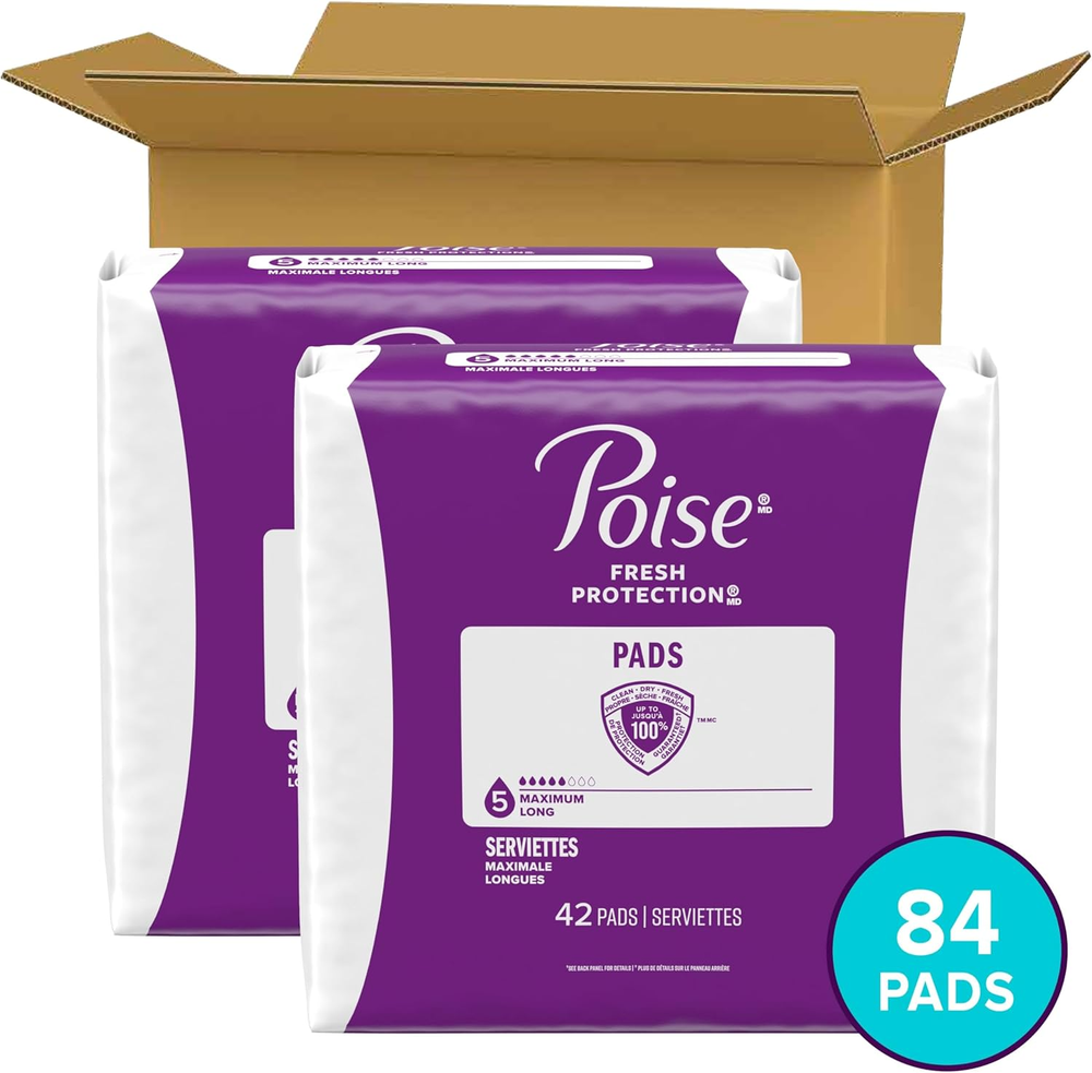 Store New Arrivals Add to Favorite View Feedback Incontinence & Postpartum Pads for Bladder Leaks, 5 Drop Maximum Absorbency, Maximum Long, 84 Count, Packaging May Vary Description Item model number 10036000469667 Unit Count 84 Incontinence Protector Type Incontinence Pad Number of Items 2 Color White Product Dimensions 13.13 x 9.75 x 13.38 inches; 0.11 ounces Country of Origin USA Age Range (Description) Adult Department Women's Is Discontinued By Manufacturer No Size Maximum Long POISE INCONTINENCE PADS: 84 incontinence and postpartum bladder leak pads, 5 Drop Maximum Absorbency, regular length (14 pads total) INSTANT ABSORBTION: Poise pads for women instantly absorb and rapidly lock away more wetness than the leading period pad for amazing dryness UP TO ZERO ODOR: Each incontinence pad is made with odor-reducing material and helps control odor for up to 12 hours WETNESS PROTECTION: These women’s incontinence pads are made with a moisture-wicking top layer designed to feel dry throughout wear UP TO ZERO LEAKS: Poise Incontinence Pads for Women are 25x drier than the leading period pad and offer up to 12 hours of bladder leak protection SHAPED TO PROTECT: Our women's incontinence pads have a ContourFit design that is softly curved and has a wide front and back to help keep you comfortably protected Up to 100% clean, dry and fresh protection guaranteed* (*Buy by 12/31/25; requests must be postmarked w/in 30 days of purchase. Online access & orig. receipt/UPC req’d. Limit 1/household. Restrictions apply. Details at Poise website) Poise adult incontinence products are HSA/FSA-eligible in the US (check with your provider for coverage details); product and packaging may vary Enjoy up to 100% clean, dry and fresh protection guaranteed* with Poise Incontinence & Postpartum Pads for Bladder Leaks. Unlike period pads, which are meant for menstrual needs, Poise pads are designed to offer protection against light bladder leaks. These disposable incontinence pads instantly absorb for up to zero odor and rapidly lock away more wetness** for amazing dryness. In fact, Poise incontinence pads for women are made with odor-reducing material and helps control odor for up to 12 hours. They also come with a moisture-wicking top layer that is designed to feel dry throughout wear. Plus, our pads for women are 25x drier than the leading period pad, offer up to zero leaks, and deliver up to 12 hours of protection. Each bladder leak pad features a ContourFit design, making it softly curved to help prevent bunching and has a wider front and back than in the middle to help keep you comfortably protected. Poise Incontinence & Postpartum Pads for bladder leaks are available in 3 Drop Light, 4 Drop Moderate, 5 Drop Maximum, 6 Drop Ultimate, 7 Drop Ultra, and 8 Drop Overnight absorbencies. Shop for Poise discreetly by having it shipped directly to your door or pick up curbside. Poise adult incontinence products are HSA/FSA-eligible in the US — check with your provider for coverage details. (*Purchase by 12/31/25. All requests must be postmarked within 30 days of purchase. Online access required. Limit 1 per household. Original receipt/UPC required. Restrictions apply. See Poise website for details) (**vs the leading period pad). ABOUT US We offer the best prices around on high quality products. Our E-store includes media such as books, movies, music and games while offering electronics, toys, sporting apparel, clothing, tools, general home, garden items and more. SHIPPING We are always working hard to ensure your package arrives as soon as possible. Please understand that some factors like weather, high postal traffic, and the performance of shipping companies are outside of our control. We offer free shipping to the lower 48 states and ship within 2 business days of payment, usually sooner. We do not accept P.O. Boxes. Please provide a physical address. RETURNS We offer a 30-Day Return Policy on items which you are not completely satisfied with. You have the option for a full-refund or an exchange of the item. No returns are available on items shipped outside of the USA. PAYMENT We accept PayPal. CONTACT US This page content is yet to come Please ad us to your favorite seller and visit again later Thank You