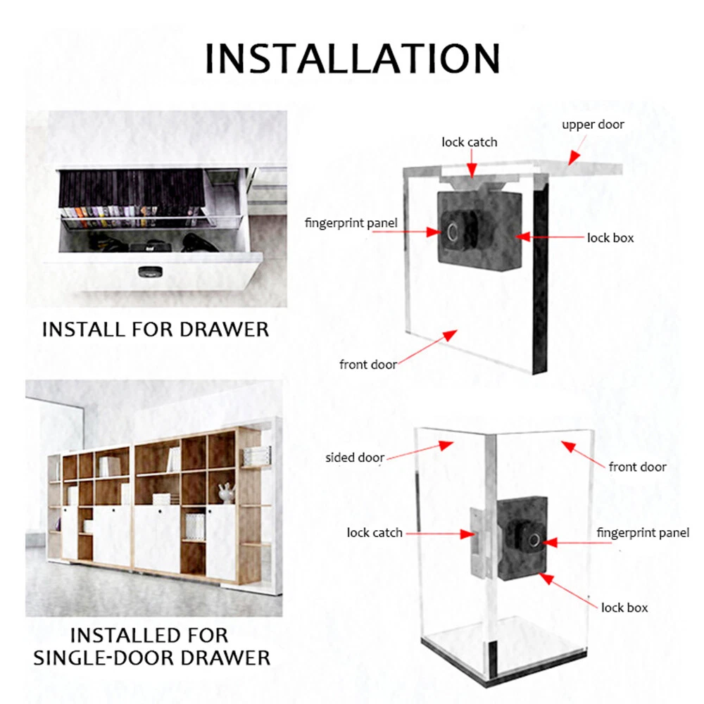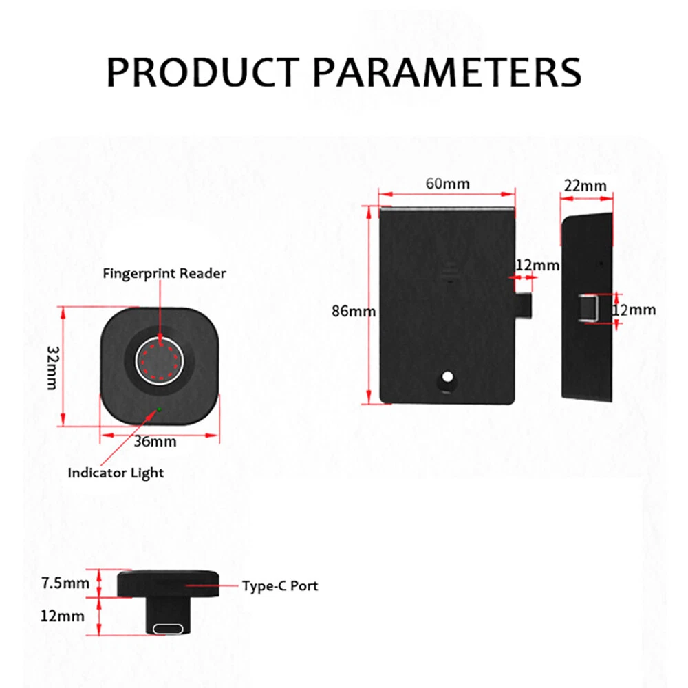 Features : High-Efficiency Biometric Recognition Technology: This fingerprint cabinet lock is equipped with a semiconductor biometric fingerprint recognizer, with a recognition rate of over 98%, faster and more convenient than traditional keys, providing higher . Simple DIY Installation: Just drill a 16mm hole with a screwdriver, and the installation can be completed in a few minutes, suitable for various standard cabinets, drawers, storage cabinets, etc. User-Friendly Features: The lock has two unlocking methods, fingerprint and APP, can store 10 sets of fingerprints, and comes with an automatic locking function, giving you peace of mind. Low Consumption: Uses 3 AAA alkaline , can be used for about 1 year, when the is about to run out, the red will flash to remind you to replace the . : Equipped with a type-C USB interface, as an for unlocking, in the is completely exhausted. Specification : Color: Black Material: ABS, Stainless Steel Ways: Fingerprint, App Fingerprint Capacity: 10pcs App: / Network: : 3 AAA (not included) : Type-C Port Usage: Cabinets/Drawers/Lockers/Furniture/Wardrobe, etc. Package Size: 11.5*10.3*7cm Package Weight: 0.3kg Package list: 1 * Front Panel 1 * Lock Box 1 * User Manual 1 * Screws Bag 1 * Lock Catch