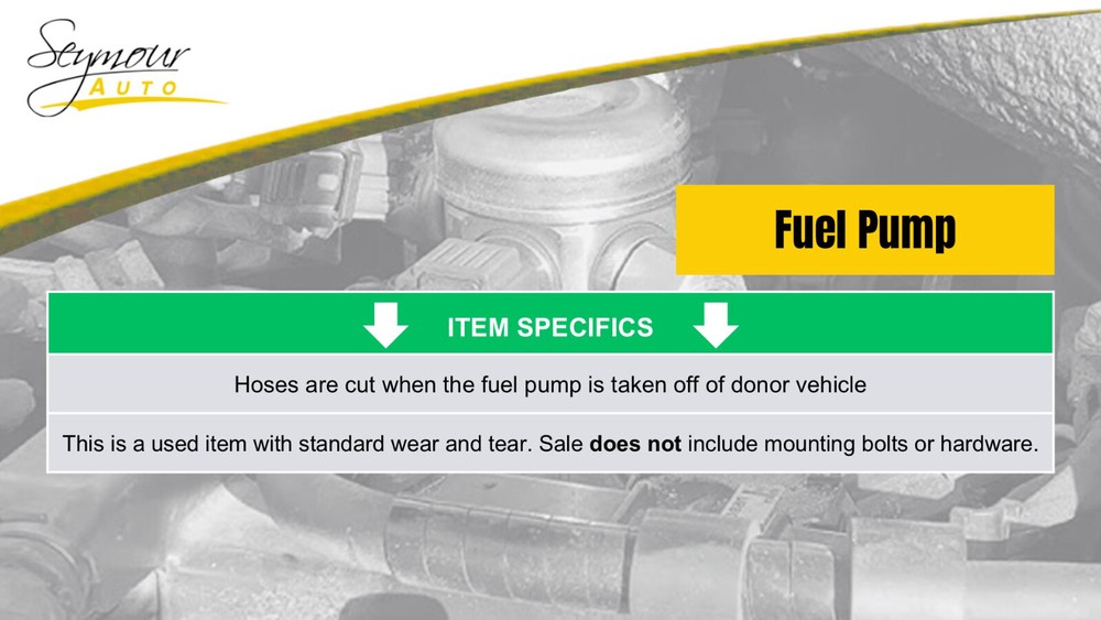 Welcome to our eBay Store! Fuel Pump Assembly 2.3L Turbo Fits 07-12 MAZDA CX-7 1221932 Description Donor Vehicle VIN: JM3ER4WL4A0307782 Model: CX-7 Year: 2010 Mileage: 128000 (0 = not available or unknown) Stock Number: 240791 Store Number: 1 Part Detail Part Grade: Part Category: U Part Placement: Notes: This part will fit these makes and models with these options MAZDA CX-7 07-09 Pump Assembly; (LH tank side) MAZDA CX-7 10-12 Pump Assembly; 2.3L (turbo) WARRANTY / GUARANTEE Most parts we sell through eBay Motors come with a 30 day money back guarantee unless otherwise stated. The 30 day period starts when you take possession of the part. No labor warranty is provided. In the event a part sold with a warranty fails to operate within the warranty period we will replace the part(s) with a functionally equivalent part or refund the part purchase price, at our option. No refund on deposits or unwanted special order parts or special "cut" items. To return an item you must contact us via eBay Message within the 30 day period to obtain a RMA number (return material authorization). Original shipping charges and return shipping charges are not refunded. Once you obtain an RMA number, ship the item back to Seymour Auto Wrecking 107 New Haven Rd Seymour, CT 06483 along with the RMA number. SHIPPING NOTES ABOUT US HELP Seymour Auto Wrecking ships to US addresses within the 48 states only via UPS ground. No Alaska, Hawaii, Puerto Rico, APO, FPO or PO Box's at this time please. No International shipping is available at this time. Pick up at our facilities is available. Please email us prior to your purchase to arrange pick up. Items will be shipped within 1-2 days of purchase. Please allow 5-10 days for delivery. Most areas in the US are within 5 days. No expedited shipping is available. If an item arrives damaged, please contact us via eBay Message within 24 hours for instructions. If you have a question about a part please contact us BEFORE purchasing. Our main contact method is by eBay Messages. We try to answer all messages within 24 hours. If we are unable to answer your questions before the listing ends the item will be re-listed again soon for you to purchase.