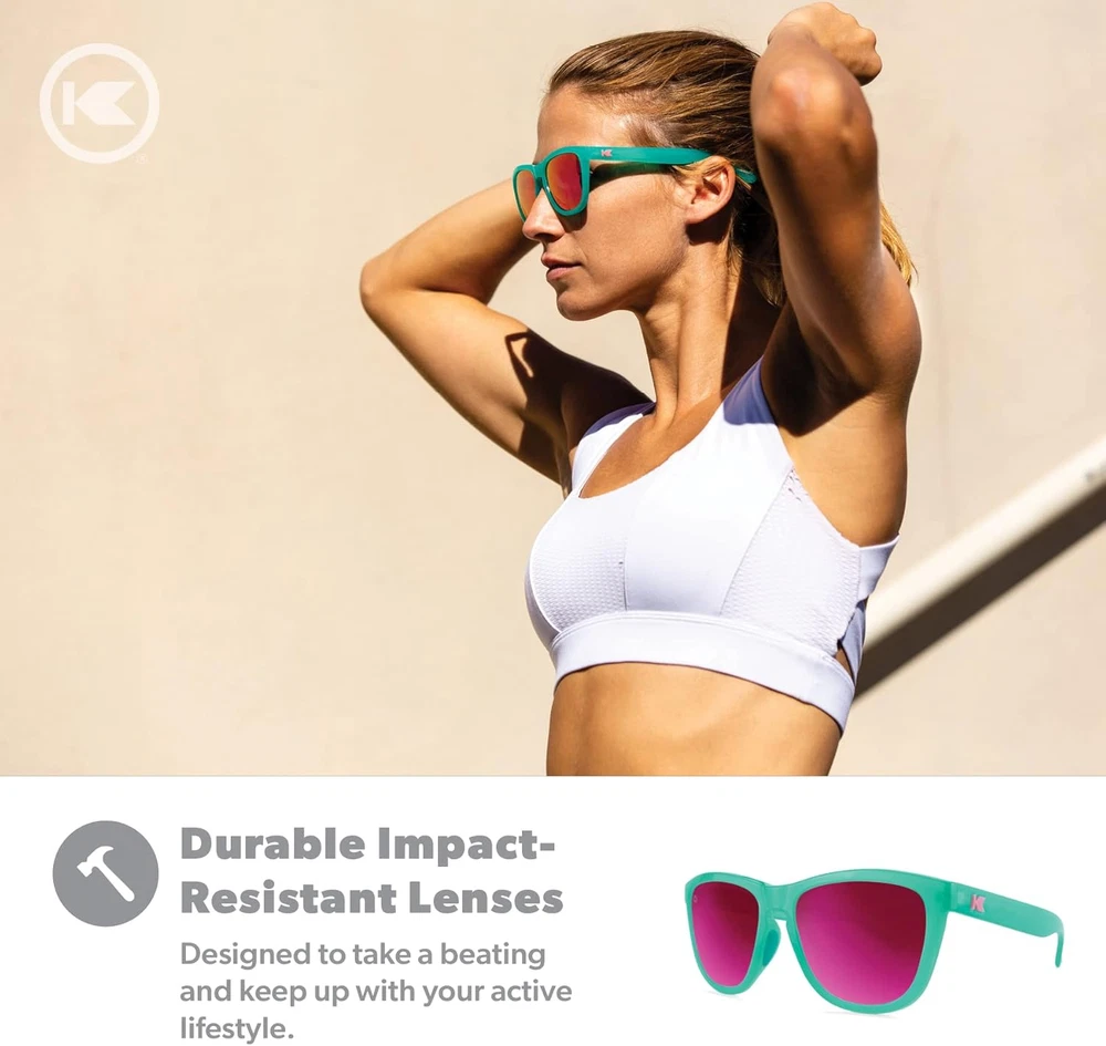 Product Description History of Knockaround Founded in 2005 and based in San Diego, Knockaround is the original, affordable Southern California sunglasses company. Centered around a sunglasses line that is both functional and stylish, Knockaround provides durable eyewear that won’t break the bank. Knockaround Sunglasses has been featured in well-known media outlets such as GQ, US Weekly, and The Today Show, and have been worn by several celebrities including Matthew McConaughey, John Mayer, Natalie Portman, Snoop Dogg, and John Legend. Knockaround Premiums Sport Sporty Shades for an Active Life When you’re out for a run, shooting hoops, or on the field, you need shades that won’t slip, slide, and bounce off your face or interfere with your game. You need Knockaround Premiums Sport. Designed with athletes in mind, Premiums Sport feature lightweight frames, rubber nose pads, and a wider shape that accommodates faces of all shapes. Style and utility come in one package―not only do our sunglasses offer UV400 protection, they also come in a range of color combinations. Slightly rounded lenses with frames that accommodate a wide range of face shapes Ultra lightweight polycarbonate frames Embedded rubber nose pads to reduce slip, slide, and bounce Premiums Sport feature UV400 and FDA-approved impact resistant lenses Polarized performance shades designed for sports or any type of outdoor activity All Premiums Sport come with a protective pouch High-Quality, Durable Frame Premiums Sport frames are lightweight and made from polycarbonate material to provide maximum comfort. Comfortable and Form-Fitting Rubber nose pads provide extra grip yet are soft enough that you’ll barely notice them. Impact Resistant Lenses We get it, you’re an athlete. You don’t have to worry about your lenses taking a beating, since they’re FDA-approved impact resistant.