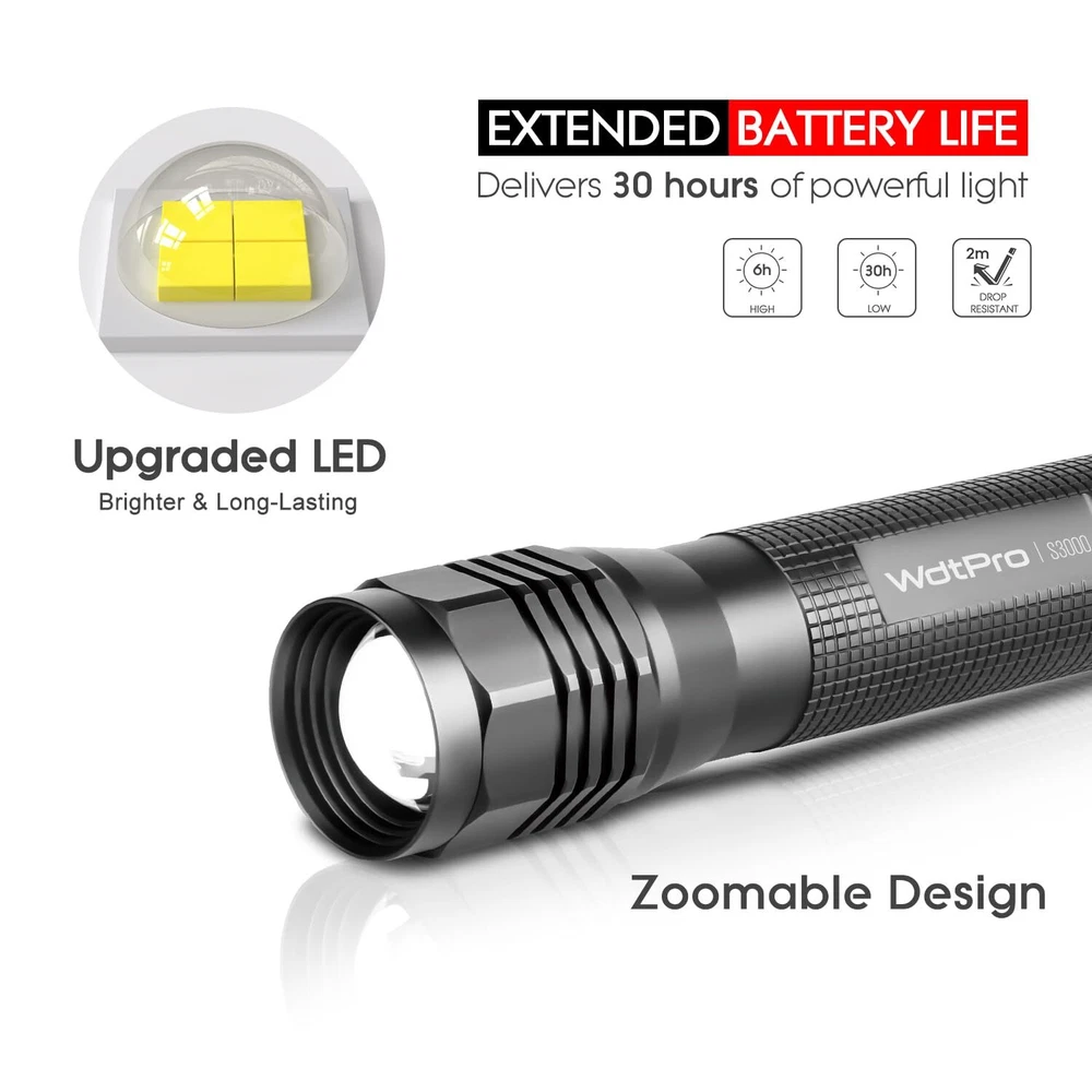 High Lumen LED Flashlight This powerful and durable, mid-size general purpose flashlight is the perfect gift for a father or husband, for any occasion. It is high on power but still compact enough to fit well in your hands, backpack, survival kit, or glove compartment, perfect for camping, hiking, exploring, or even when taking the kids out trick-or-treating. TACTICAL FLASHLIGHT FEATURES Heavy and Solid Construction, promising long-time durability Use OSRAM P8 LED to ensure excellent brightness and over 50,000 hours of use 3 Modes: High / Low / Strobe, easy to operate Easy to adjust the beam from broad to narrow Powered by 4 Standard AA Batteries (Not Included) The aluminum housing with Type II Military Spec anodizing helps make the flashlight extremely durable and abrasion resistant IP67 waterproof, shines even when in heavy raining or 1m submersible for 30 minutes PACKAGE CONTENTS 1x Tactical Flashlight 1x AA Battery Holder (Batteries are not included) 1x User Manual 1x Warranty Card About is dedicated to manufacturing products that use top quality materials and creative designs. We strive to provide the best lighting experience to customers from all over the world. To ensure maximum satisfaction, all our products are strictly inspected at every step. If you are not 100% satisfied with the purchase for any reason, don't hesitate to contact us to request a refund or replacement. 【BRIGHTEST FLASHLIGHT】 With high power LED, the S3000 provides up to 1600 real lumens(Max) but only need 4 * AA batteries (battery not included). This mid-size flashlight is high on power but still compact enough to fit in your hands, backpack, survival kit, or glove compartment 【LONG-LASTING LIGHTING TIME】 Flashlight feature the PDO technology for extreme brightness, providing up to 30 hours (low light mode) of continuous running time, or 6 hours (powerful high light mode) without overheating. Lighting time is twice that of regular tactical flashlights. Lifespan is up to 50000 hours 【3 MODES & ZOOMABLE】 Simply rotating this flash light in or out for a spot light or as flood light; It features only 3 light modes (High / Low / Strobe) which effectively reduces the trouble of switching 5 modes. All for the best using experience 【WATERPROOF & TOUGH】Led flashlight is built with IP67 waterproof, now you can stop worrying about unexpected weather rain or snow. Its enduring, anodized machined aluminum construction promises long-time durability, no matter where you go, best flash light for camping, hiking, emergency situations 【100% SATISFACTION】 Includes a high lumens flashlight. You’ll be pleasantly surprised at the brightness, quality, durability and performance or we will refund your money no questions asked. 90 days money back & 2 years replacement guarantee. Buy with confidence