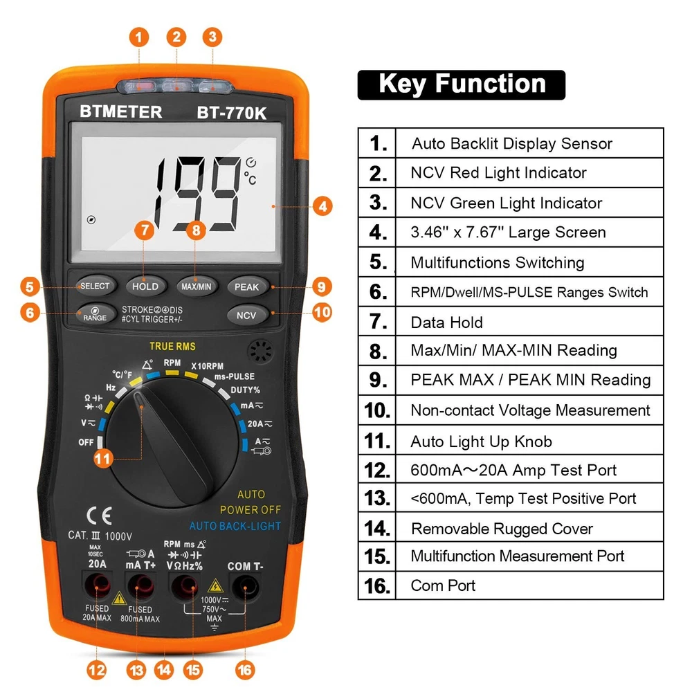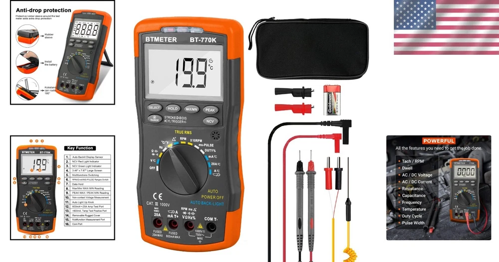 High-Precision Automotive Multimeter with Auto Backlight and Carry Case Included ‹ › ‹ › ‹ › ‹ › ‹ › ‹ › ‹ › ‹ › ‹ › High-Precision Automotive Multimeter Unlock the full potential of your automotive diagnostics with our state-of-the-art High-Precision Automotive Multimeter, designed specifically for mechanics and DIY enthusiasts. Key Features: Comprehensive Measurement Capabilities: Measure AC/DC Amperage up to 20A, AC/DC Voltage from 750V to 1000V, Ohm values up to 60MΩ, and Capacitance to 60mF. Temperature & Frequency: Temperature range from -4 to 1832℉ and Frequency measurement capability up to 9.999MHz. Versatile Testing Functions: With functions for Duty Cycle, Cylinder Switchable (3/4/5/6/8), Pulse Width (0.1ms~10.0ms), and 600~12000RPM Tachometer and Dwell Test. High Accuracy: Features a 6000 counts multi-tester with PEAK Hold on MAX/MIN, Diode & Continuity Test, NCV, and AC True RMS measurement. Large LCD Display: Equipped with a 3.0 inch LCD display with 20mm characters and Auto backlight sensor for easy reading in low light conditions. Benefits: Hands-Free Operation: Magnetic attachment, hanger, and kickstand for free use of hands during testing. Smart Features: Automatic zero adjust, overload protection on all ranges, and auto shutdown after 15 minutes of inactivity for battery efficiency. Temperature Measurement Made Easy: Comes with a thermocouple for precise temperature control and measurement. Everything You Need: Comes with a zipped carry case to organize all accessories neatly while providing lifetime tech support and a 12-month warranty. Why Choose Our High-Precision Automotive Multimeter? In the world of automotive repairs, precision matters. Our High-Precision Automotive Multimeter not only measures a wide range of electrical parameters but also offers unmatched convenience and versatility for any mechanic or DIY enthusiast. Its robust features, hands-free capabilities, and easy-to-read display make it an indispensable tool for diagnosing vehicle issues accurately and efficiently. Upgrade your toolkit and ensure exceptional quality and durability—order your High-Precision Automotive Multimeter today! Shipping Free & Fast Shipping - We offer free shipping to most of the USA with a normal delivery time of 3-7 days. However, due to the current situation, additional delivery time (up to 3 weeks) may be required for some items. Alternative Carriers - We may use alternative carriers (e.g. USPS, FedEx, UPS, etc.) to ensure your package arrives safely and on time. Due to the use of multiple carriers, we are unable to provide a tracking number automatically. Handling Time - Orders are processed and shipped within 1-2 business days of receiving cleared payment. Shipping Restrictions - Shipping to Alaska, Hawaii, Puerto Rico, Guam, and other US territories may incur shipping charges or delivery restrictions. Please contact us before ordering, or your order can be refunded/cancelled. State Restrictions - There may be restrictions based on your state of purchase. For example, certain items may not be shipped to California due to state regulations. Contact for Tracking Updates - If you require tracking updates or have any concerns about the delivery of your order, please feel free to contact us, and we will be happy to assist you. Return 30-Day Hassle-Free Returns - We want you to be completely satisfied with your purchase. If you are not, you can return the item within 30 days of receiving it for a full refund or exchange. Easy Return Process - To start a return, simply contact us and we will provide you with a prepaid return shipping label and detailed instructions. Restocking Fee - There are no restocking fees for returns. However, the buyer is responsible for return shipping costs if the return is not due to a seller's error. Refund Processing Time - Refunds will be processed within 5 business days of receiving the returned item in its original condition. Payment We accept all major credit cards, PayPal, and Apple Pay for your convenience. Your payment information is secure and encrypted to ensure a safe and seamless transaction. Please complete your payment within 3 days of purchase to avoid any delays in shipping. Feedback Your feedback is extremely important to us. We strive to provide the best products and customer service possible. If you are satisfied with your purchase, please take a moment to leave us a positive review. If you have any concerns or issues with your order, please contact us before leaving negative feedback. We are committed to resolving any problems and ensuring your satisfaction. Contact Us If you have any questions or concerns, please feel free to reach out to our customer support team. You can contact us through the eBay messaging system. We are available Monday to Friday, 9:00 am to 5:00 pm EST, and we will do our best to respond to your inquiry within 24 hours. Thank you for supporting our small family business! MPN: Automotive_Multimeter UPC: Not Set Number of Counts: 6000 Maximum Input Voltage: 1000V AC Voltage Range: 750V DC Voltage Range: 1000V Current Range: 20A Resistance Range: 60MΩ Unit Quantity: 1 Features: Auto Power Off,Backlight,Data Hold,True RMS,Diode Test,Continuity Test,Overload Protection,PEAK Hold,Automatic Zero Adjust Test/Measurement Functions: AC Current,AC Voltage,Capacitance,Continuity Test,DC Current,DC Voltage,Diode Test,Duty Cycle,Frequency (Hz),Resistance,Temperature,Tachometer,Dwell Test Input Protection Features: Overload Protection Protection Against Liquids: Not Protected Protection Against Solids: Not Protected Brand: Unbranded Display: Digital Form Factor: Handheld Measurement Category: CAT II IP Rating: Not Rated Country/Region of Manufacture: Not Set Unit Type: oz