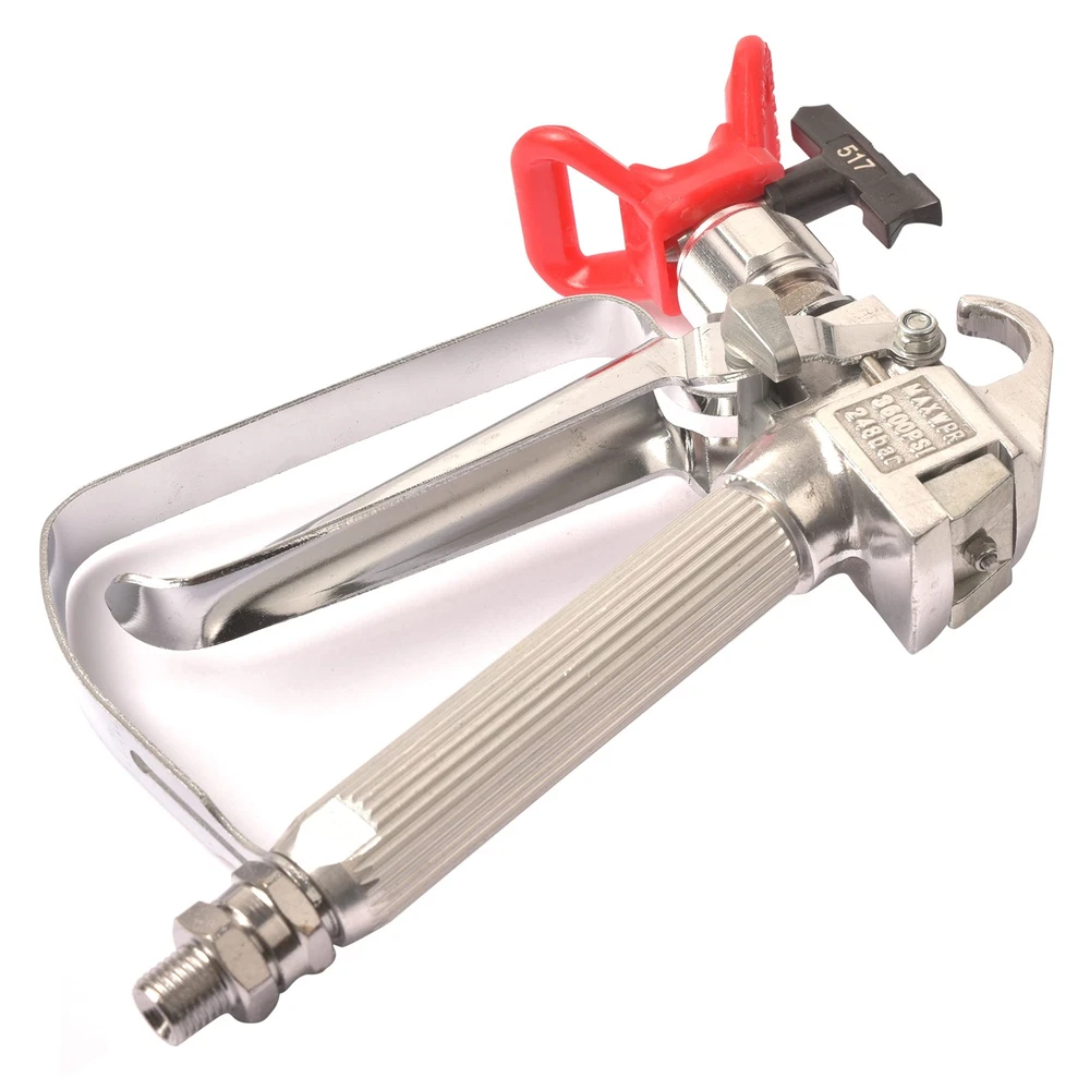 It is for use with any airless paint sprayer,such as magnum Graco Wagner and Titan paint sprayers. This spray handle is ideal for homeowners for spraying a variety of coatings including primers,stains and varnishes. Featured a thumb engaged metal trigger lock, it allows you to lock the handle when not spraying for safety. Specifications: Main material: Aluminum,Color:Silver Max Operating Pressure: 3600 PSI Inlet: 1/4” Thread Outlet: 7/8” Thread Spray Tip Size: 517,Color: Black. Extension Bar Size:10 IN. Trigger Configuration: Four Finger Trigger Wight: 1.5 lbs Dimension: Handheld Sized Package: 1 x Airless Spray Gun 1 x 517 Tip 1 x Tip Guard 1 x Extension Bar 3600 PSI Maximum Pressure, four-finger trigger, soft pull. Reversible 517 Tip, Universal Tip Guard. Forged Gun Head, 100 mesh gun filter inside. Built-in hose swivel to reduce hose twists. With a 10 inch extension bar, it is easy to get close to the location needed for spraying and reduce your labor intensity.