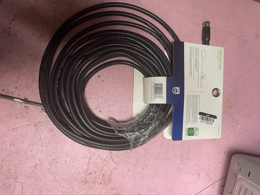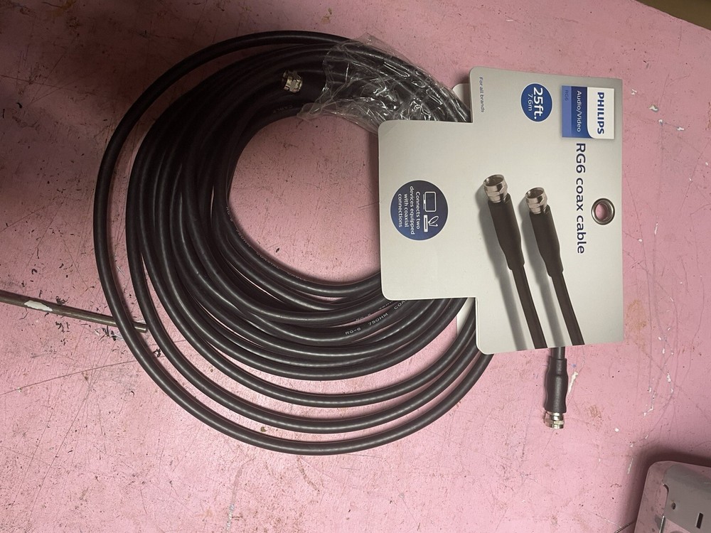 The product is a 25 ft Philips coaxial cable designed for TV, video, and audio connections. It features a round cable design and is sold as a single unit. It falls under the category of consumer electronics, specifically TV and video accessories, such as video cables and interconnects.
