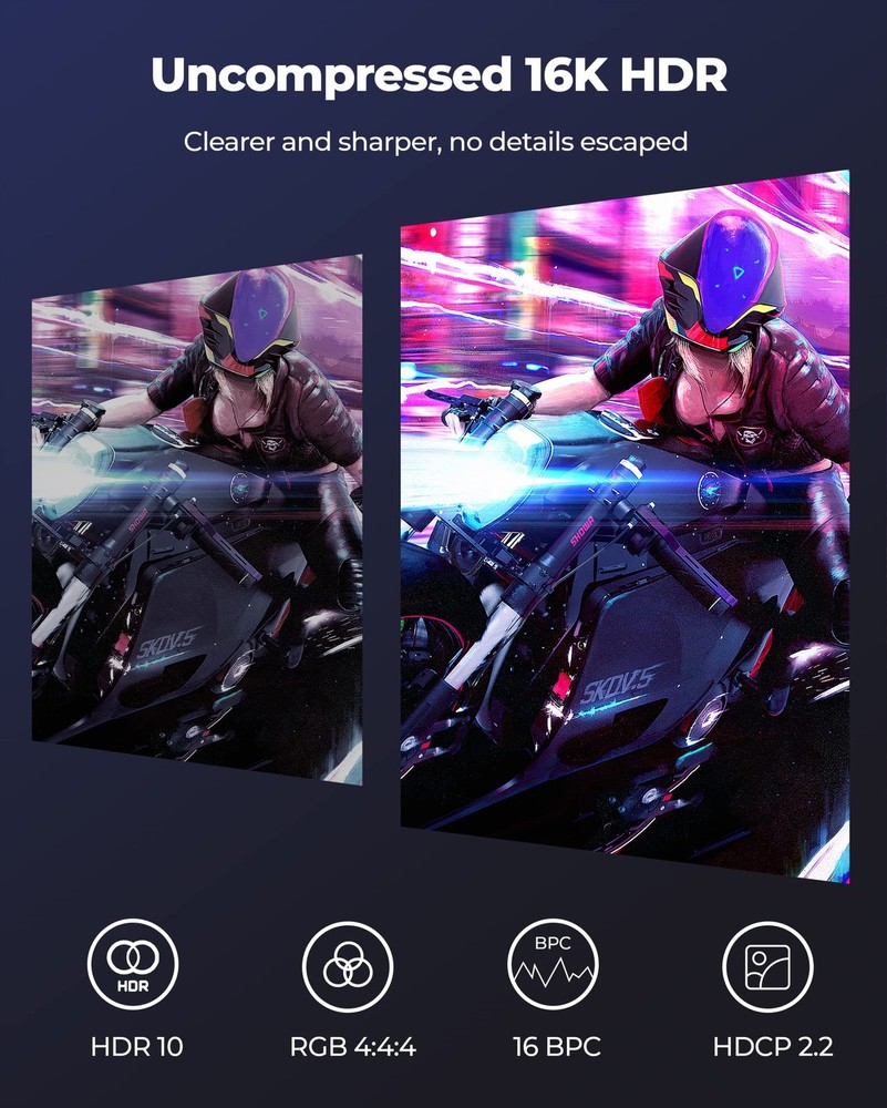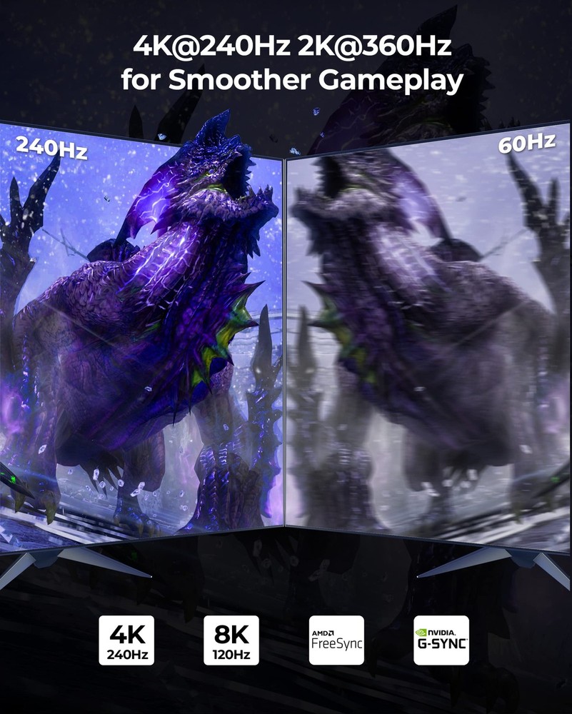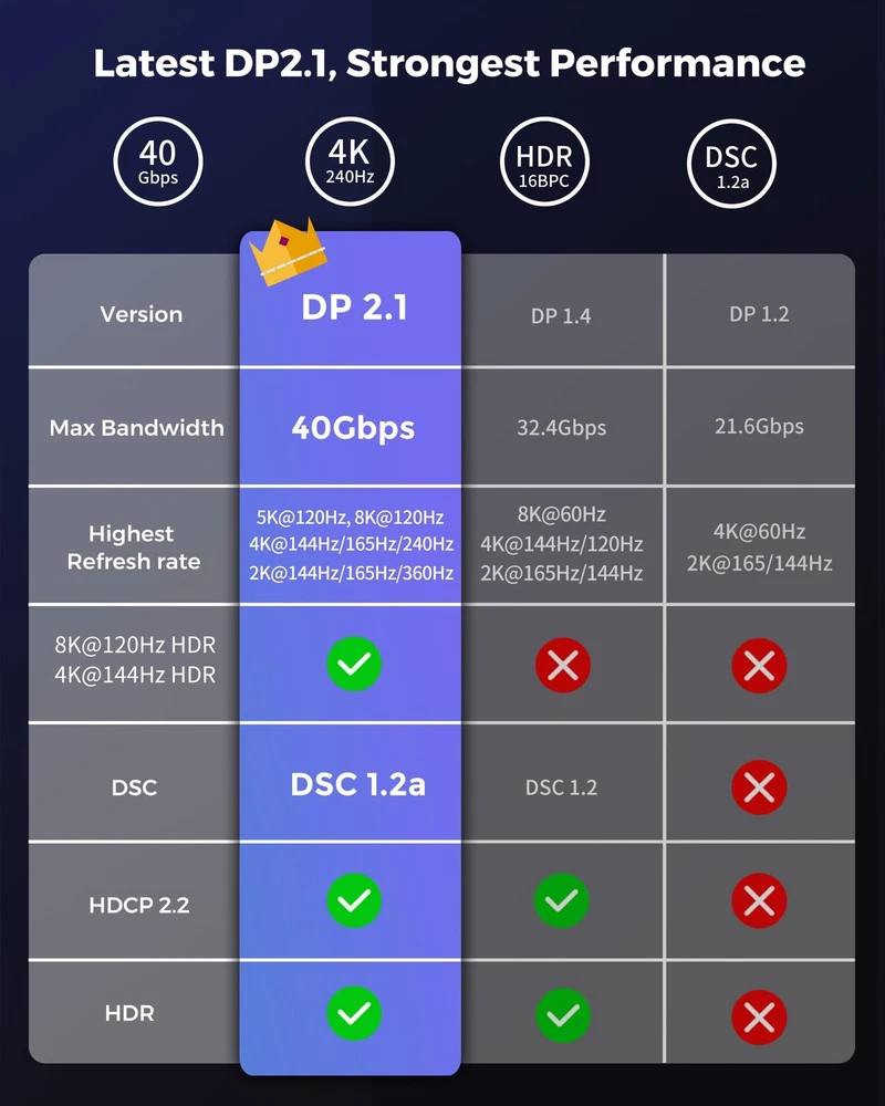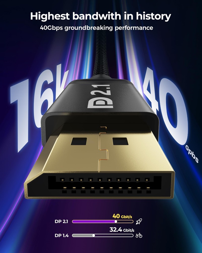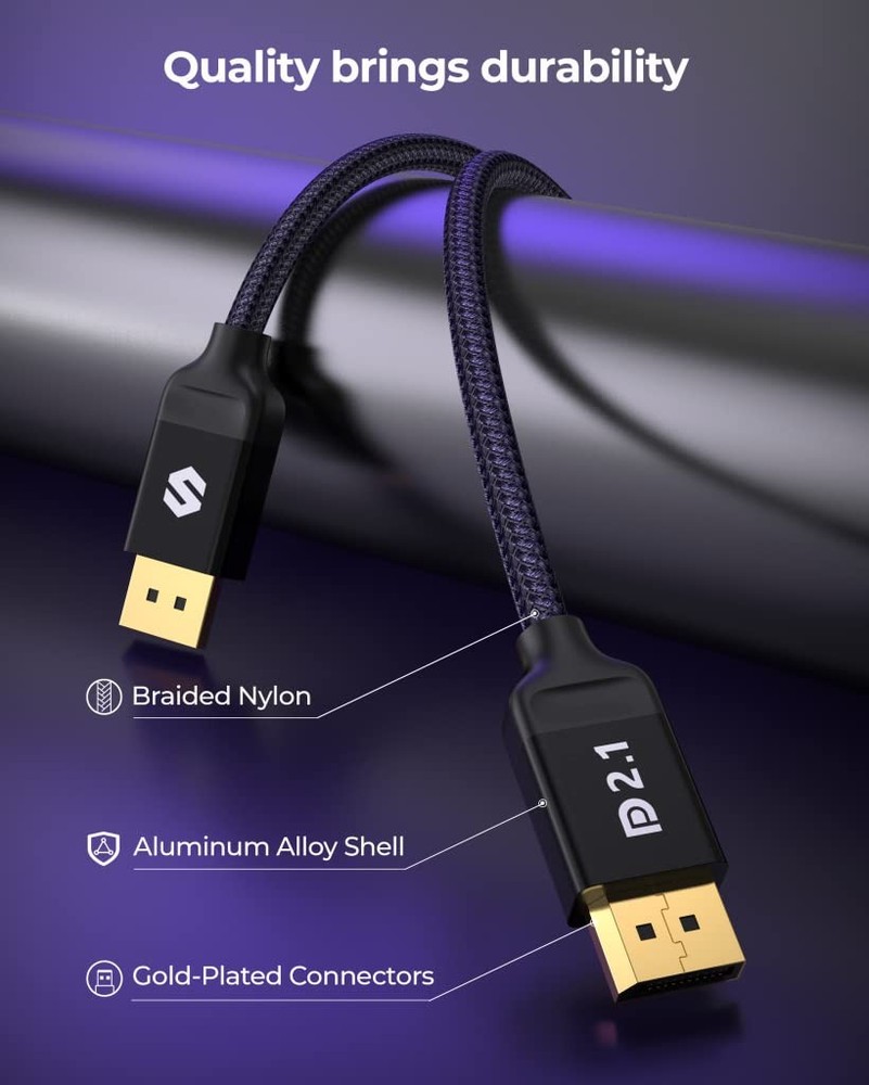 's 8K DisplayPort Cable 2.1/2.0 is VESA certified, supporting high resolutions like 16K@60Hz (with DSC), 8K@120Hz, 4K@240Hz/165Hz/120Hz/144Hz, and 2K@360Hz. Designed for gamers seeking the best. With 40Gbps bandwidth, HBR3, and DSC 1.2a, it outperforms 4K/8K DP cables. Experience enhanced visuals through Dynamic HDR and immersive 32-bit audio for FPS and AAA games. 10x more durable than PVC cables. The double nylon braided cable and 24K gold plated connectors provide artifact-free and synchronized audio/video transmission. Say goodbye to accidental damage and enjoy a seamless experience. We are committed to standing by your side throughout your purchase journey. That's why we offer a lifetime customer support service. If you experience any issues or wire failure, simply reach out to our dedicated customer service team. 【16K DisplayPort Cable 2.1】8K Displayport Cable 2.1/2.0 supports high resolutions 16K(15360*8640)@60Hz with DSC, 8K@120Hz, 4K@240Hz/165Hz/120Hz/144Hz, 2K@360Hz. 16K DP 2.1 Cable certified by the VESA Association. Supports Dynamic HDR, HDCP 2.2, DSC1.2a. Backwards compatible with DisplayPort 2.0 1.4 1.3, 1.2, 1.2a, 1.1 and 1.0. Support flawless audio pass-thru for uncompressed digital audio channels at 7.1, 5.1 and 2.0. Support 3D stereo imaging technology 【Ultimate Gaming Experience】's 16K displayport cable is designed for gamers seeking the best. With 40Gbps bandwidth, HBR3, and DSC 1.2a, it outperforms 4K/8K DP cables. Experience enhanced visuals through Dynamic HDR and immersive 32-bit audio for FPS and AAA games. Enjoy multi-screen gaming with MTS multi-stream transmission. This all-in-one DisplayPort cable sets the bar for the next decade 【Ergonomic Design & Anti-Interference】DP Cable features a sleek, buckle-free and groove design for added protection and easy removal in tight spaces. The 28AWG tinned copper conductor with triple shielding ensures high resistance to EMI interference. 10x more durable than PVC cables. The double nylon braided cable and 24K gold plated connectors provide artifact-free and synchronized audio/video transmission. Say goodbye to accidental damage and enjoy a seamless experience 【Wide Compatibility】Our DisplayPort to DisplayPort cable (2.1/2.0) ensures a direct connection between DisplayPort-enabled devices. It is compatible with popular monitors like Odyssey G7/G9, CHG90, CRG9, and brands such as BenQ, iiyama, Alienware, and more. Works seamlessly with leading graphics cards like 4090, 4080ti, 4070ti, 3090, and 7900XTX. Supports DP, DP++, DisplayPort++, G-Sync, FreeSync, and Adaptive-Sync. Suitable for graphics cards and monitors with DisplayPort ports 【Lifetime Customer Support】At , we take pride in delivering top-notch cables and exceptional customer service. We are committed to standing by your side throughout your purchase journey. That's why we offer a lifetime customer support service. If you experience any issues or wire failure, simply reach out to our dedicated customer service team. We guarantee a prompt response within 12 hours, providing you with the necessary technical support to resolve any concerns